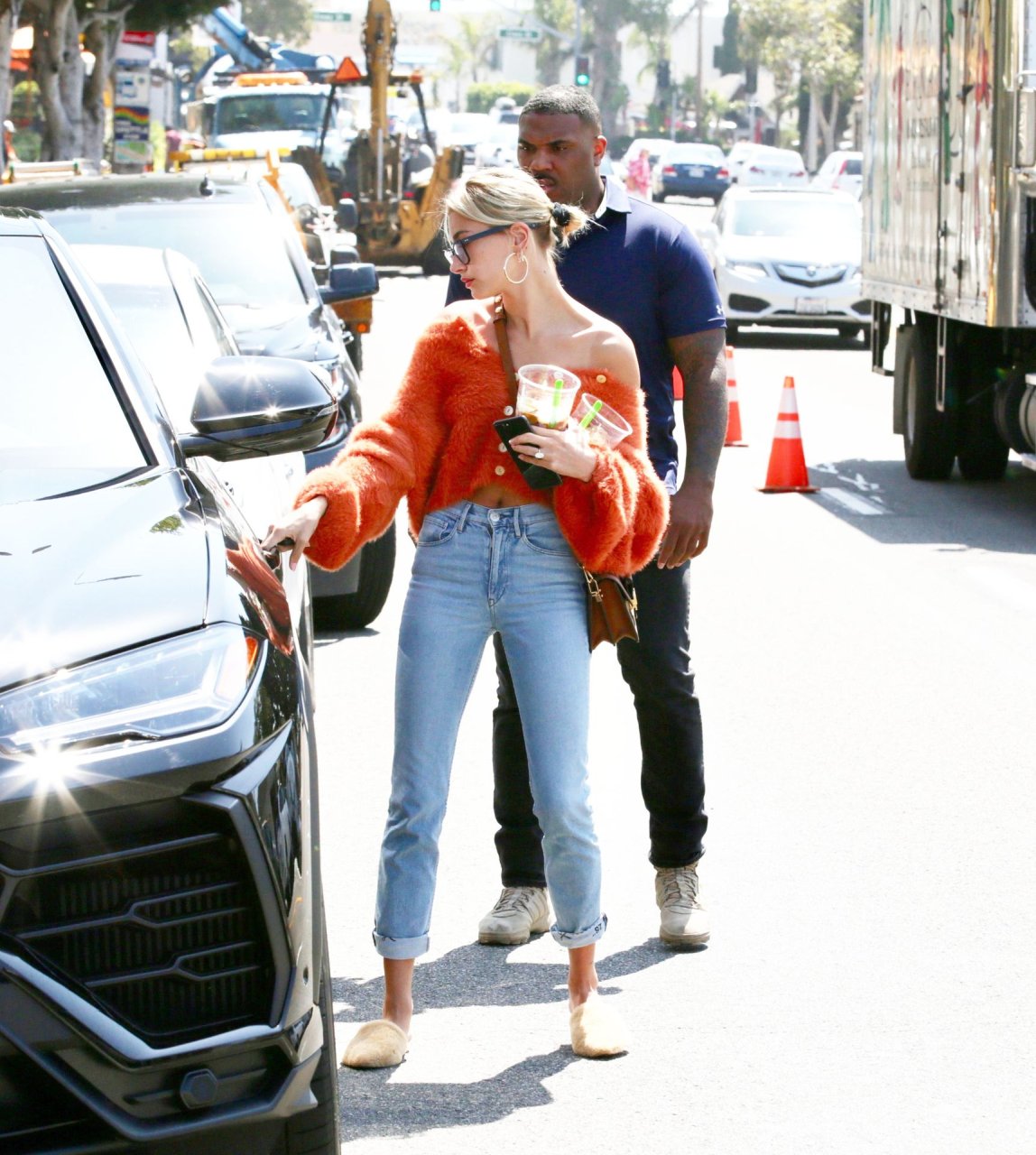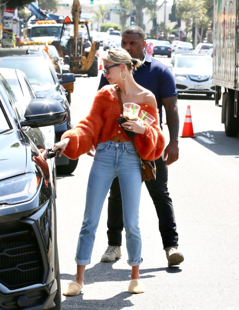 Hailey Baldwin si prende una pausa dal marito Justin Bieber per fare alcune commissioni e prendere un caffè freddo dopo essere tornata dalla South Bay a Los Angeles, 25/04/2019. La top model mette in mostra i suoi addominali perfetti, mentre va senza reggiseno con un maglione peloso arancione, corto e scollato sulle spalle, abbinato a jeans blu e ciabatte pelose neutre.