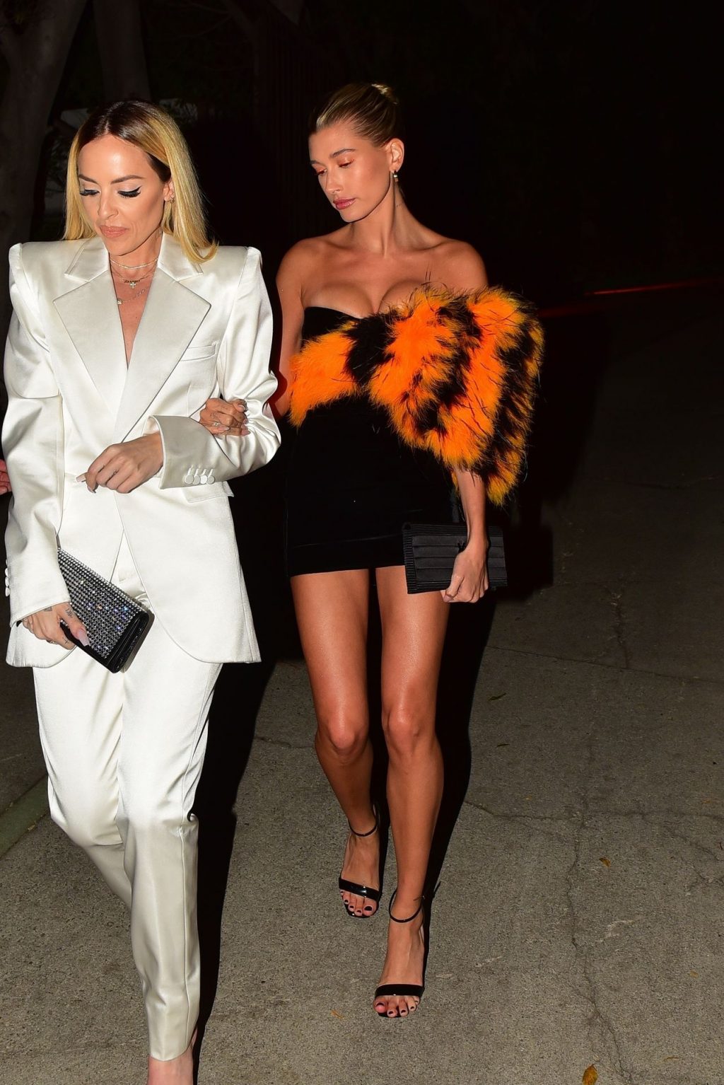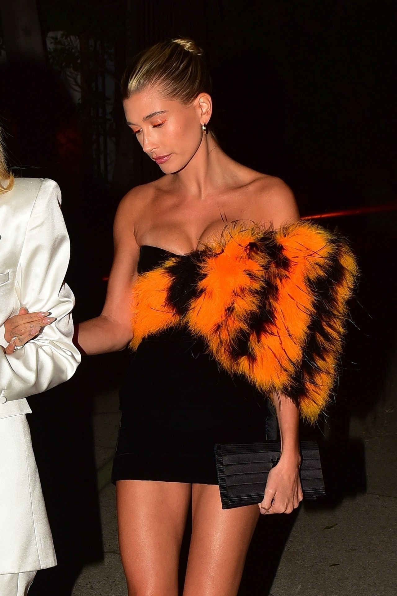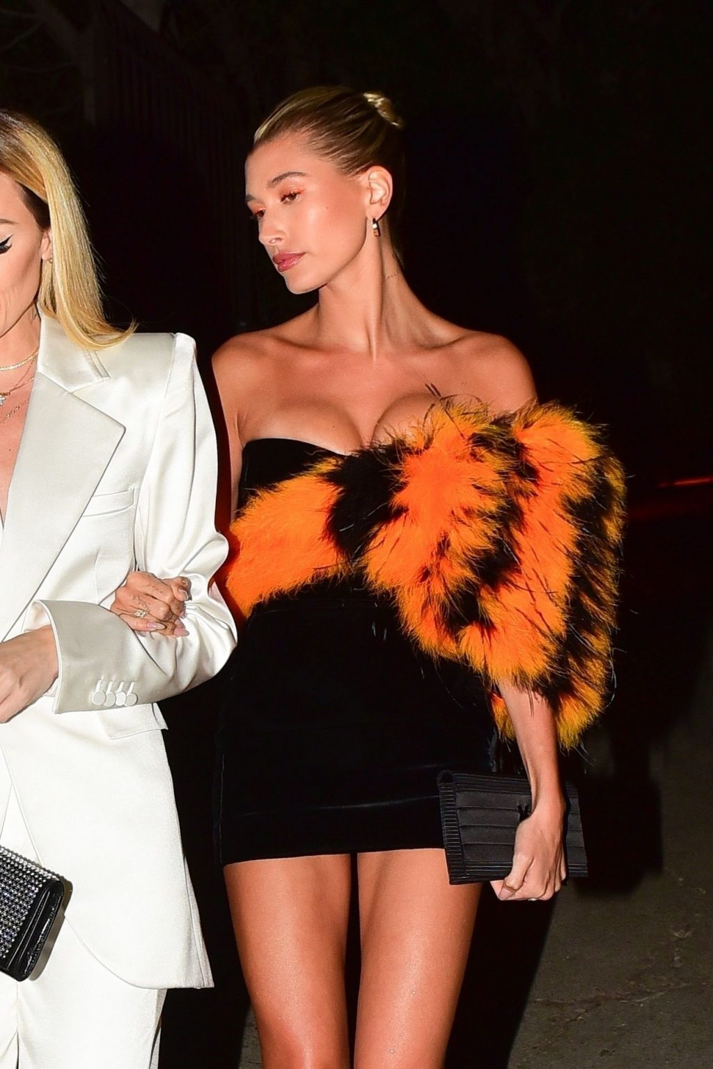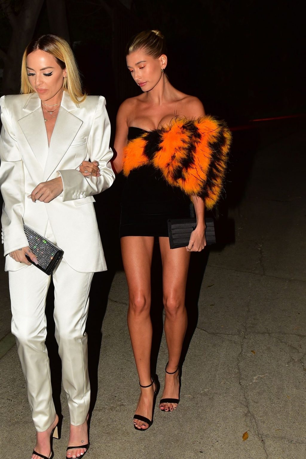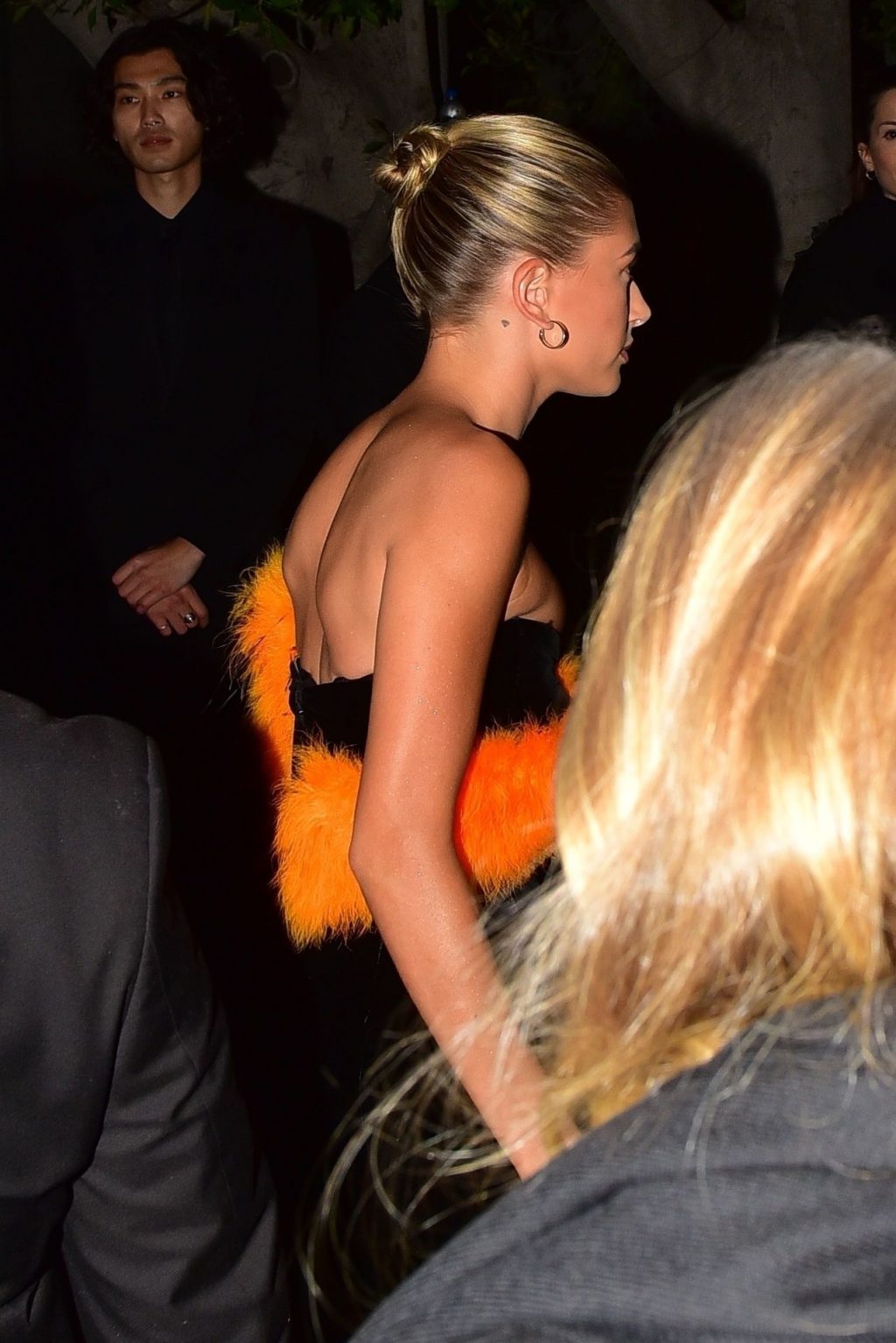 Hailey Bieber è sexy in un abito nero con dettagli arancioni arrivando alla festa YSL a Los Angeles, 01/04/2020.