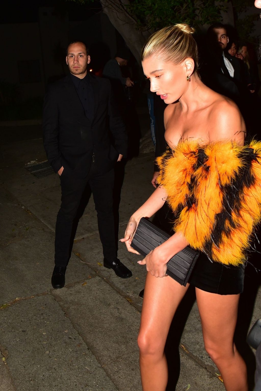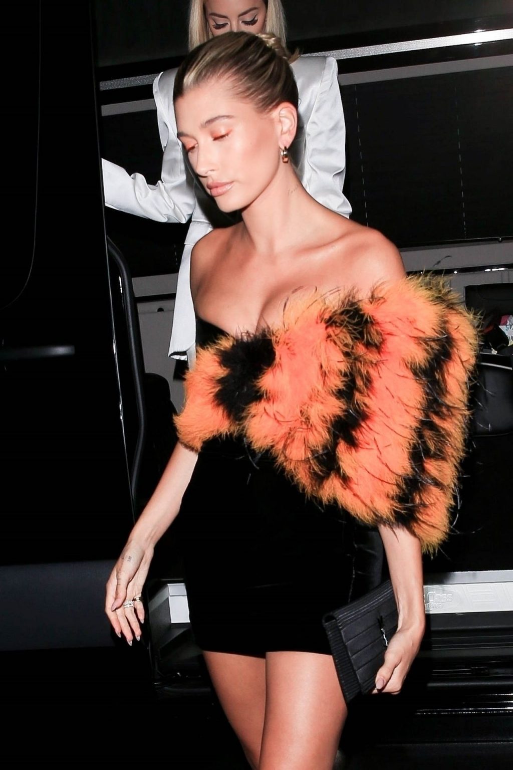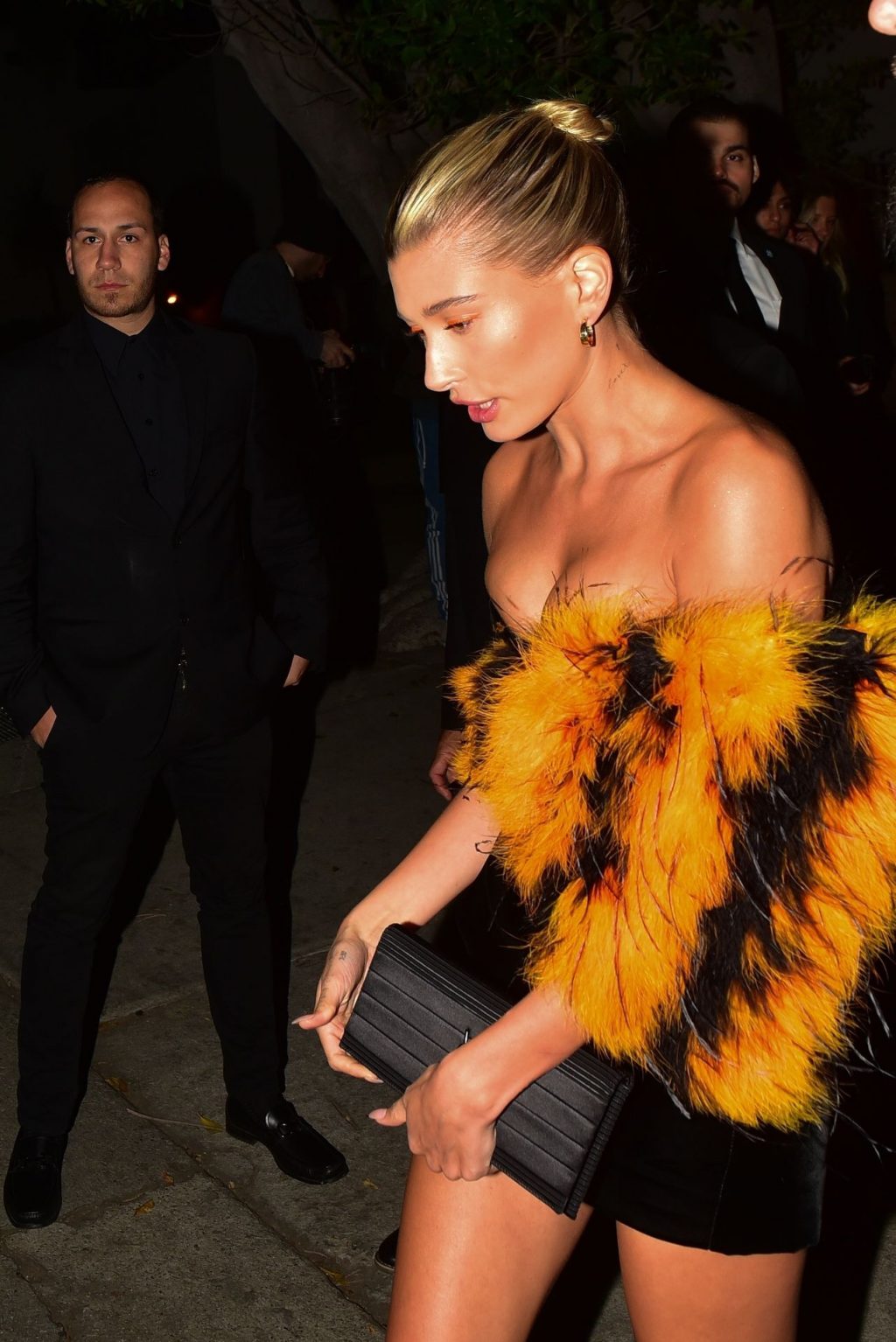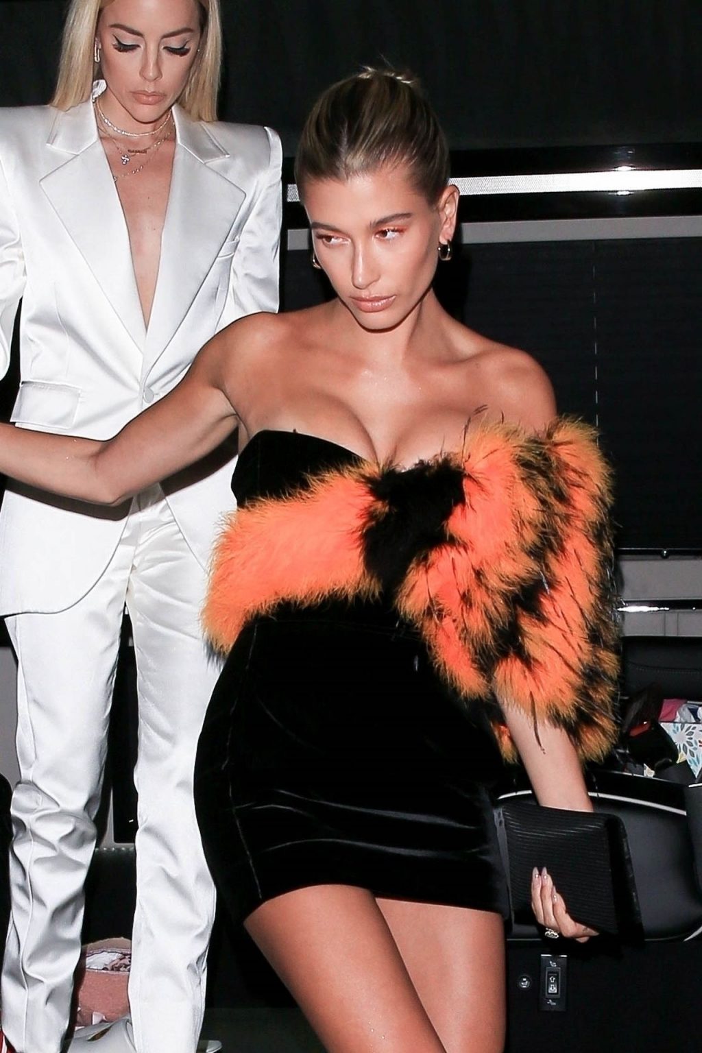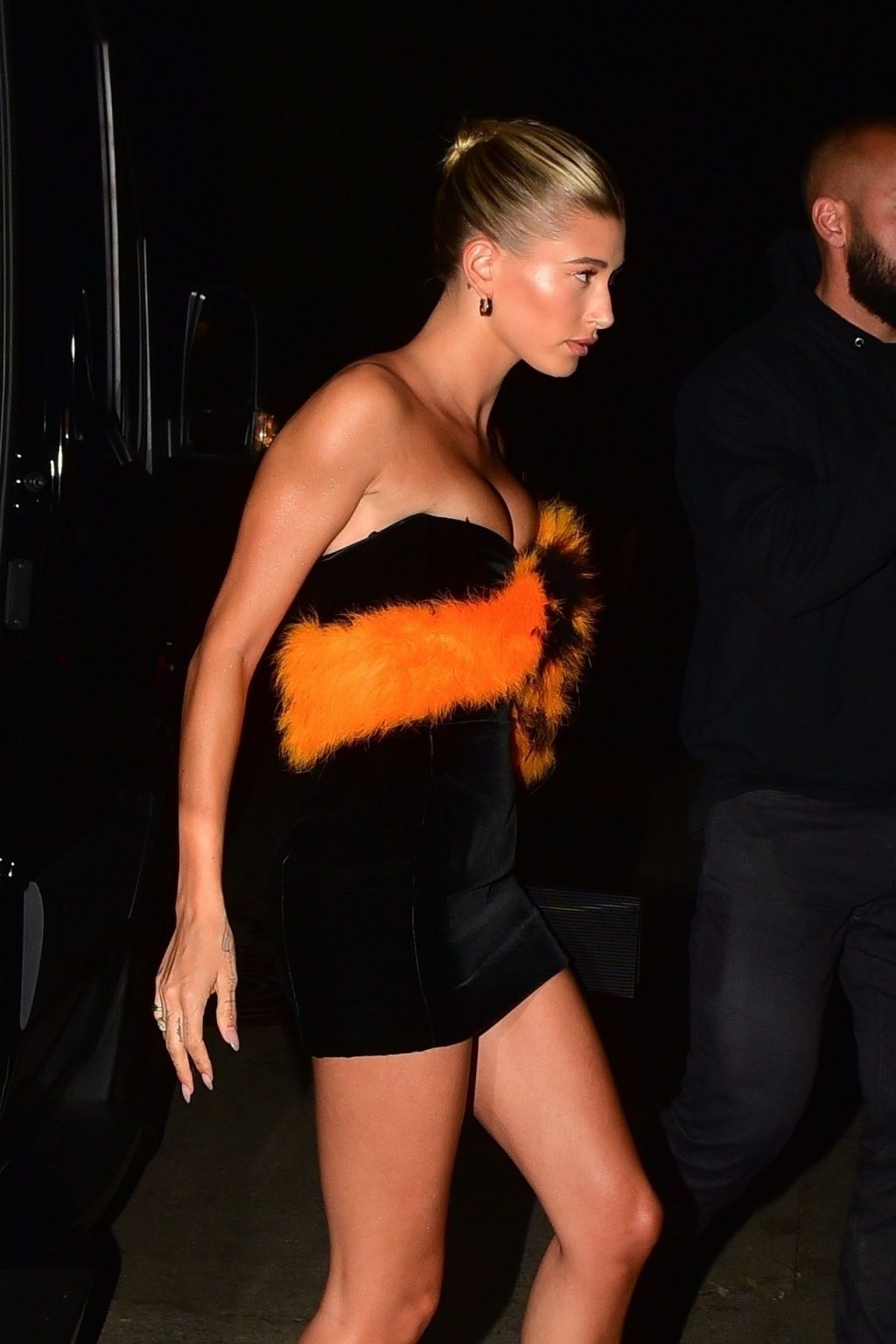 Hailey Bieber è sexy in un abito nero con dettagli arancioni arrivando alla festa YSL a Los Angeles, 01/04/2020.