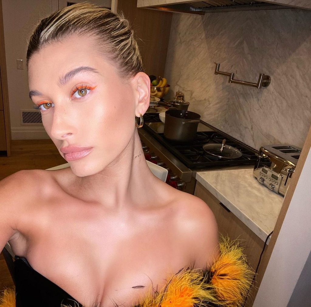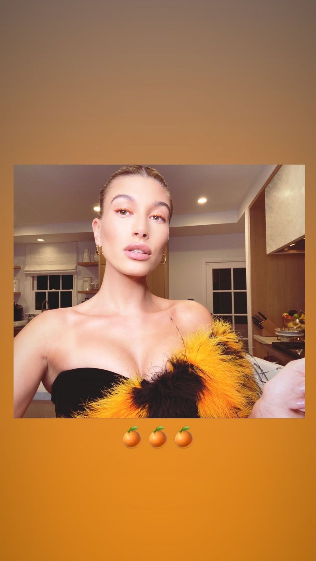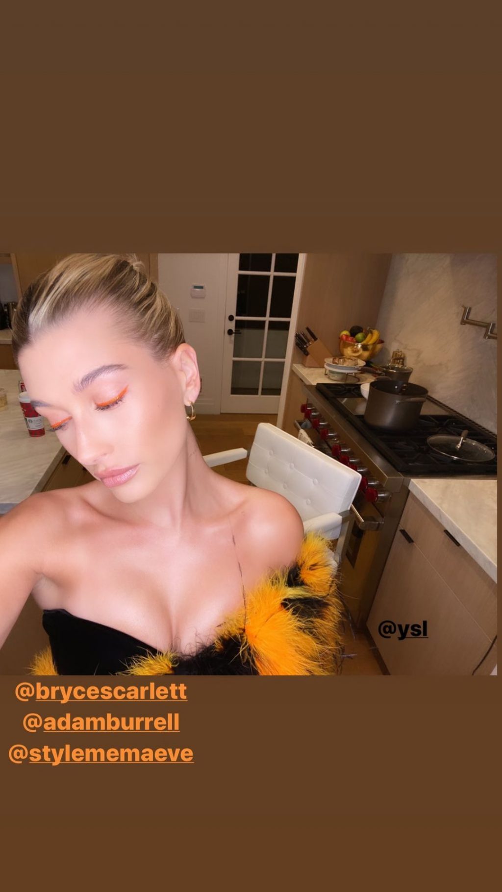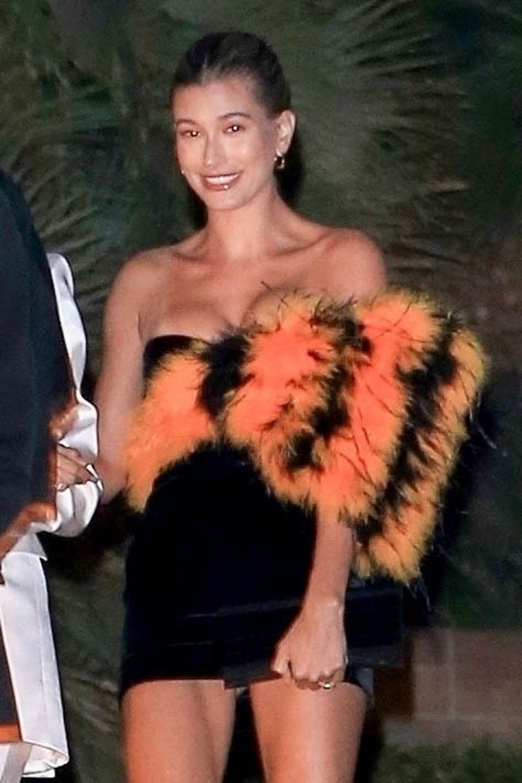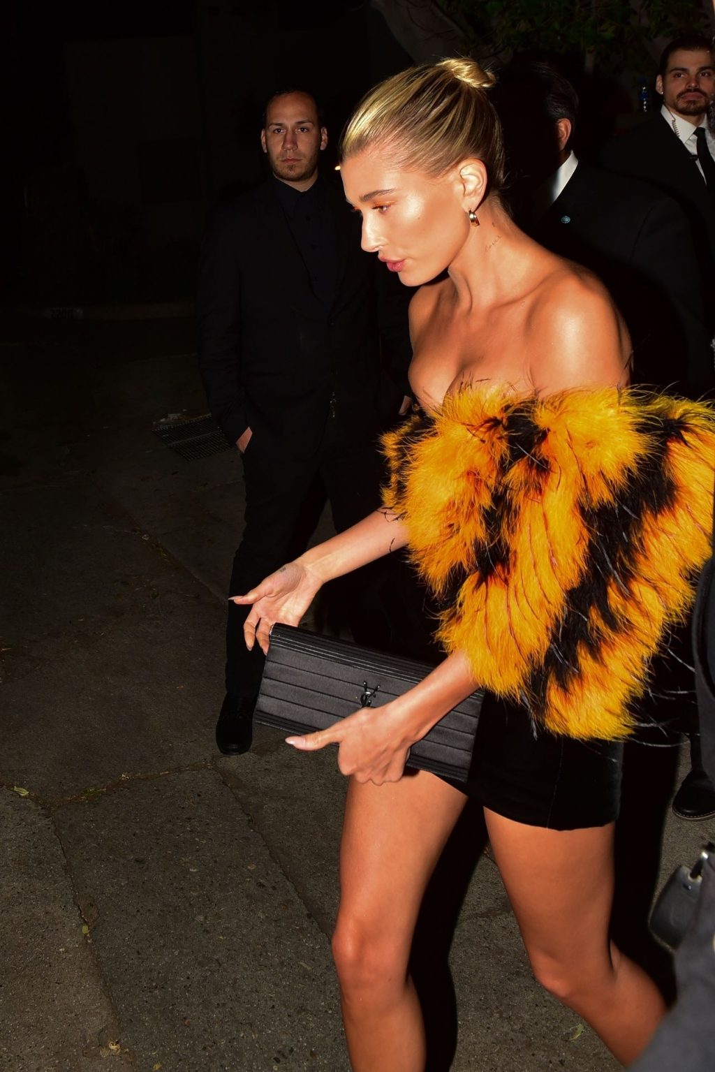 Hailey Bieber è sexy in un abito nero con dettagli arancioni arrivando alla festa YSL a Los Angeles, 01/04/2020.
