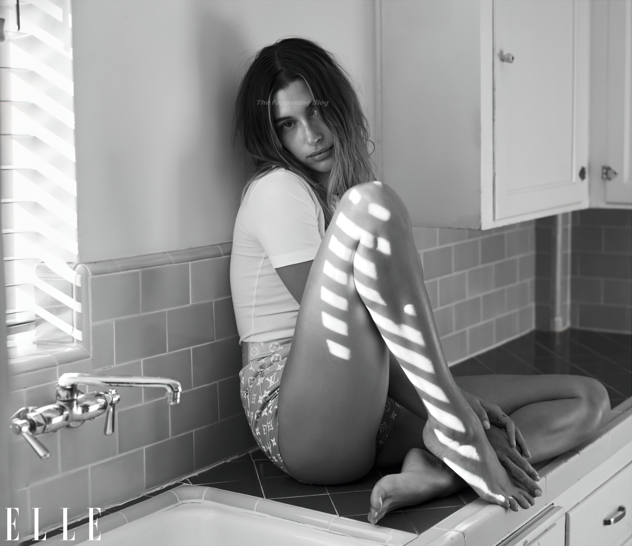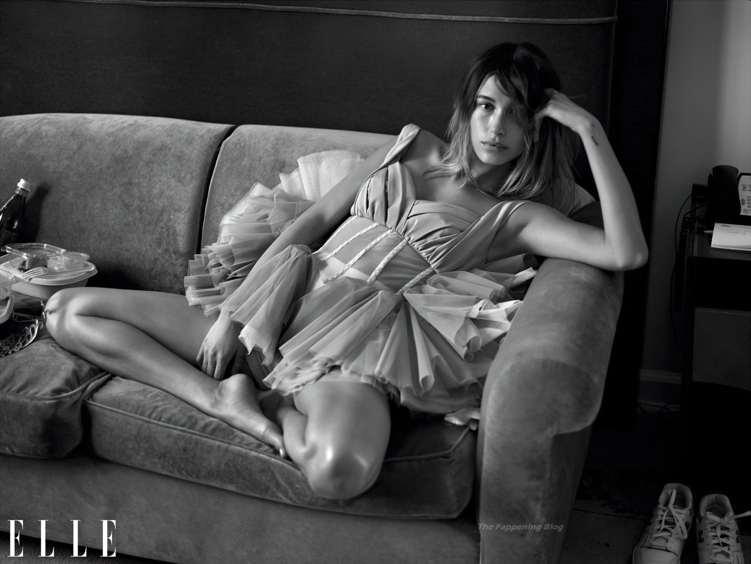 La modella americana Hailey Bieber (Baldwin) mostra le sue gambe snelle e la sua bellissima figura posando con vari bikini e abiti in un nuovo servizio fotografico di Mario Sorrenti per il numero di aprile 2021 di Elle Magazine.
