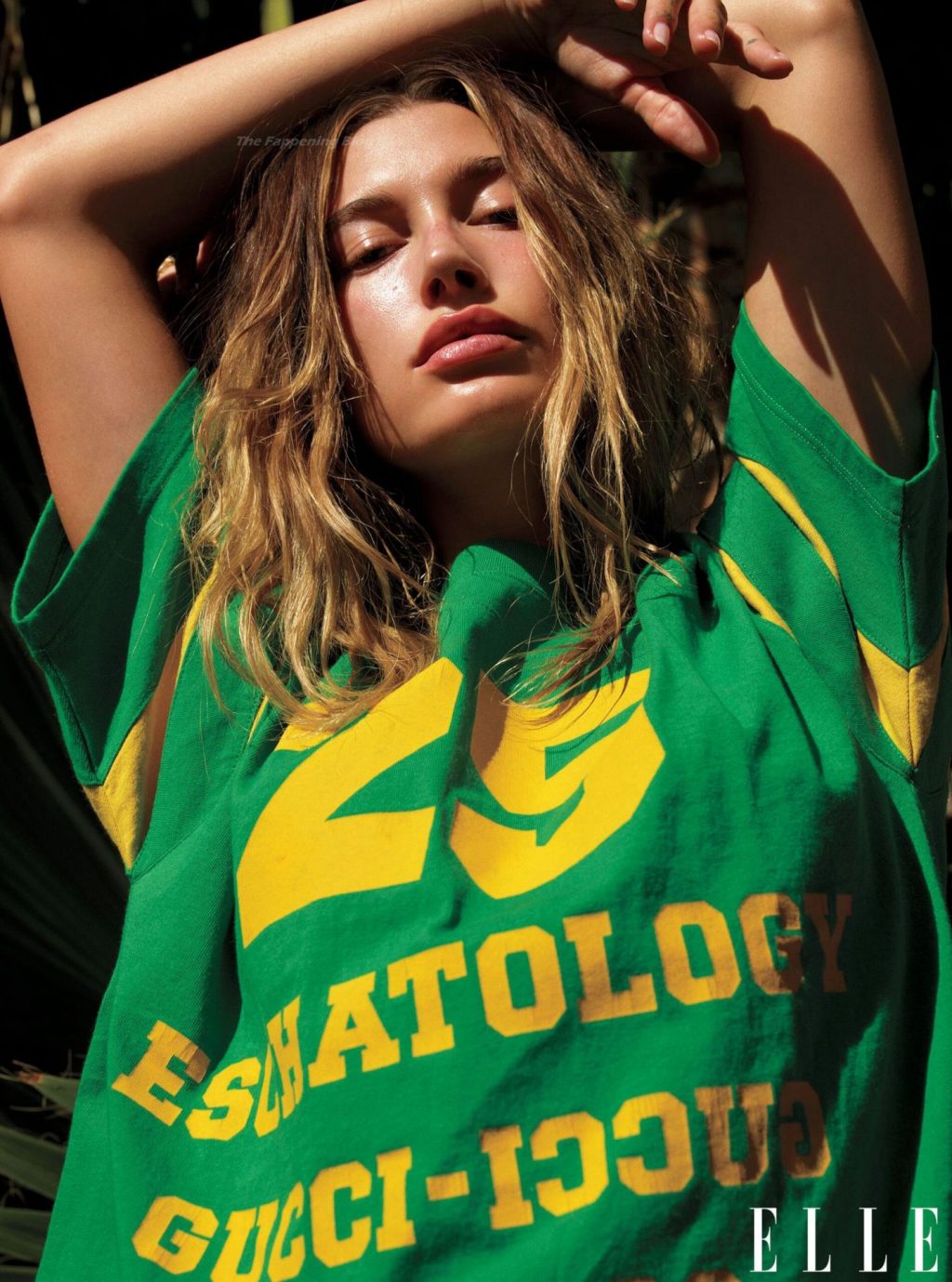 La modella americana Hailey Bieber (Baldwin) sfoggia la sua figura tonica mentre posa in un servizio fotografico di Mario Sorrenti per Elle USA, numero di aprile 2021.