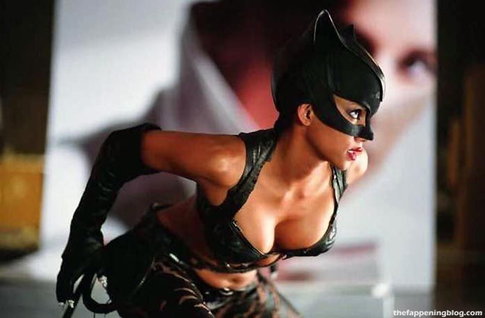 Halle Berry is sexy in tight leather pants and a top that shows lots of her cleavage. The camera is circling her while she walks across a rooftop. The scene is from the famous ‘Catwoman’ film.