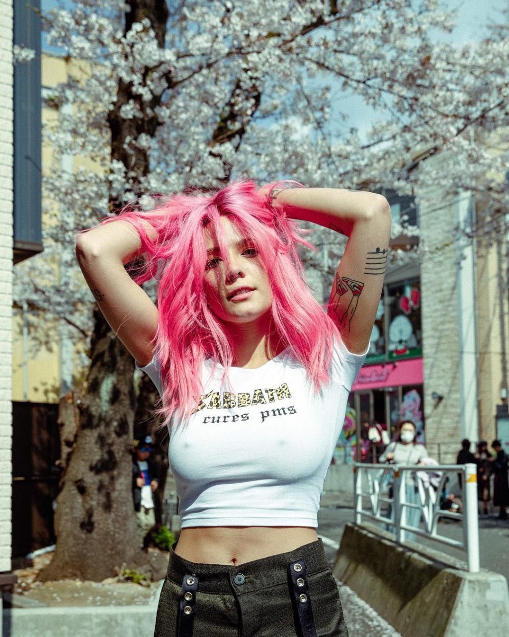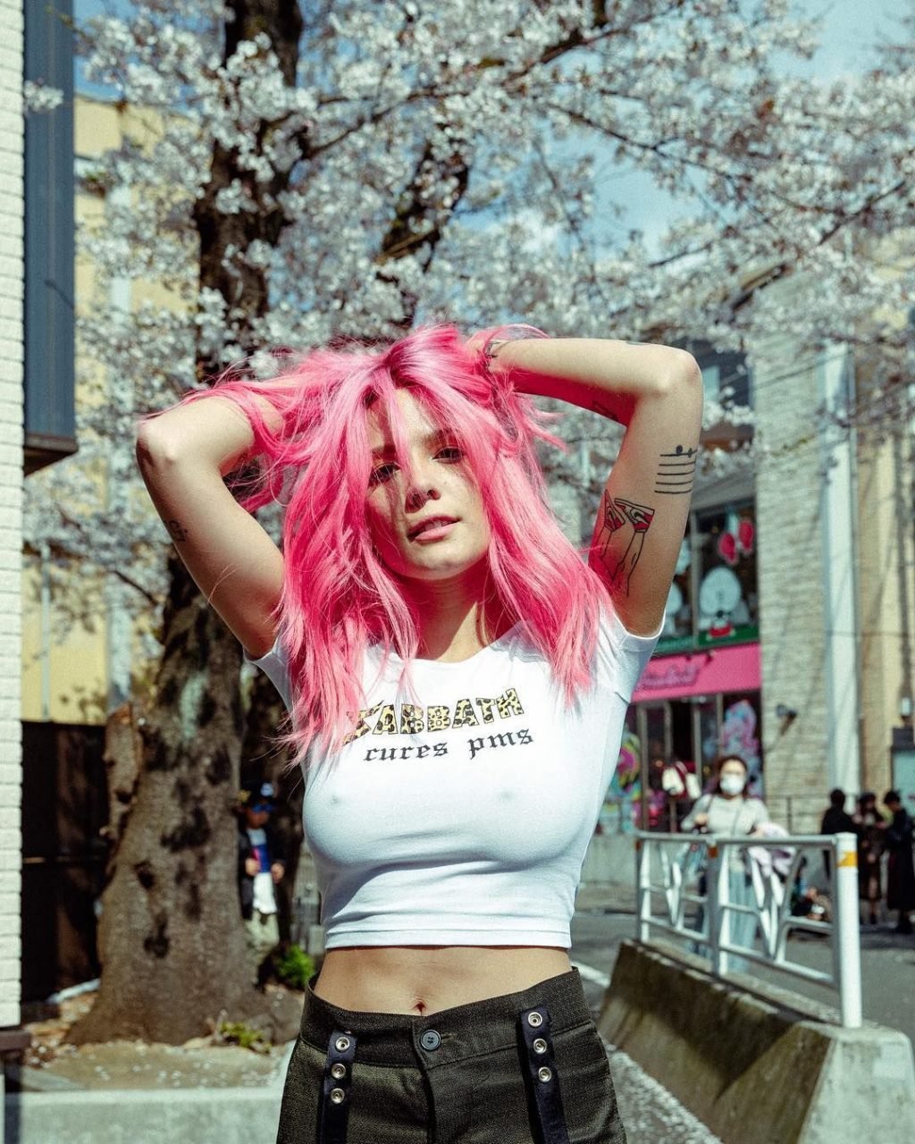 Sakura baby, la cantante Halsey mostra le sue curve indossando una maglietta bianca attillata con la scritta “Sabbath cures pms” in un servizio fotografico a Tokyo, Giappone, 31/03/2019.
