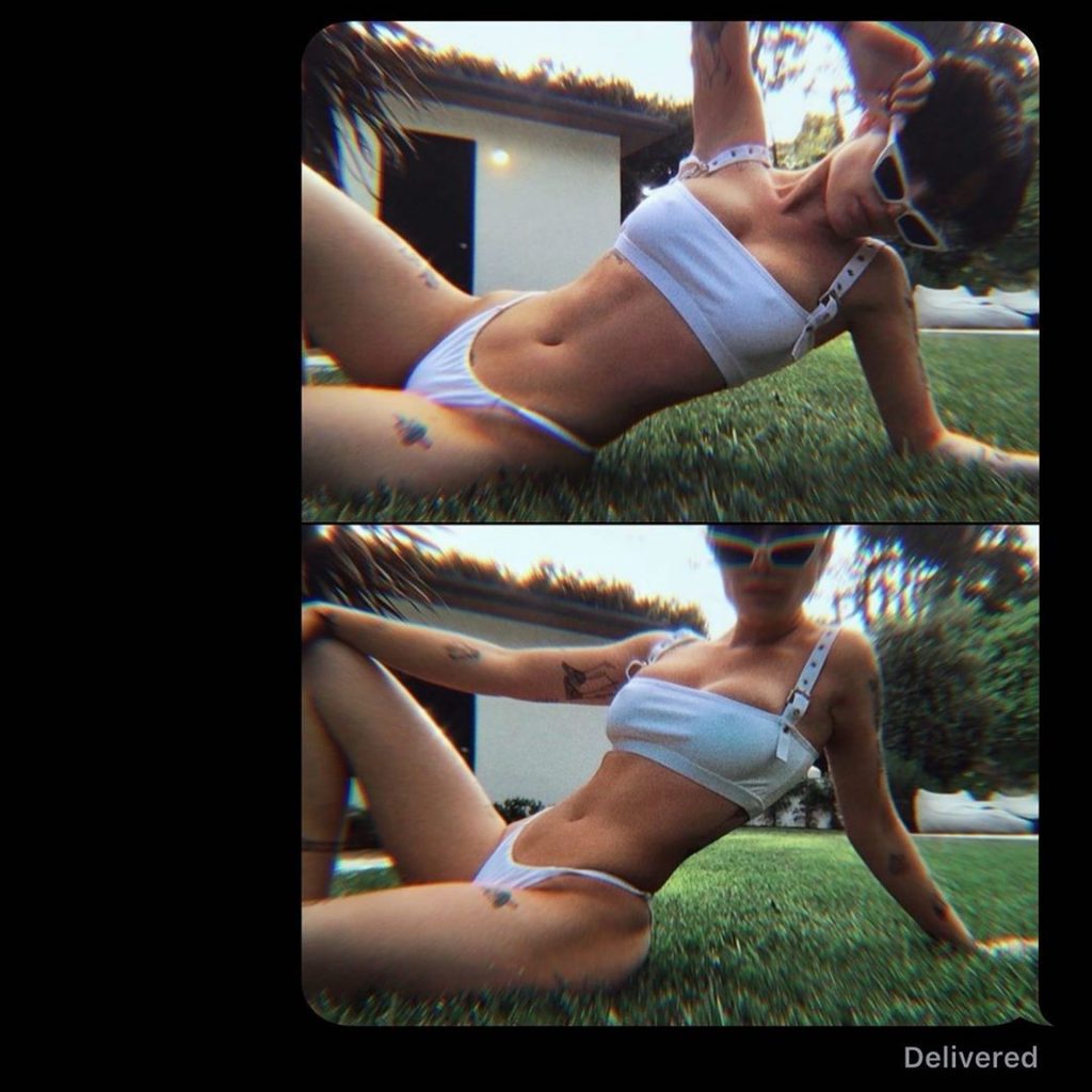 La cantante Halsey ritratta in queste foto sui social media delle celebrità, mostrando il suo seno in bikini – Instagram, 04/04/2020.