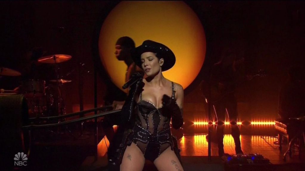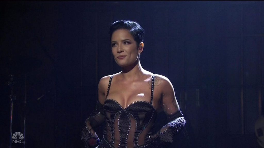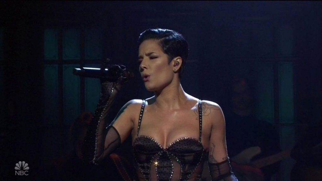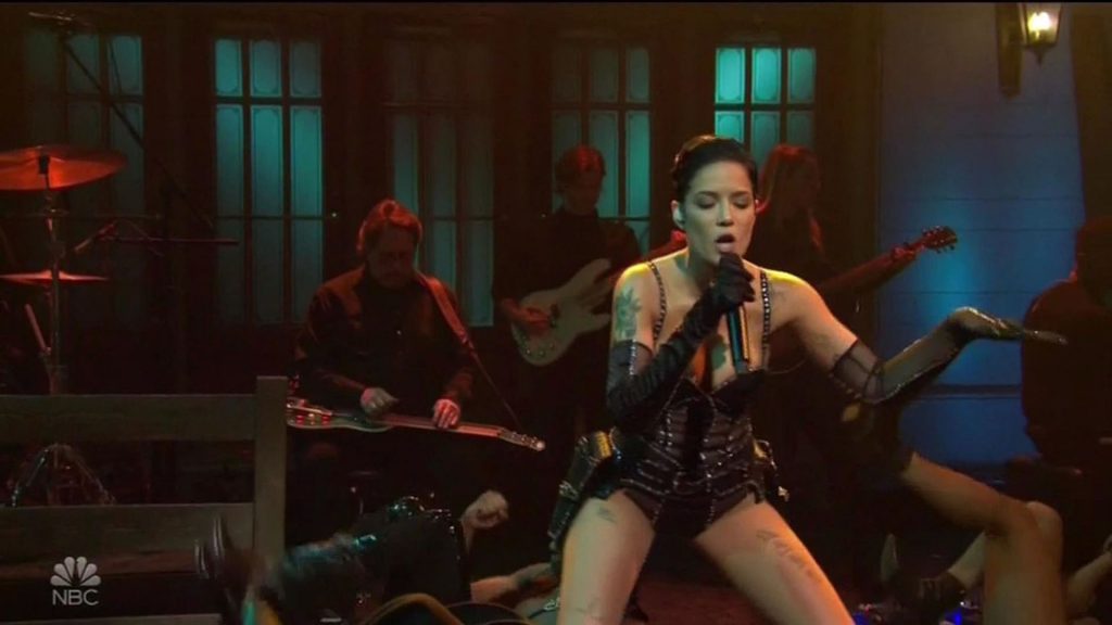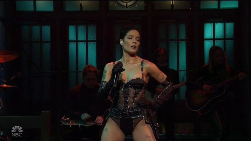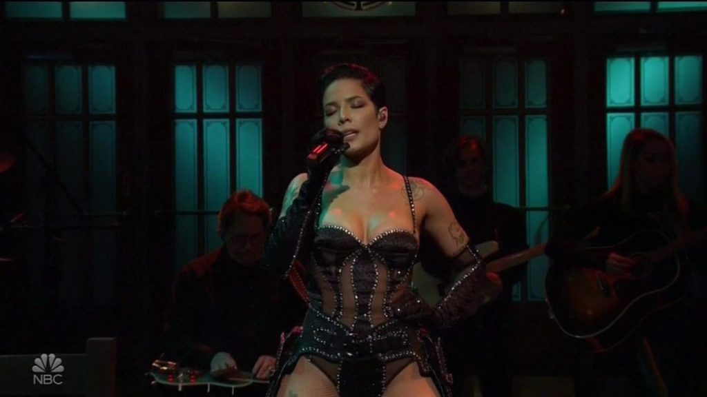 Halsey incendia lo schermo mentre si esibisce su Saturday Night Live e si spoglia fino alla biancheria intima per uno sketch digitale.