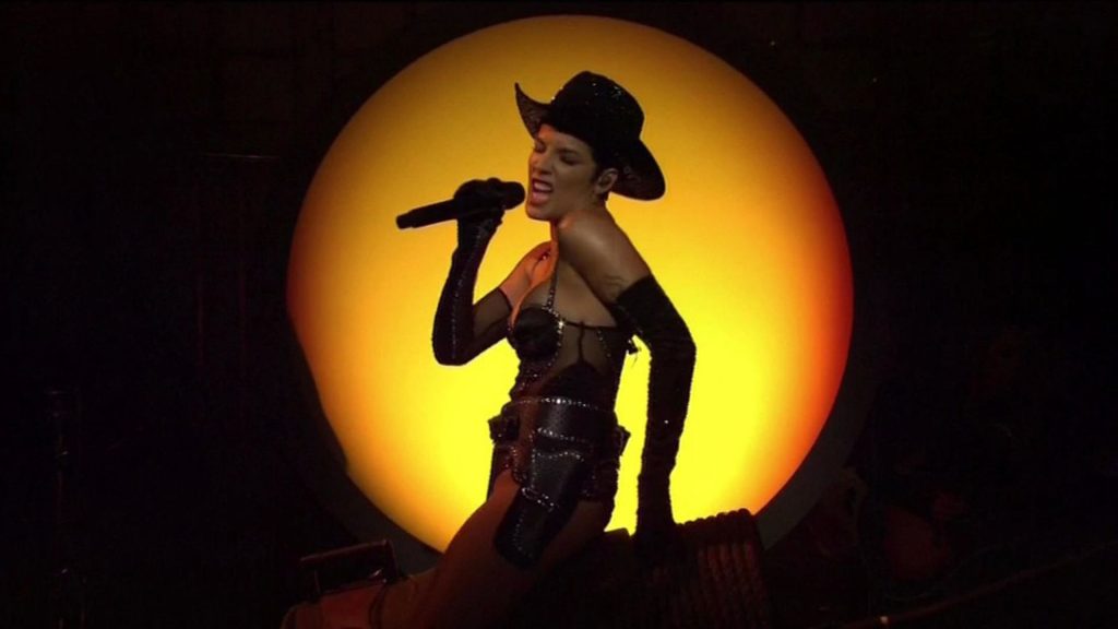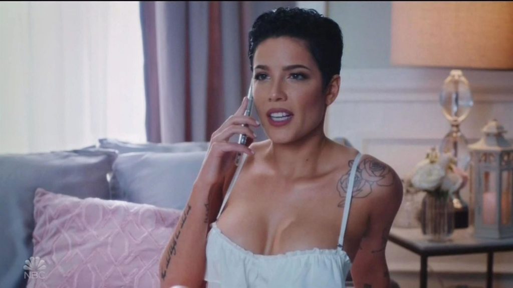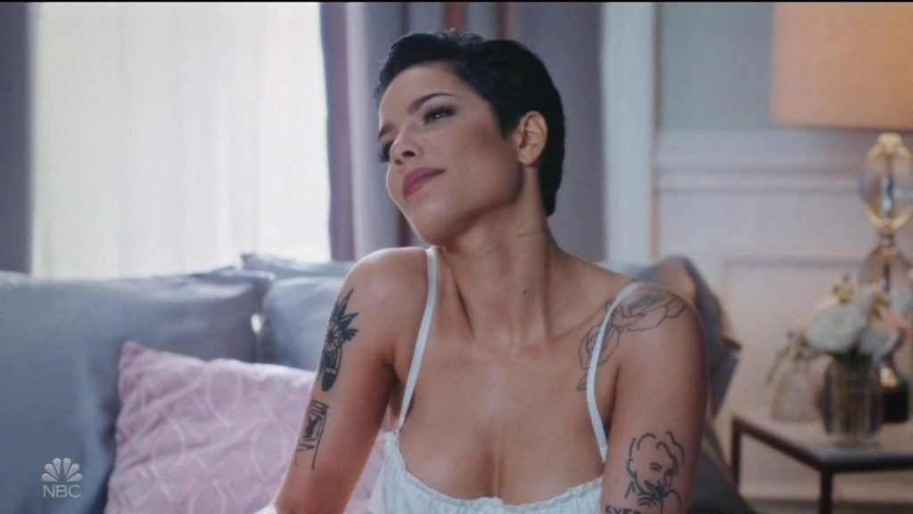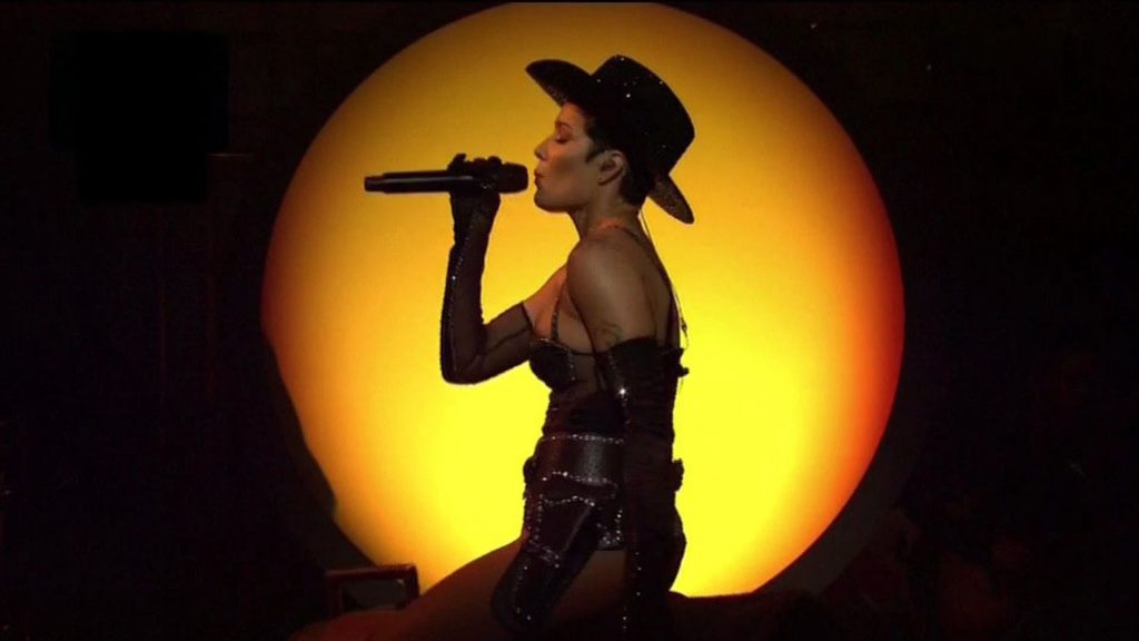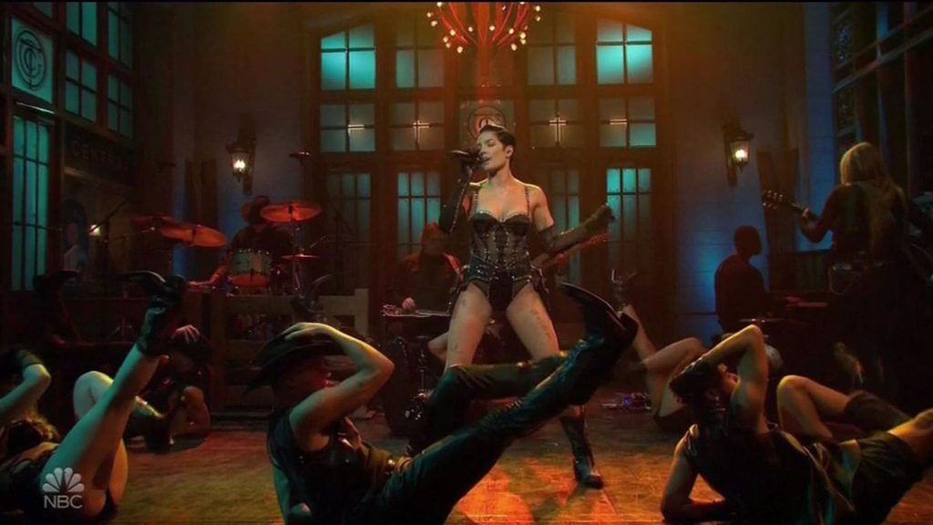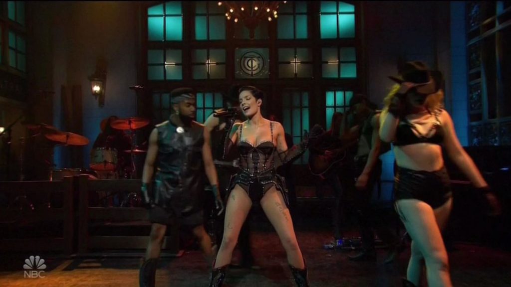 Halsey incendia lo schermo mentre si esibisce su Saturday Night Live e si spoglia fino alla biancheria intima per uno sketch digitale.