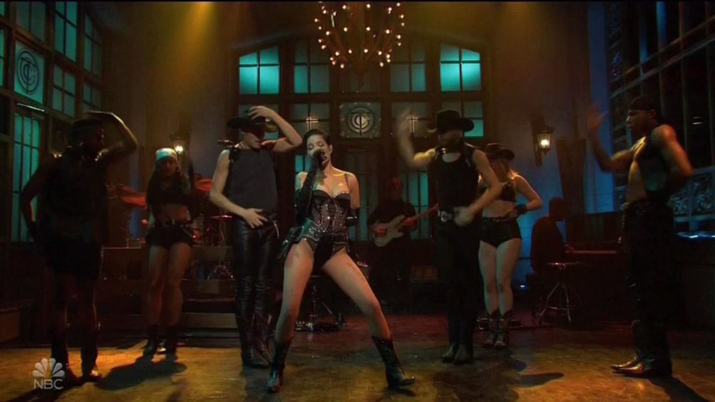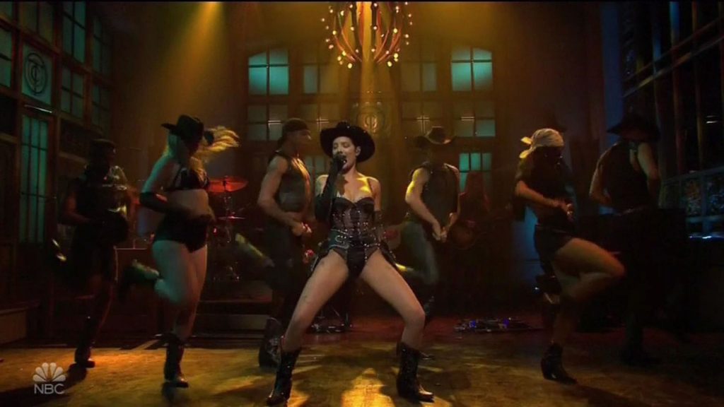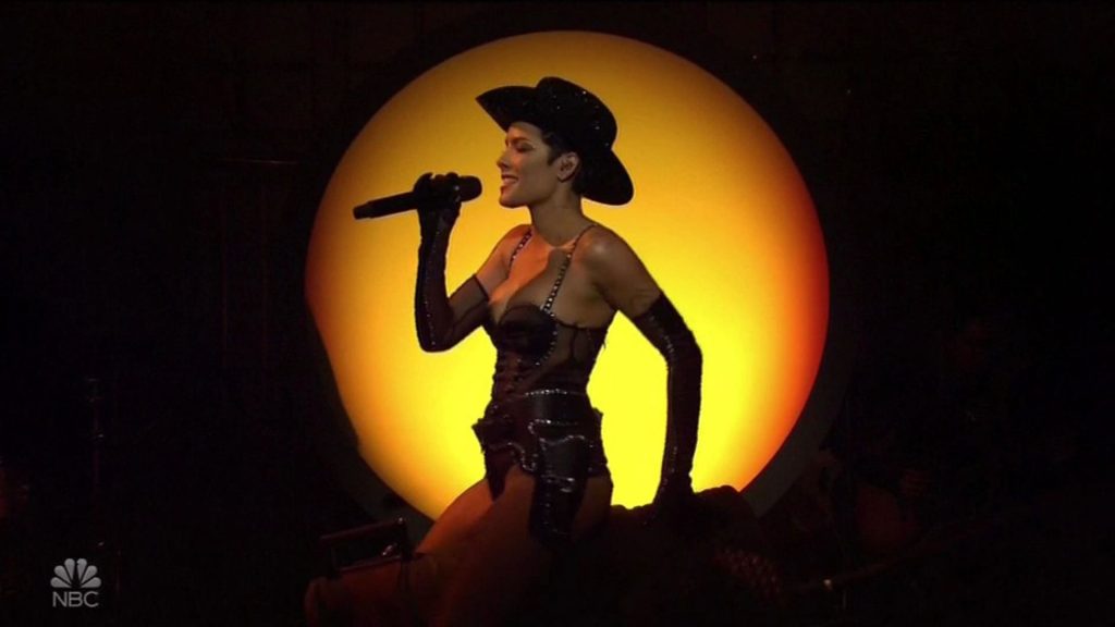 Halsey ha fatto il suo trionfale ritorno a SNL con due esibizioni coinvolgenti di nuovi singoli dal suo album recentemente pubblicato, Manic. La cantante di 25 anni è salita per prima sul palco per eseguire il brano You Should Be Sad. Vestita con un body nero tempestato di brillantini, calze a rete e guanti, Halsey, che ha aperto la performance cavalcando un toro meccanico con un cappello da cowboy coperto di strass e stivali da cowboy abbinati, ha riscaldato la sua prima esibizione della serata con una versione sexy della canzone.