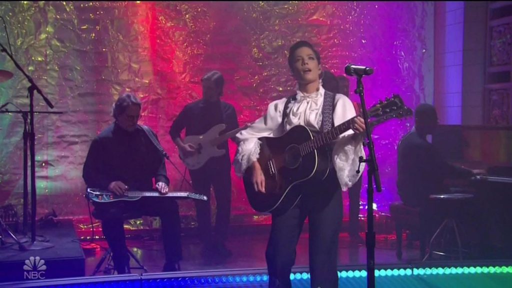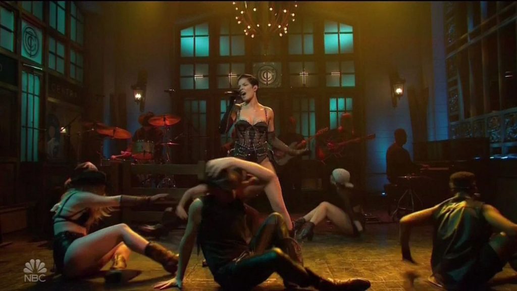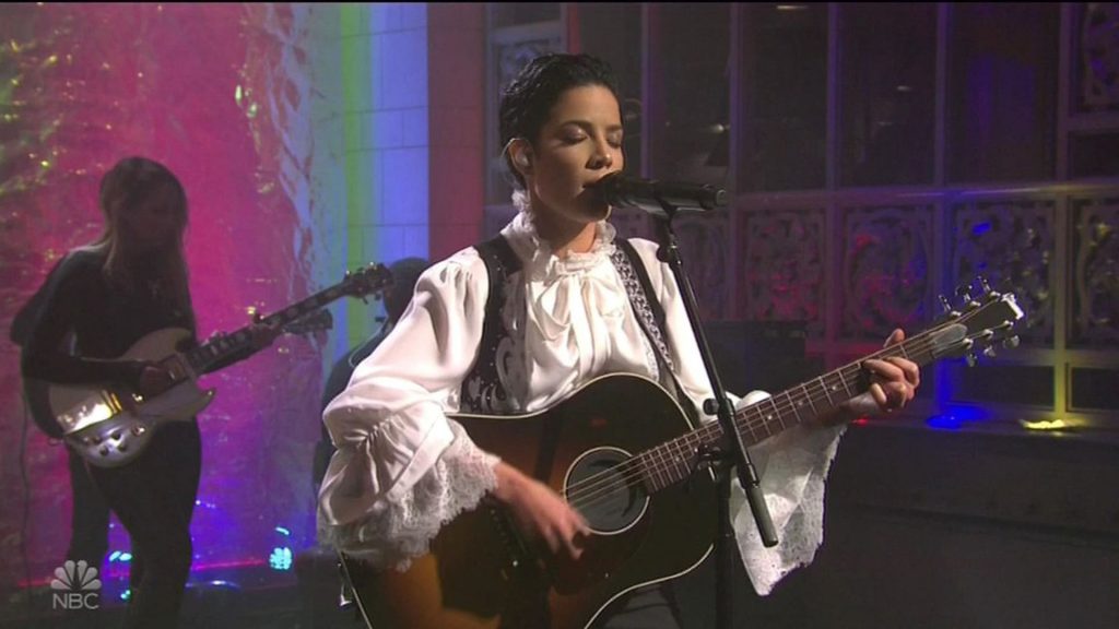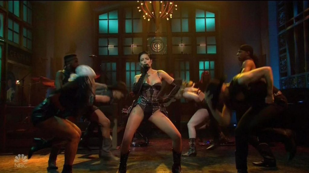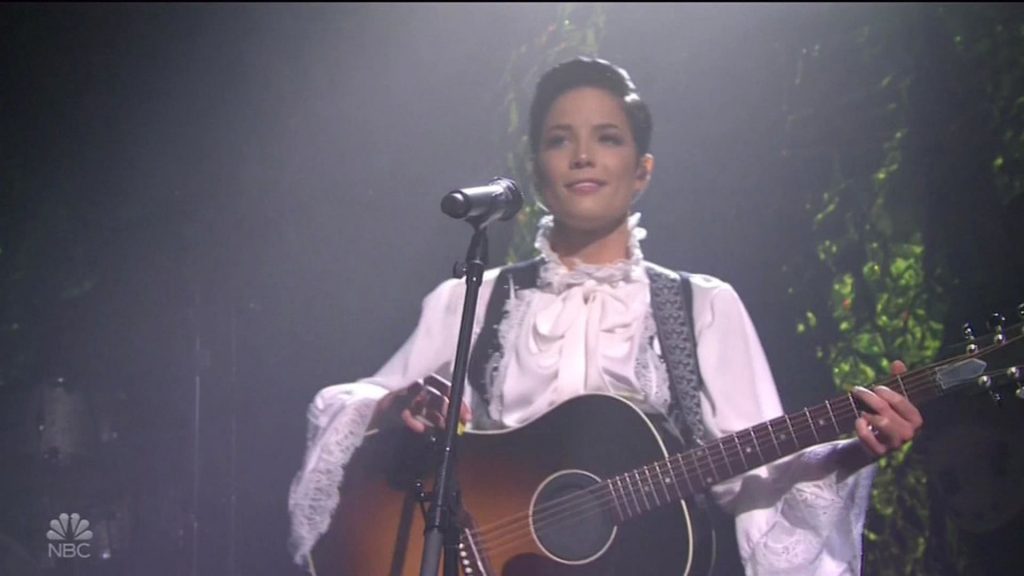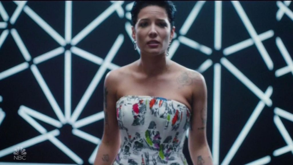 Halsey è poi tornata sul palco per rallentare i tempi con una performance essenziale di Finally e Beautiful Stranger. Elegante in una camicia bianca boho a maniche lunghe con volant e pantaloni a gamba larga, con una chitarra acustica in mano, Halsey ha mostrato il suo vero talento mentre stava al centro del palco con un unico riflettore puntato su di lei. Halsey è apparsa anche nel cortometraggio digitale Slow, insieme al conduttore di SNL Adam Driver. Nello sketch musicale Take It Slow la cantante britannica è stata vista in sexy lingerie bianca mentre il conduttore Driver, insieme ai regolari di SNL Kenan Thompson e Chris Redd, cantava alle loro donne di prendersela comoda in camera da letto – come “muoversi a malapena” lentamente o “nella corsia 65 andando a 2”. È apparsa anche in un secondo sketch interpretando una cheerleader.