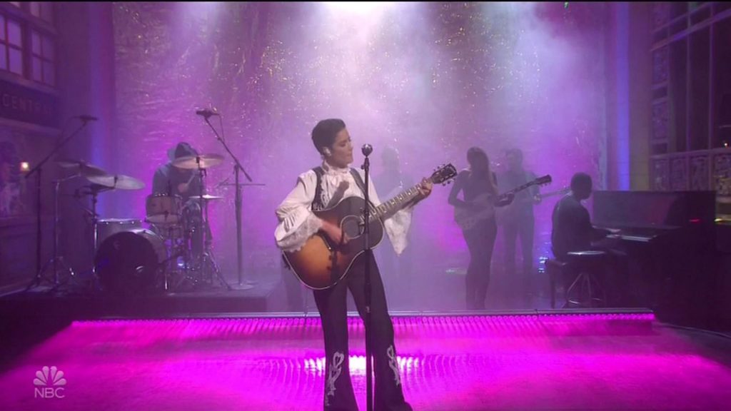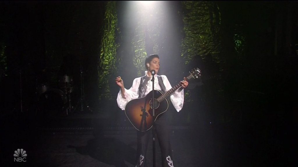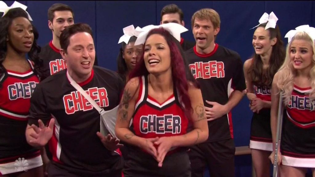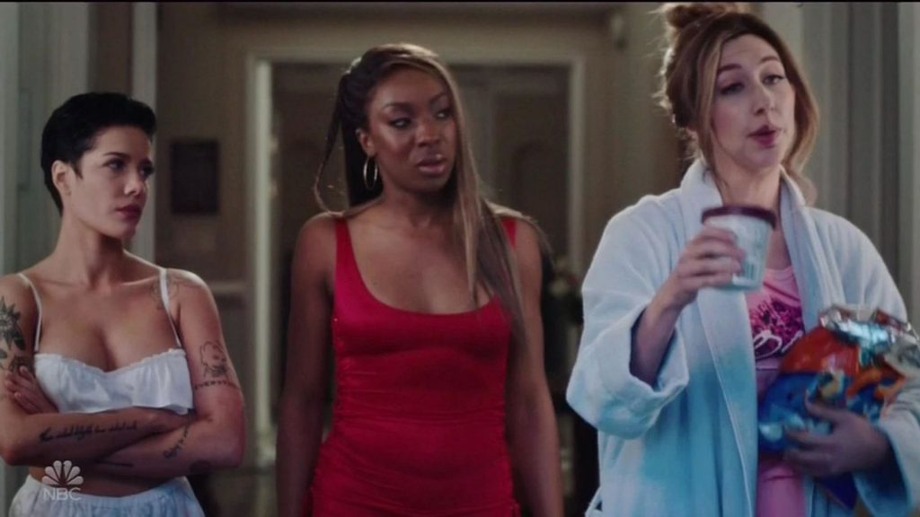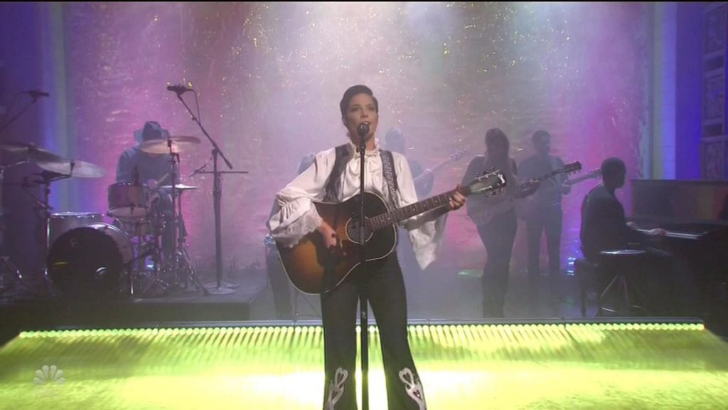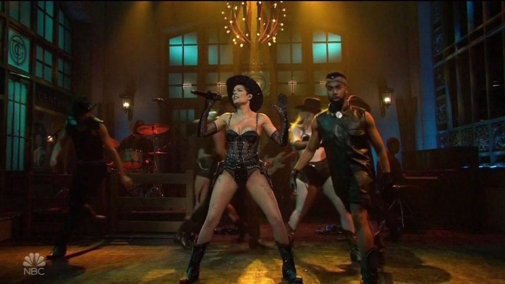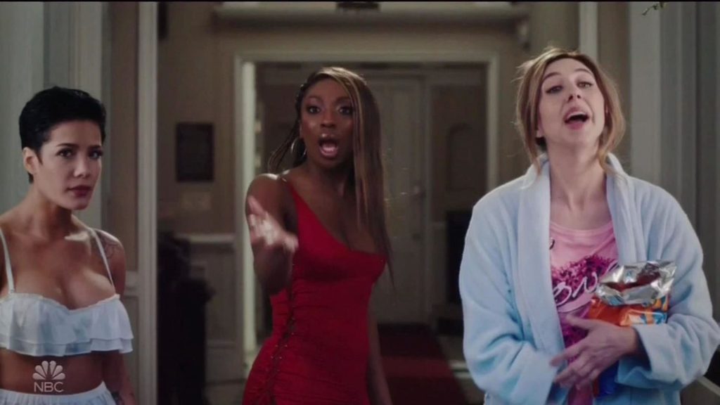 Halsey è poi tornata sul palco per rallentare i tempi con una performance essenziale di Finally e Beautiful Stranger. Elegante in una camicia bianca boho a maniche lunghe con volant e pantaloni a gamba larga, con una chitarra acustica in mano, Halsey ha mostrato il suo vero talento mentre stava al centro del palco con un unico riflettore puntato su di lei. Halsey è apparsa anche nel cortometraggio digitale Slow, insieme al conduttore di SNL Adam Driver. Nello sketch musicale Take It Slow la cantante britannica è stata vista in sexy lingerie bianca mentre il conduttore Driver, insieme ai regolari di SNL Kenan Thompson e Chris Redd, cantava alle loro donne di prendersela comoda in camera da letto – come “muoversi a malapena” lentamente o “nella corsia 65 andando a 2”. È apparsa anche in un secondo sketch interpretando una cheerleader.