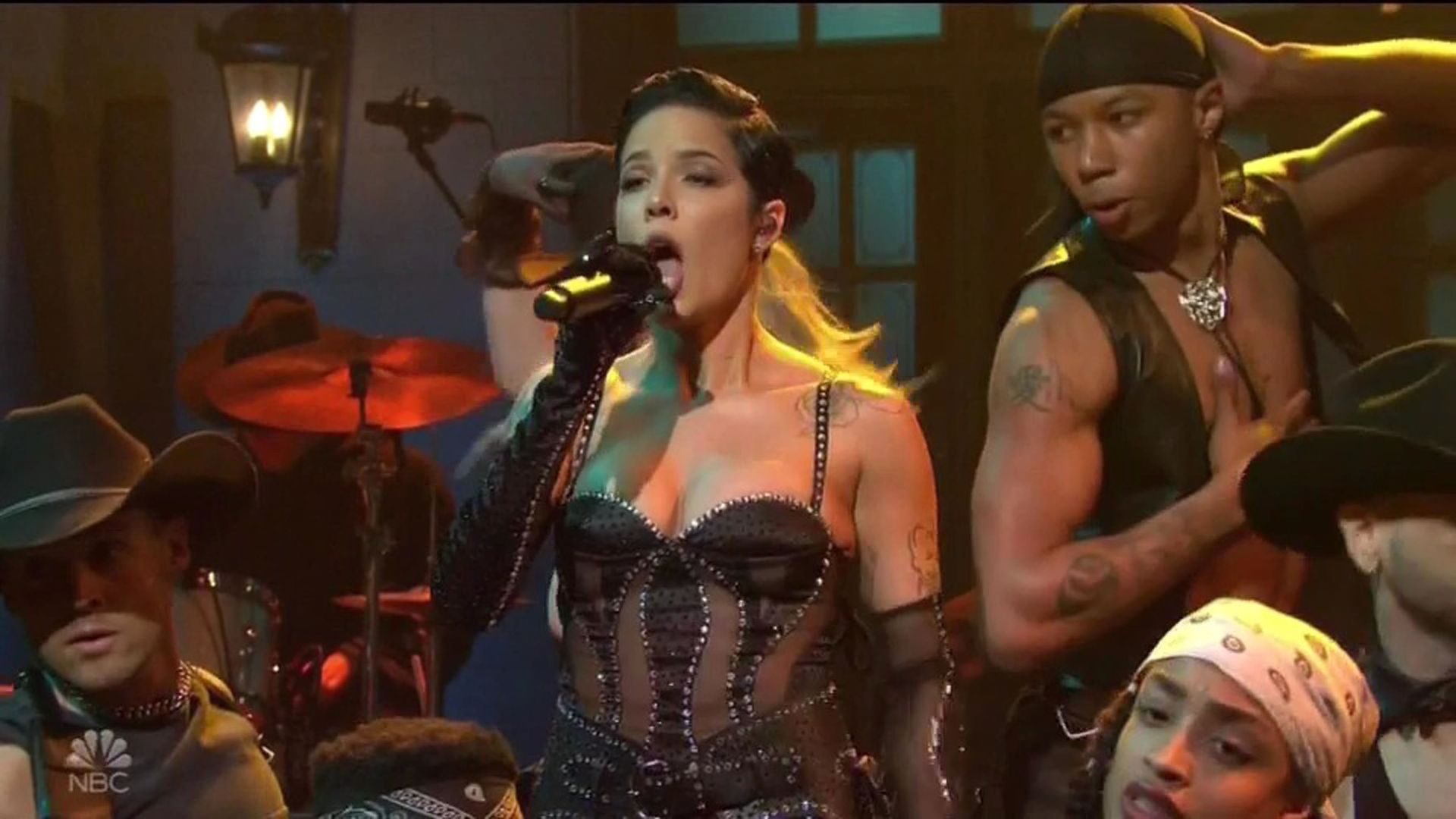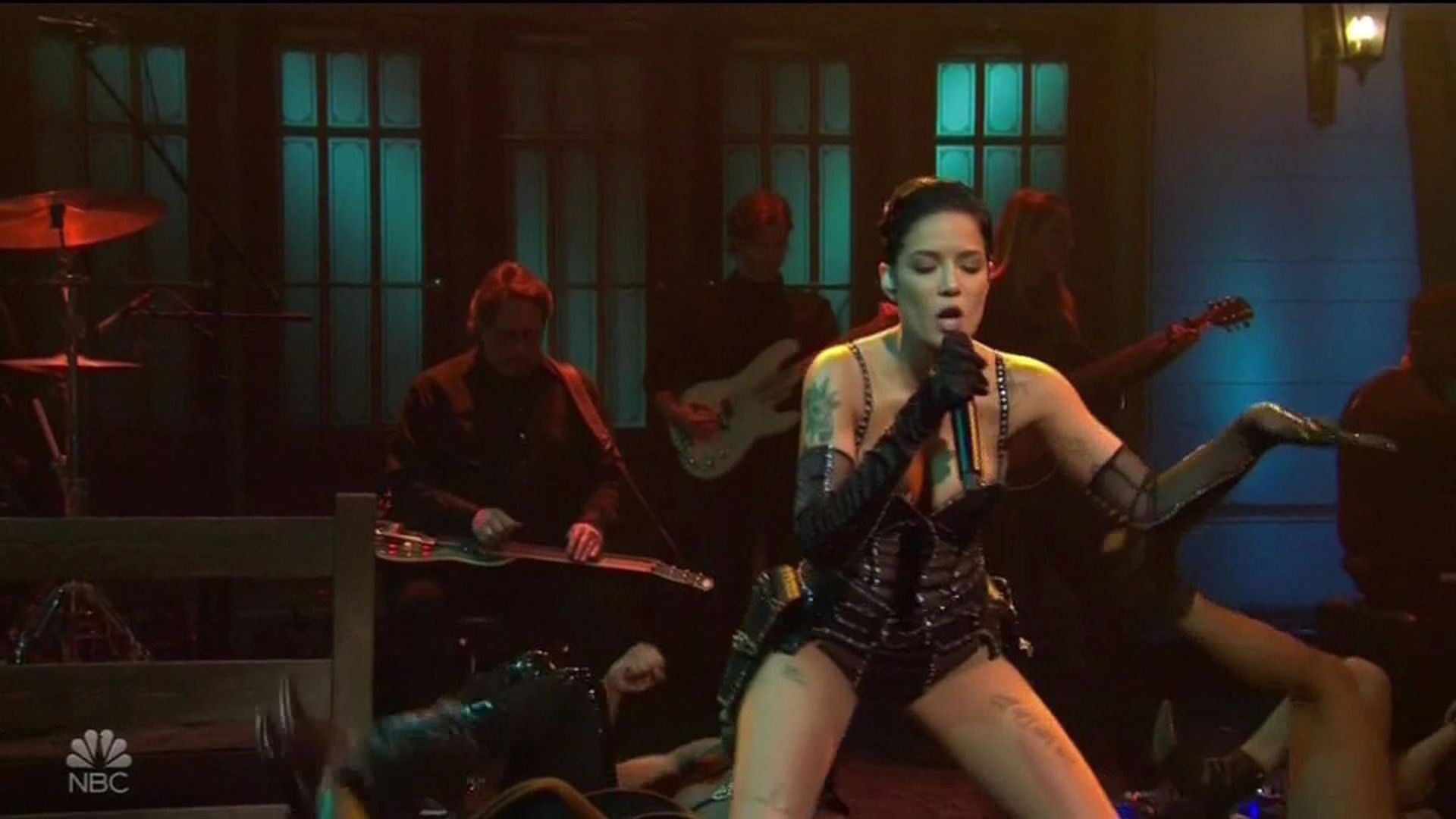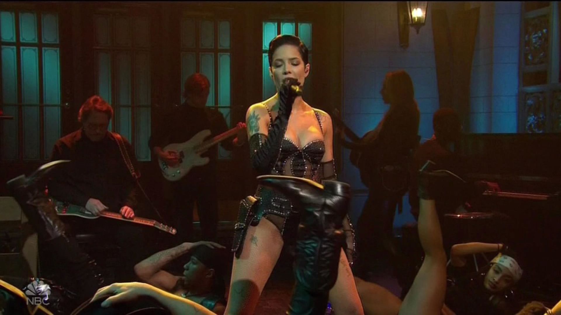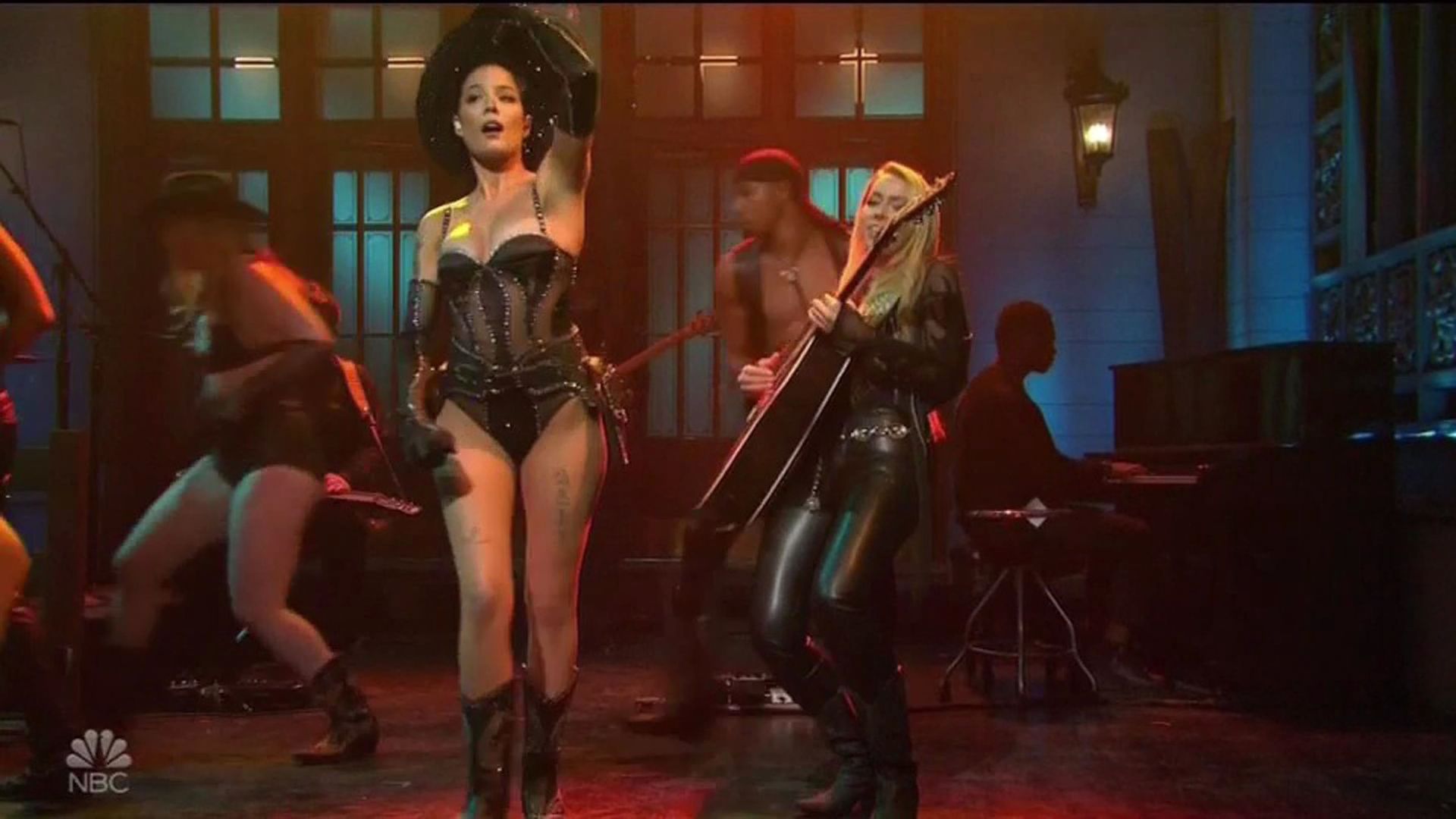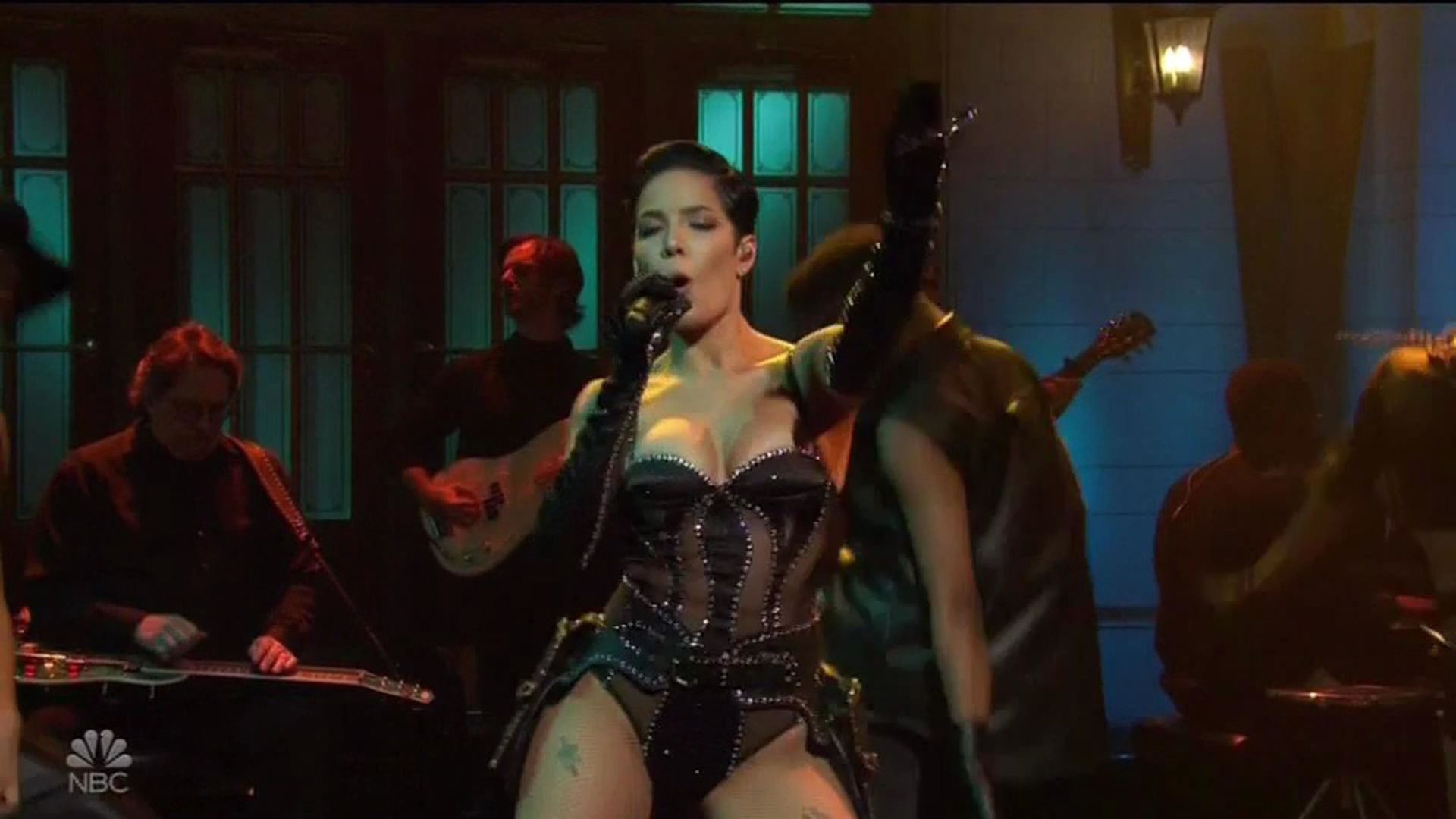 Halsey incendia lo schermo mentre si esibisce su Saturday Night Live e si spoglia fino alla biancheria intima per uno sketch digitale.