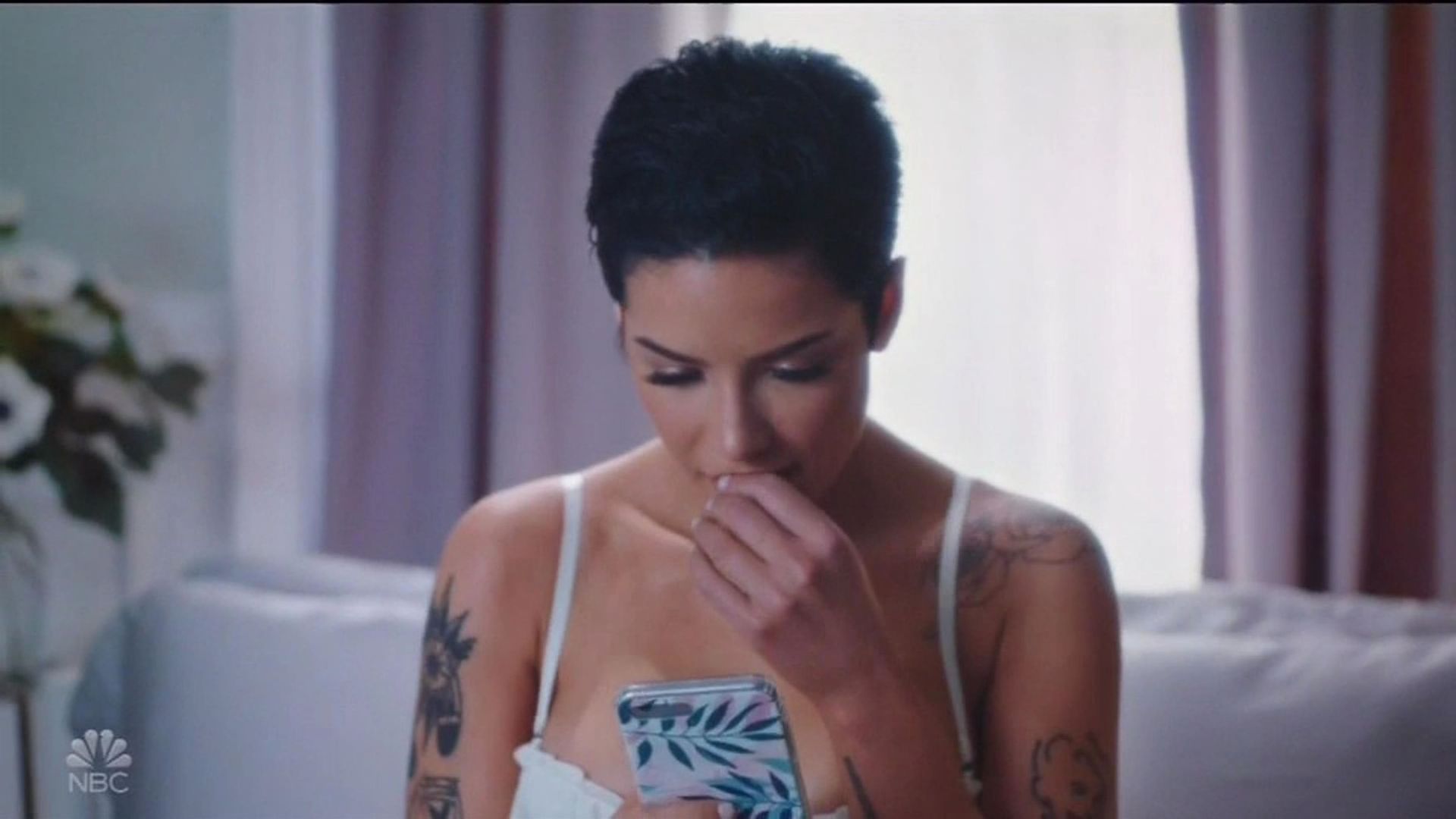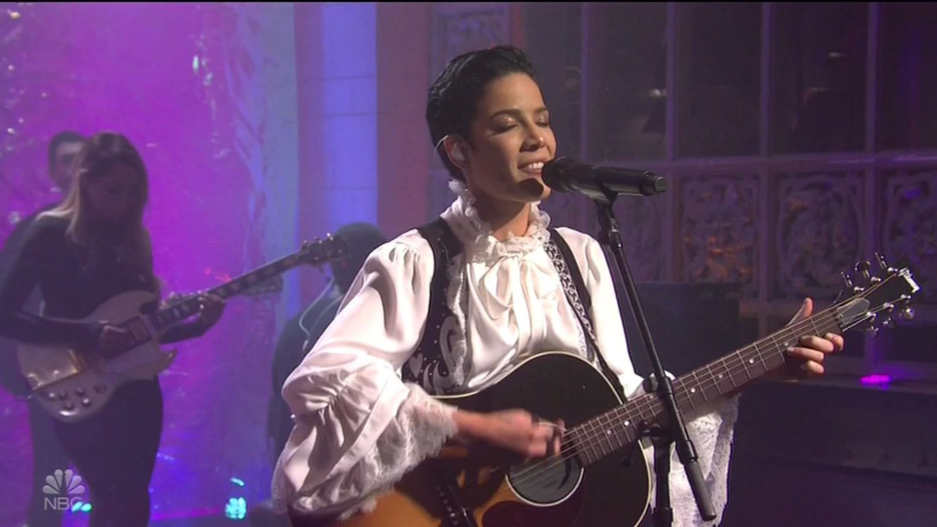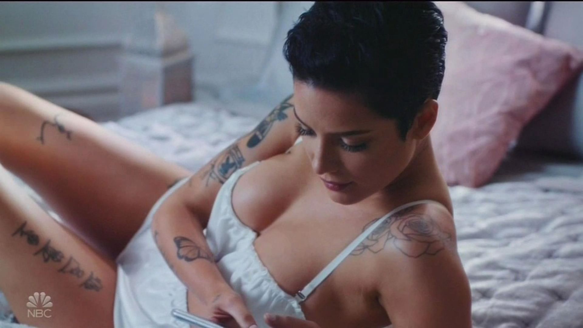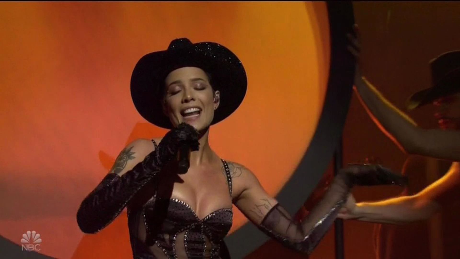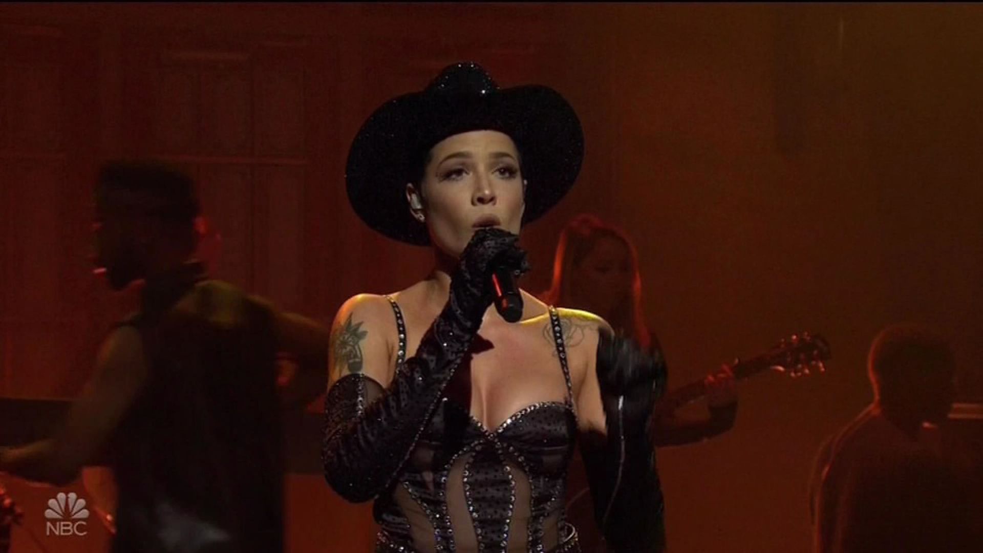Halsey incendia lo schermo mentre si esibisce su Saturday Night Live e si spoglia fino alla biancheria intima per uno sketch digitale.