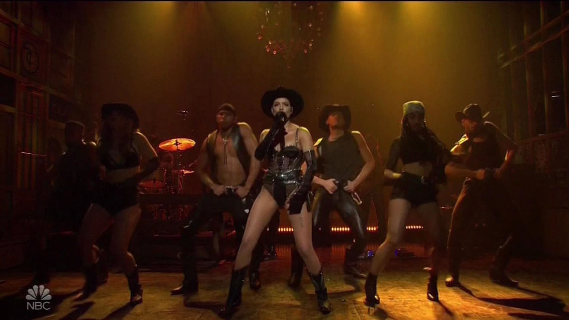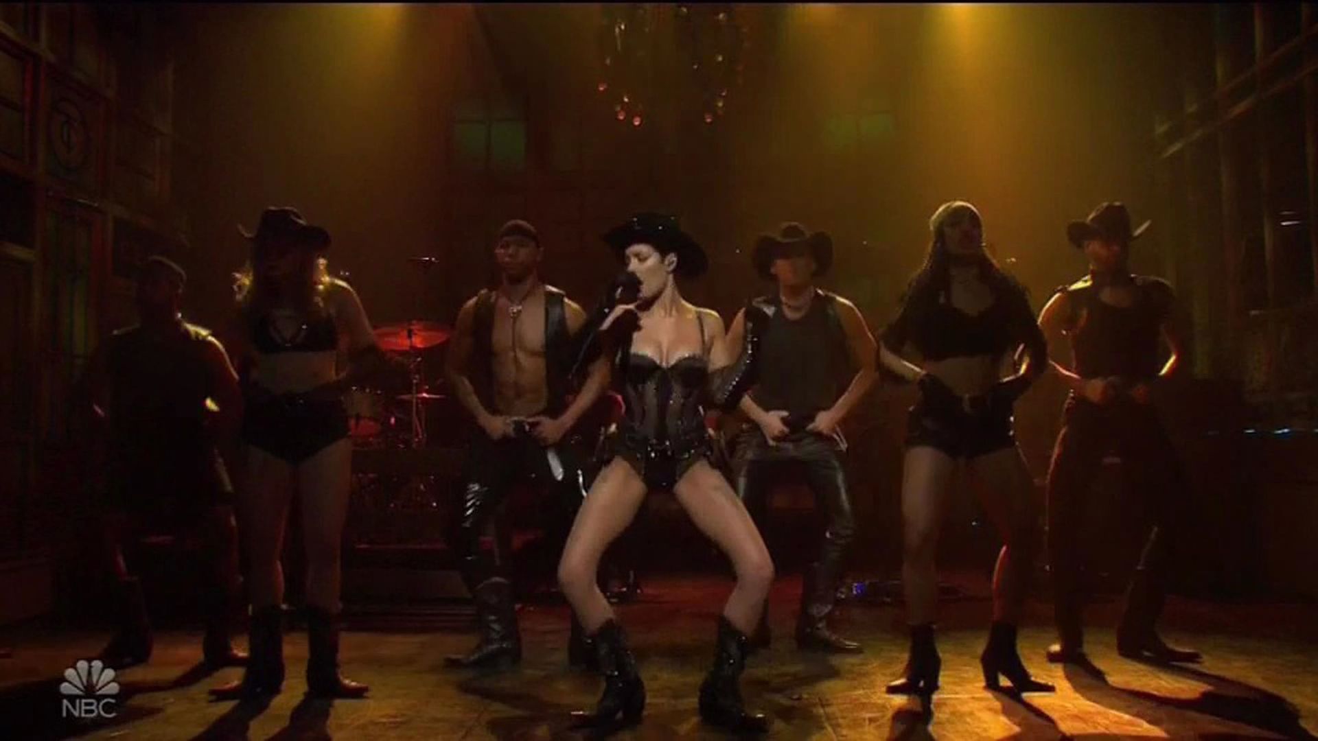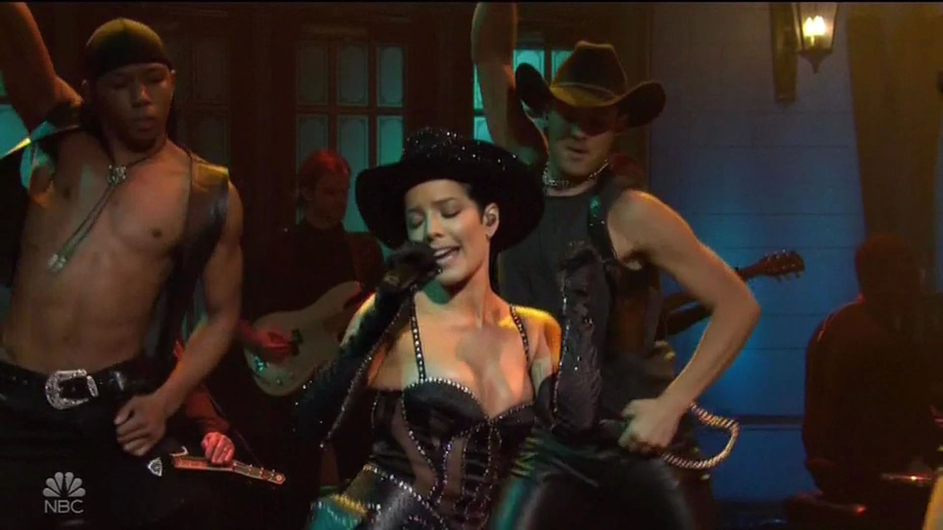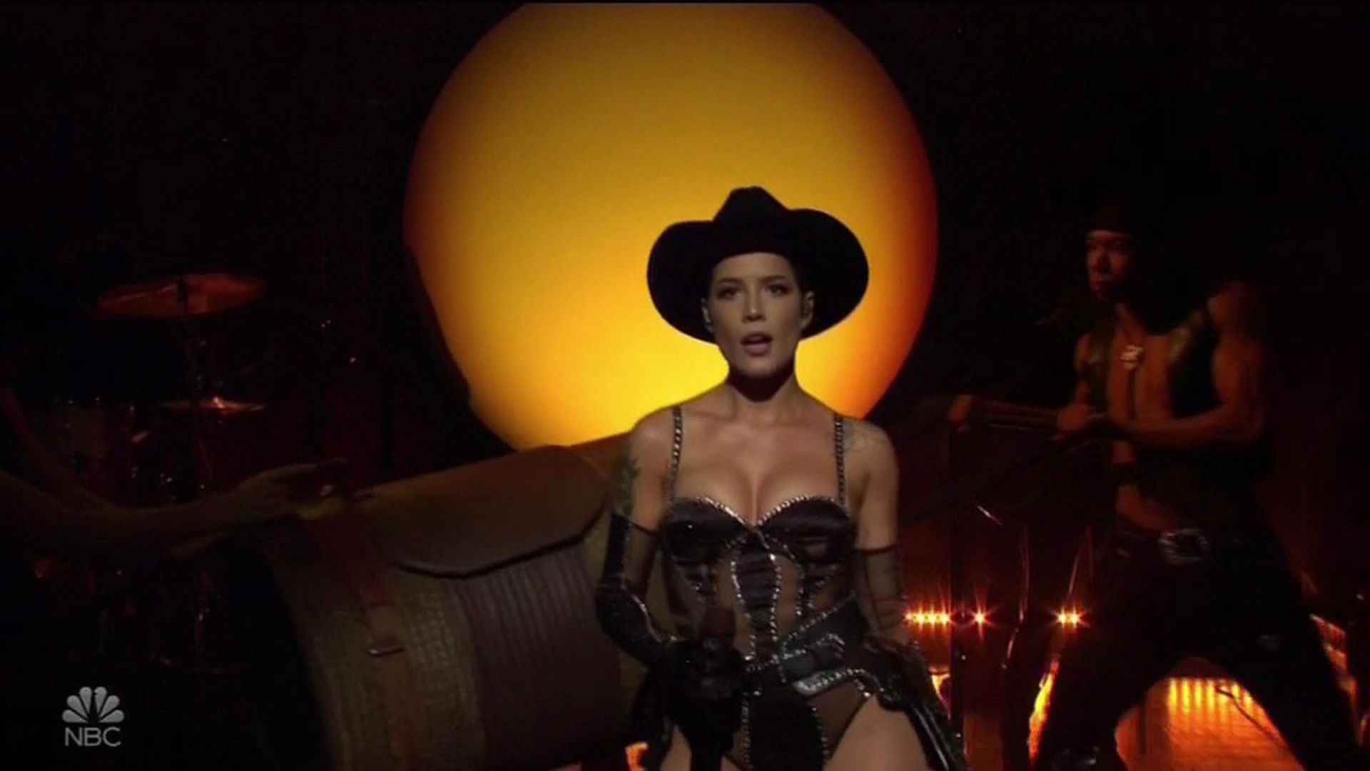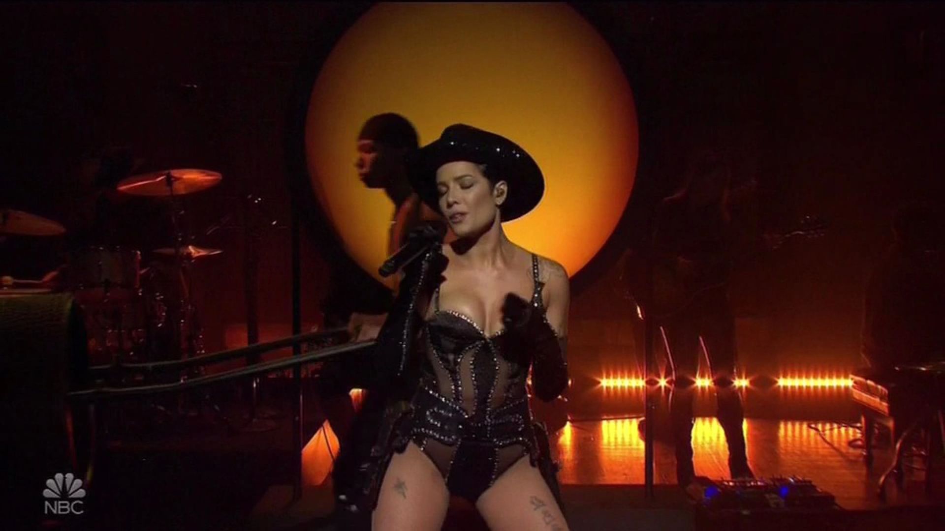 Halsey ha fatto il suo trionfale ritorno a SNL con due esibizioni coinvolgenti di nuovi singoli dal suo album recentemente pubblicato, Manic. La cantante di 25 anni è salita per prima sul palco per eseguire il brano You Should Be Sad. Vestita con un body nero tempestato di brillantini, calze a rete e guanti, Halsey, che ha aperto la performance cavalcando un toro meccanico con un cappello da cowboy coperto di strass e stivali da cowboy abbinati, ha riscaldato la sua prima esibizione della serata con una versione sexy della canzone.