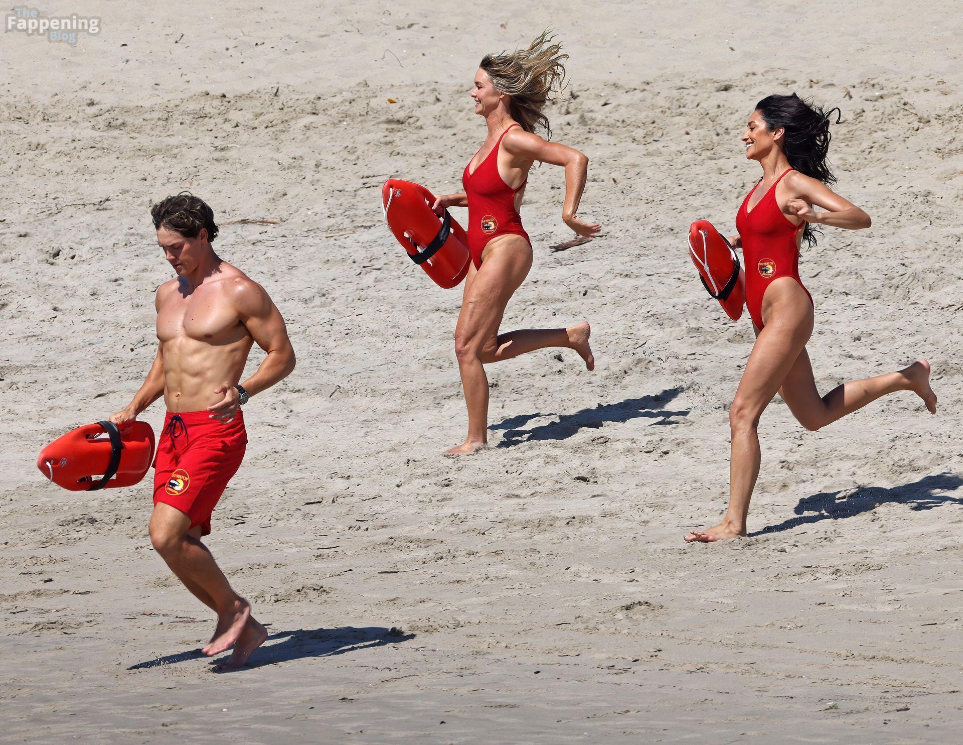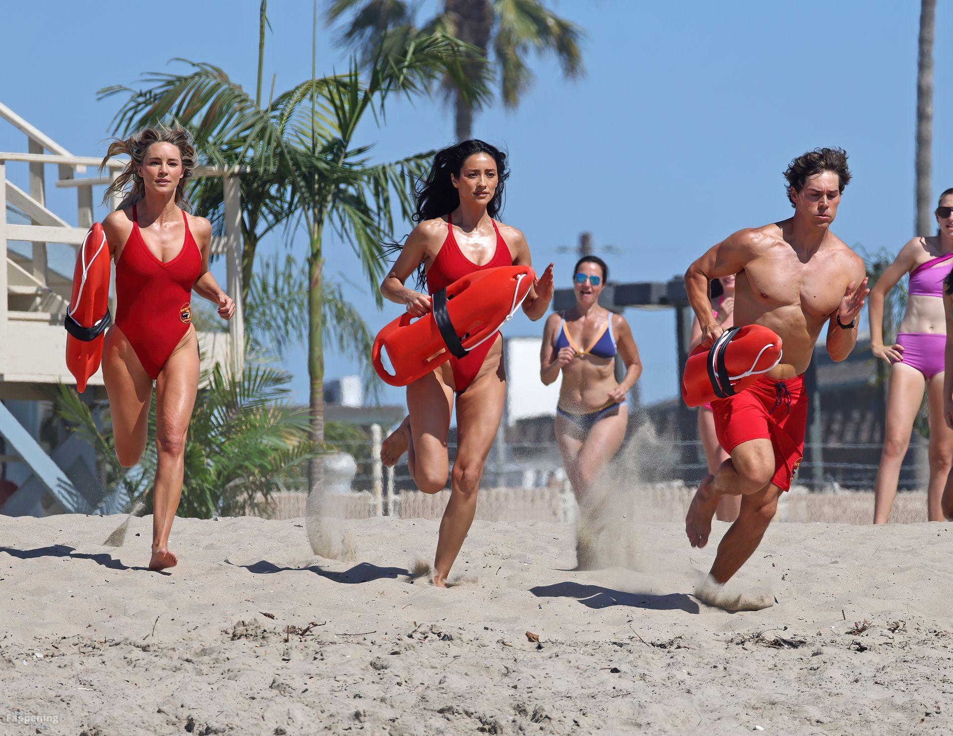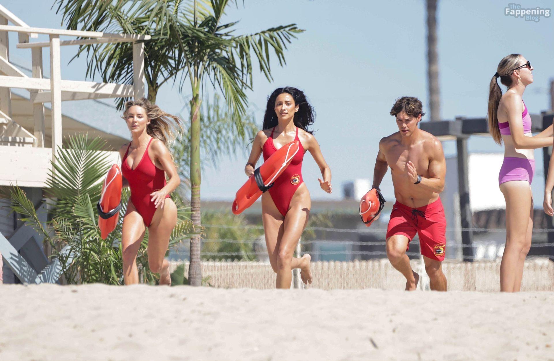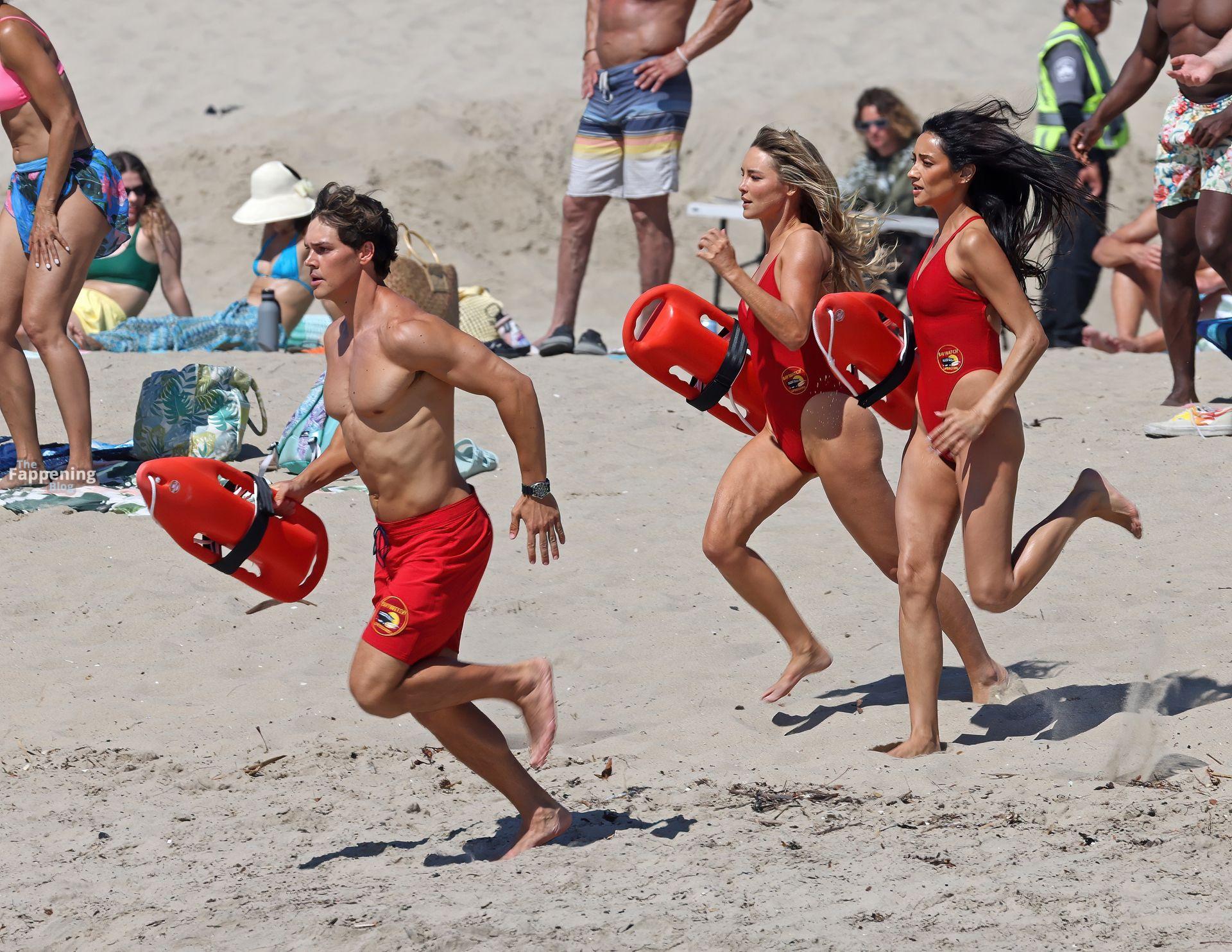 Shay Mitchell, Hassie Harrison, Stephen Amell e Noah Beck sono ritratti mentre girano la nuova serie Baywatch a Venice Beach.