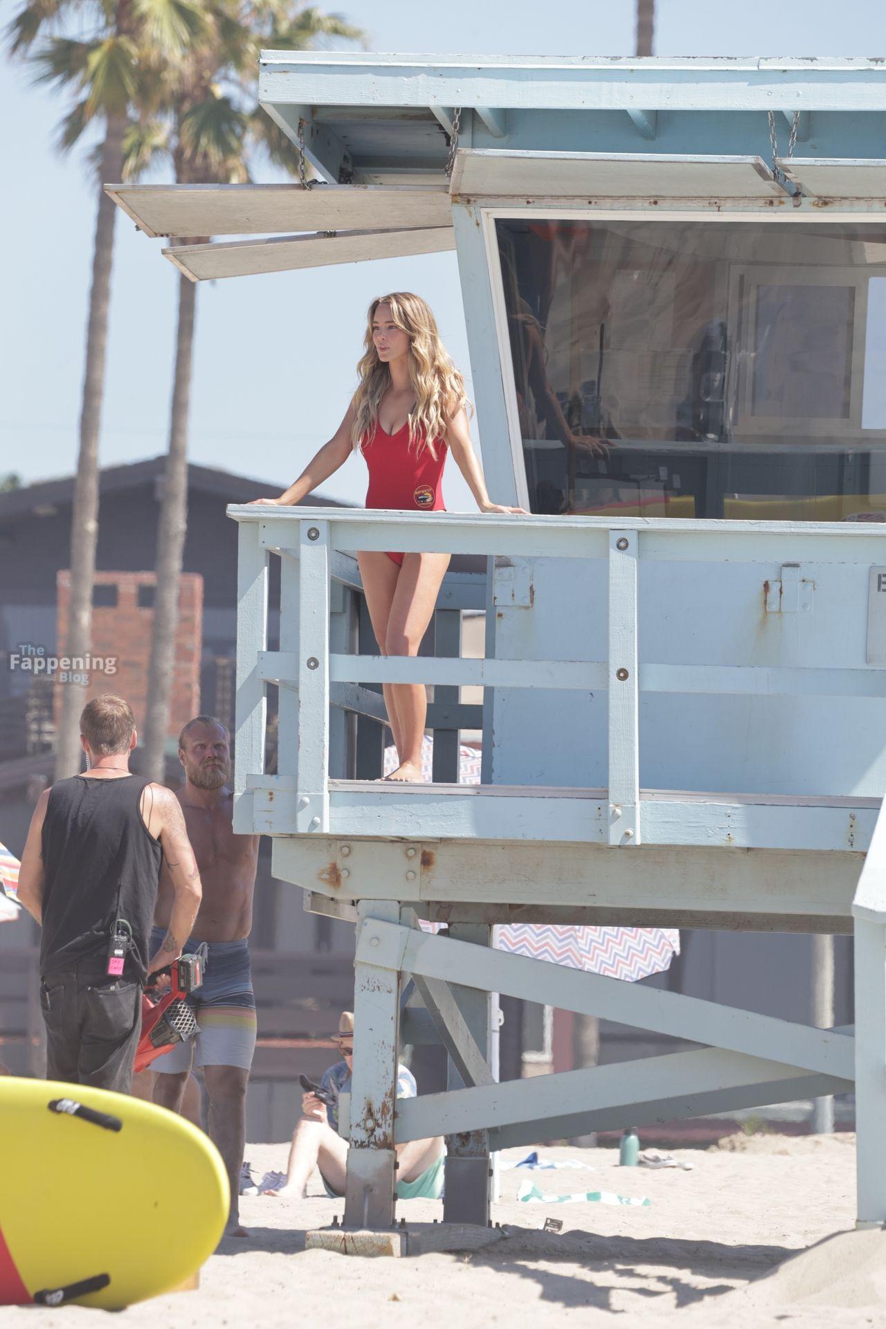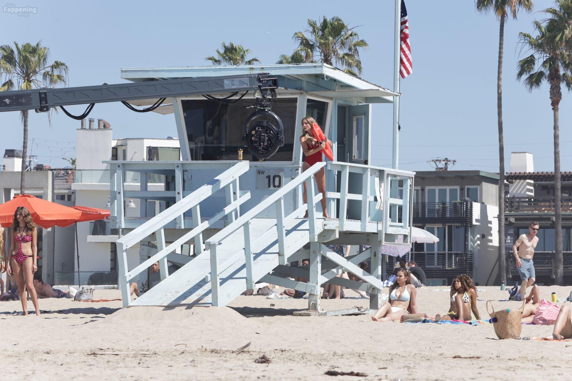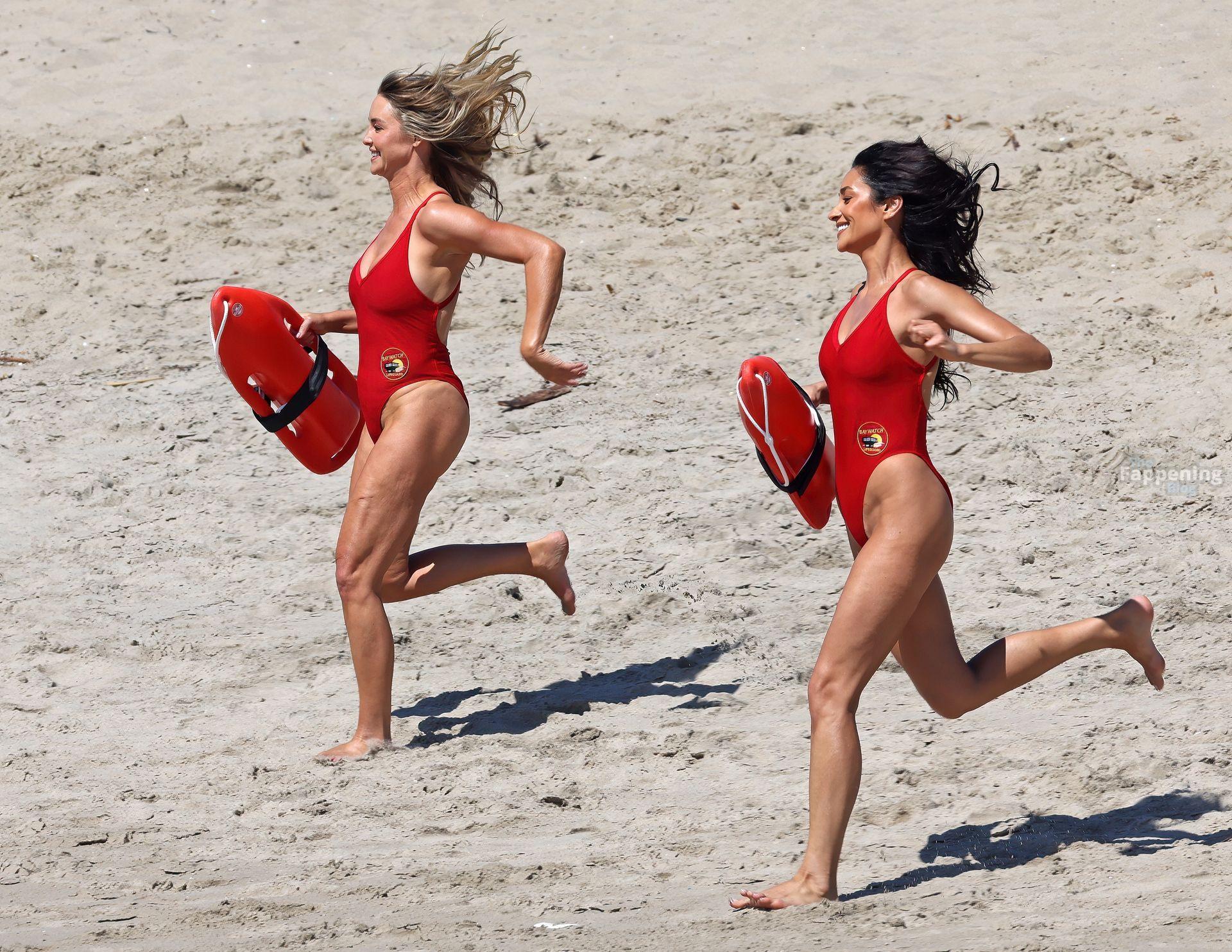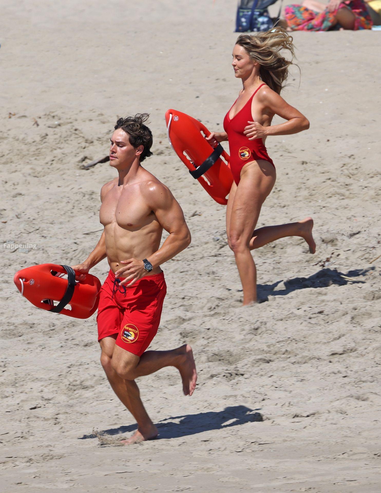 Shay Mitchell, Hassie Harrison, Stephen Amell e Noah Beck sono ritratti mentre girano la nuova serie Baywatch a Venice Beach.