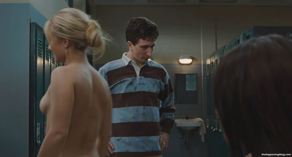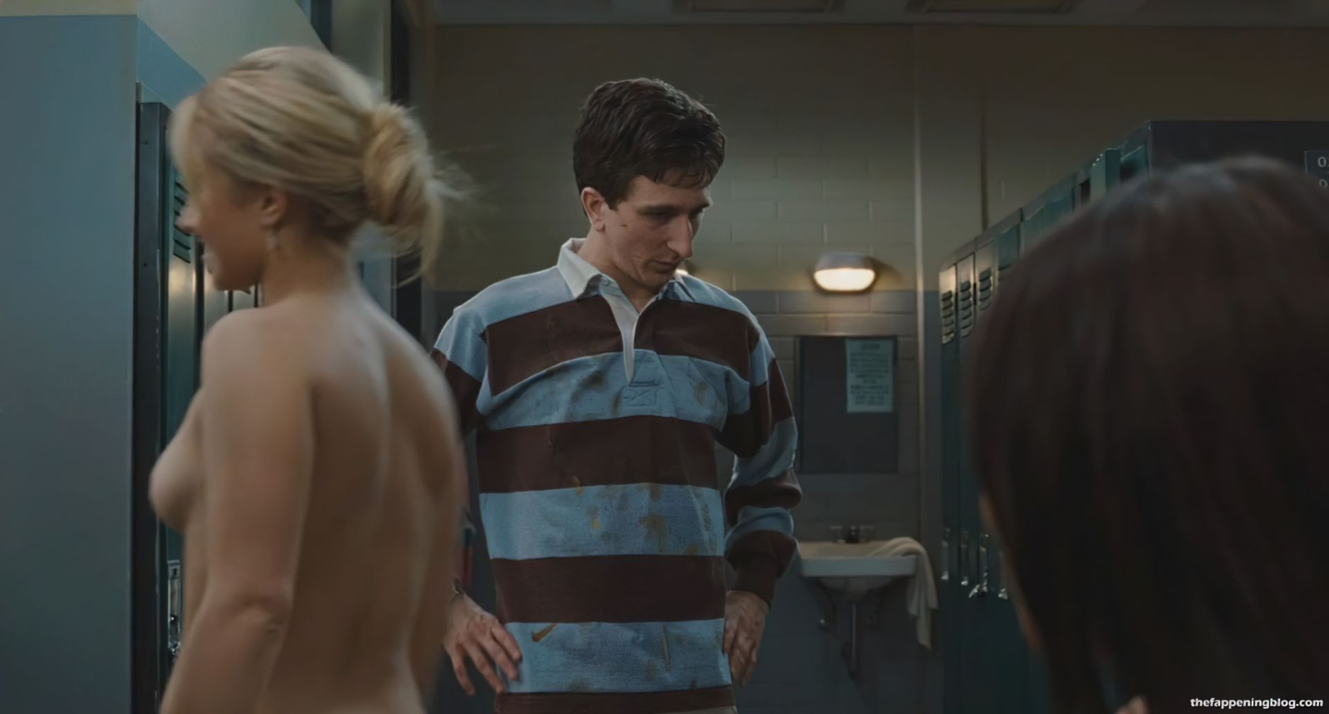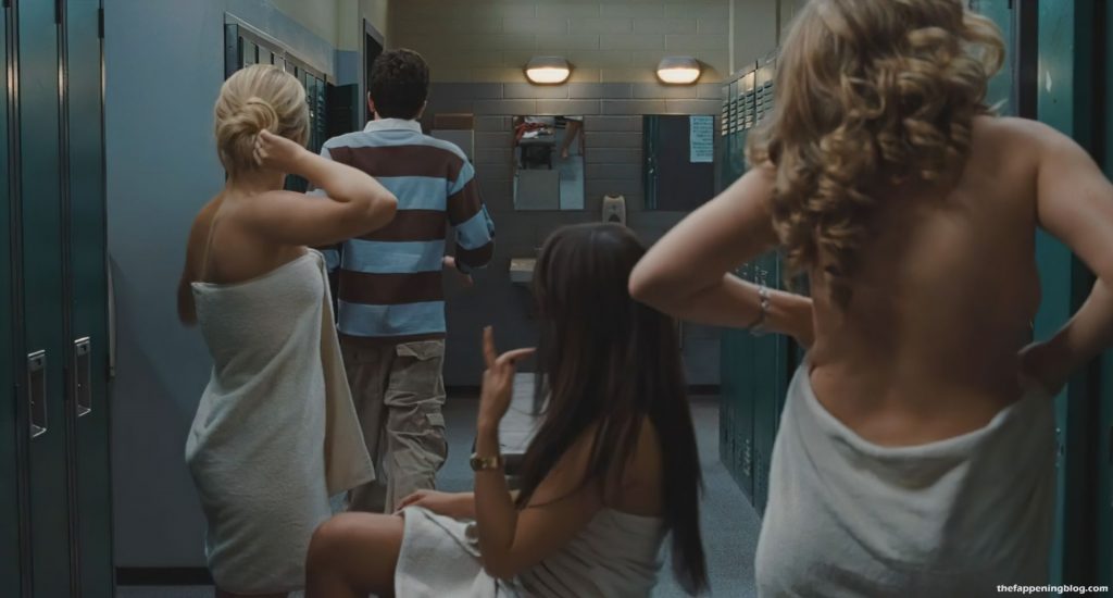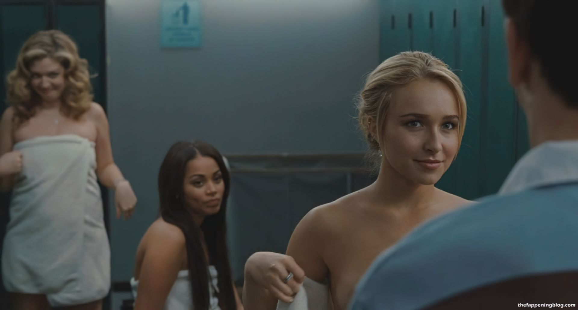 Hayden Panettiere is in a locker room, a white towel wrapped around her as a guy walks up to her. She then faces him, dropping her towel and turning to show her boobs. As she drops the robe, we also see the right nipple. Lauren Storm and Lauren London are also in the locker room. Lauren Storm also shows a good portion of her breasts from behind as she removes her bra and slides her towel up.