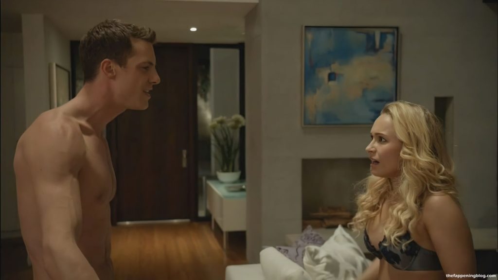 Then we have a scene of Hayden Panettiere is opening the door for a guy. He’s picking her up, and they make out. The man carries her to a couch. There we see her pull the guy’s shirt off and then take off her own, revealing a bra and cleavage. She then leans over to make out with the guy some more. She’s trying to take his pants off, but he stops her. Hayden begins to argue with a man before walking out of the room.