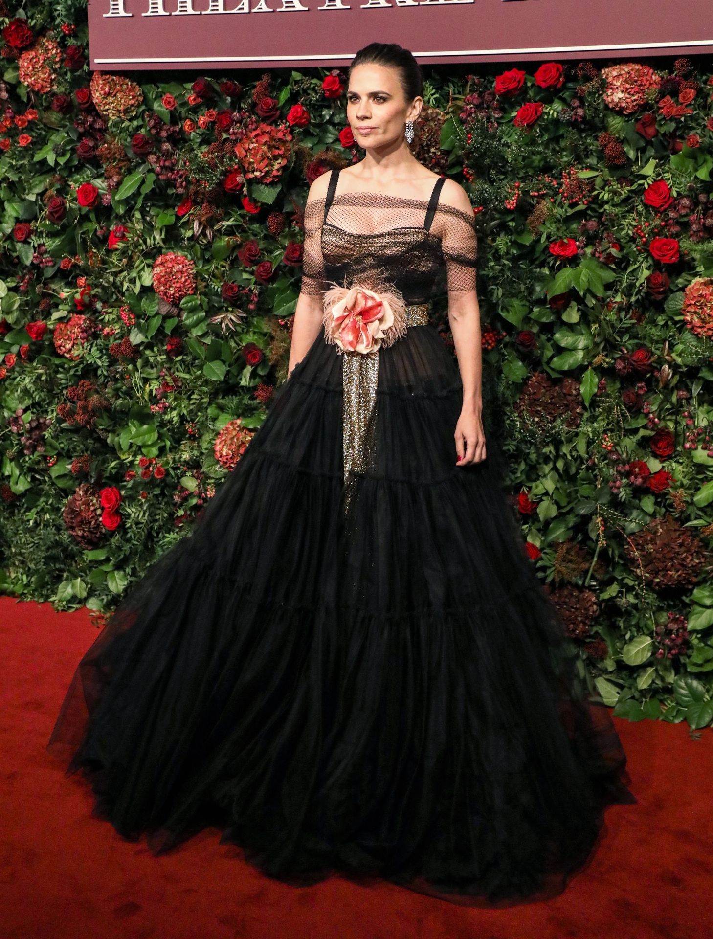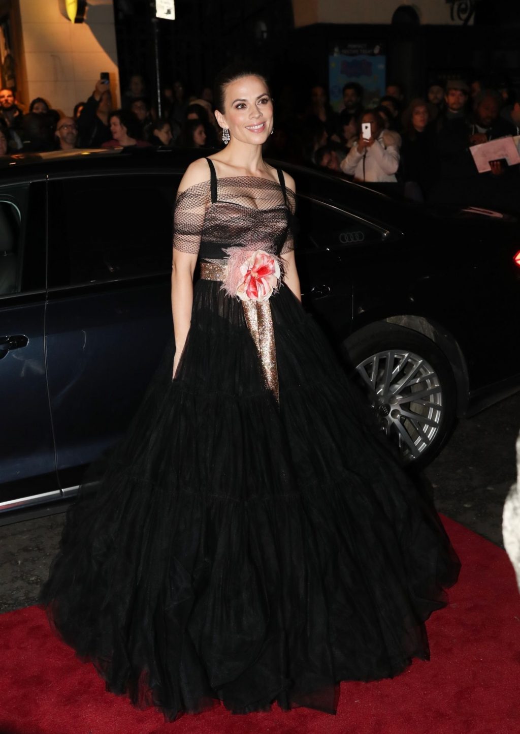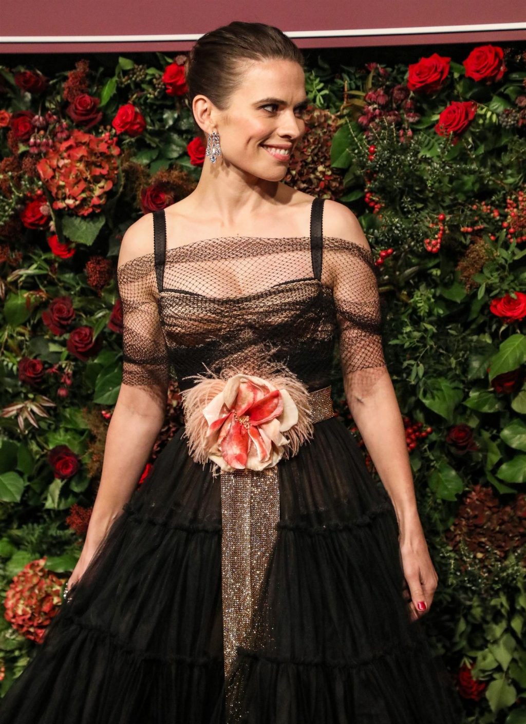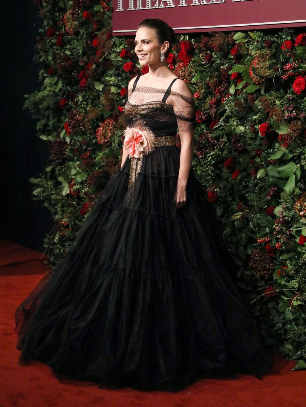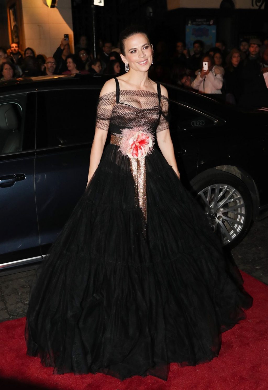 Attrice e star di The Fappening Hayley Atwell mostra la pelle con un vestito a rete mentre arriva fuori dagli arrivi degli Evening Standard Film Awards a Londra, 24/11/2019.