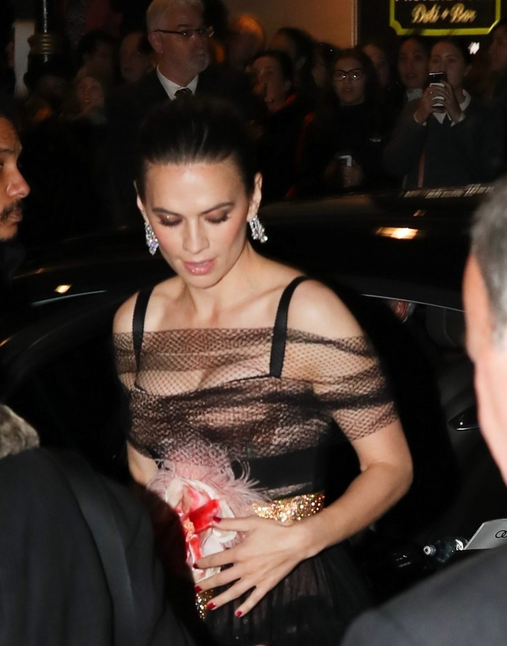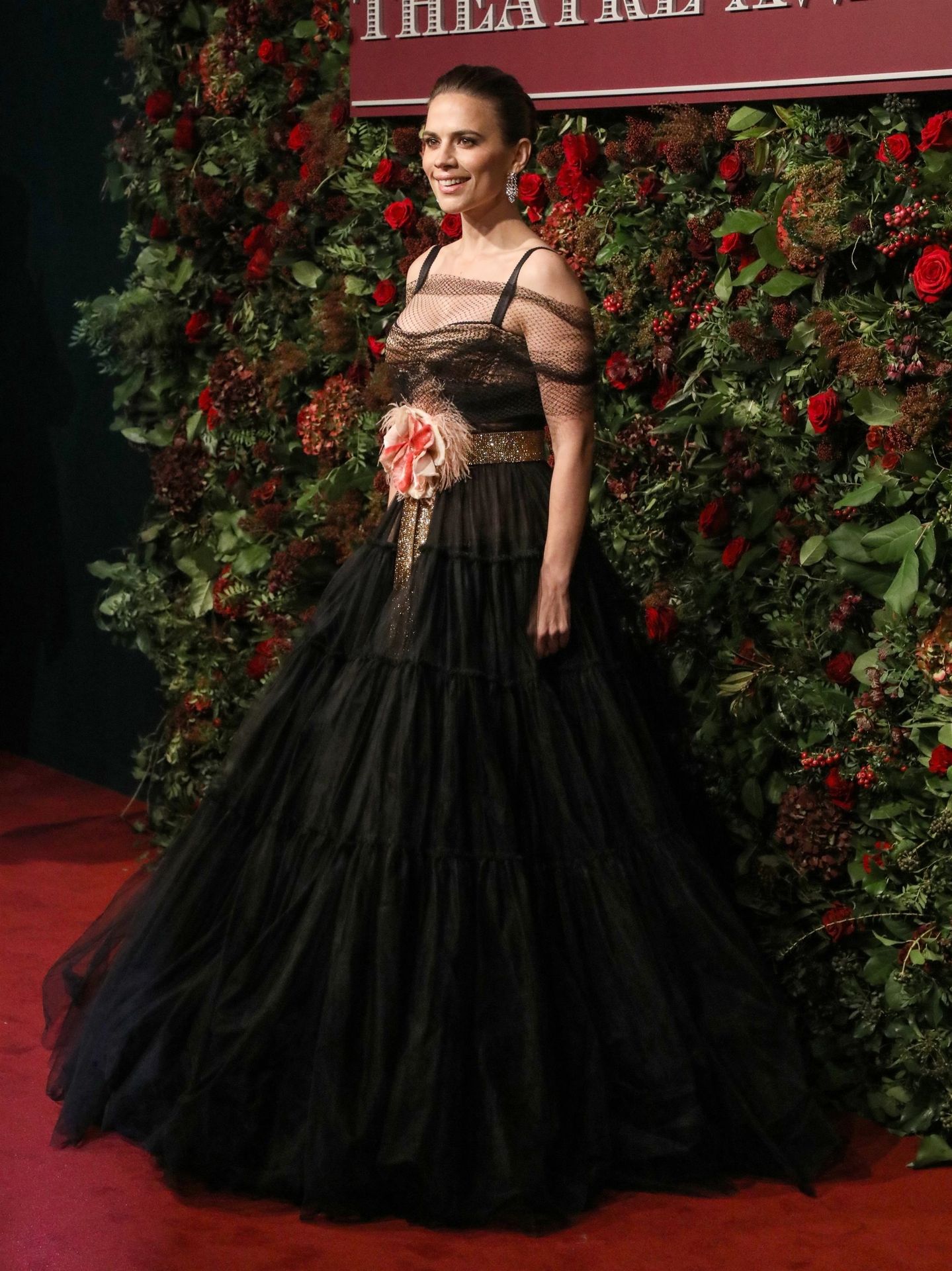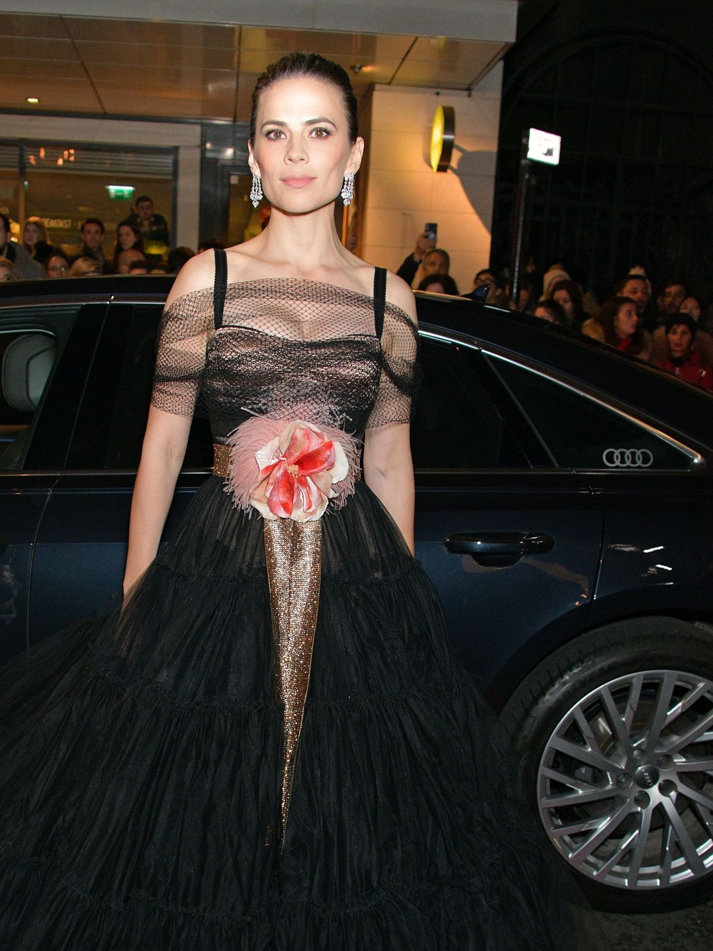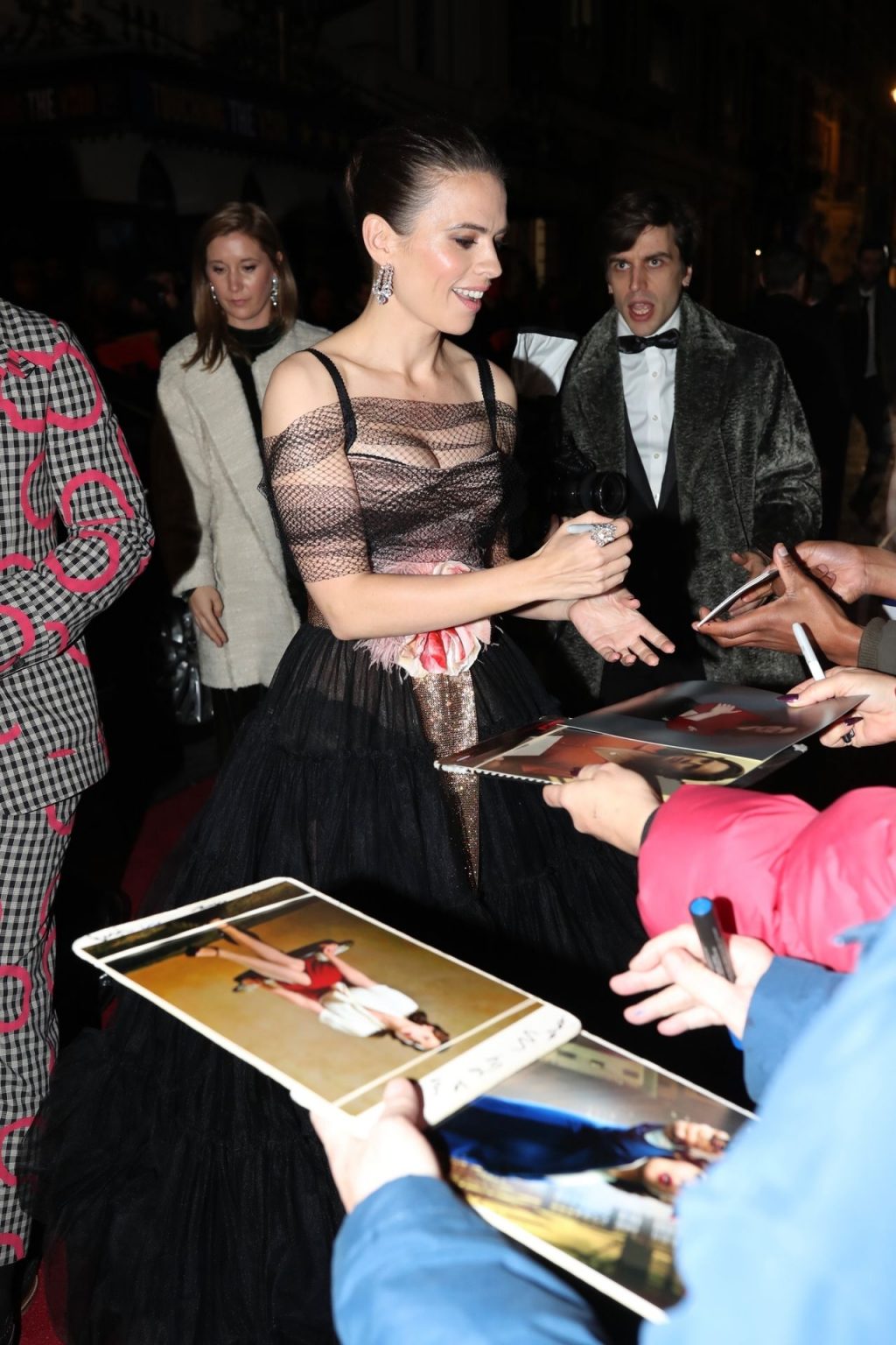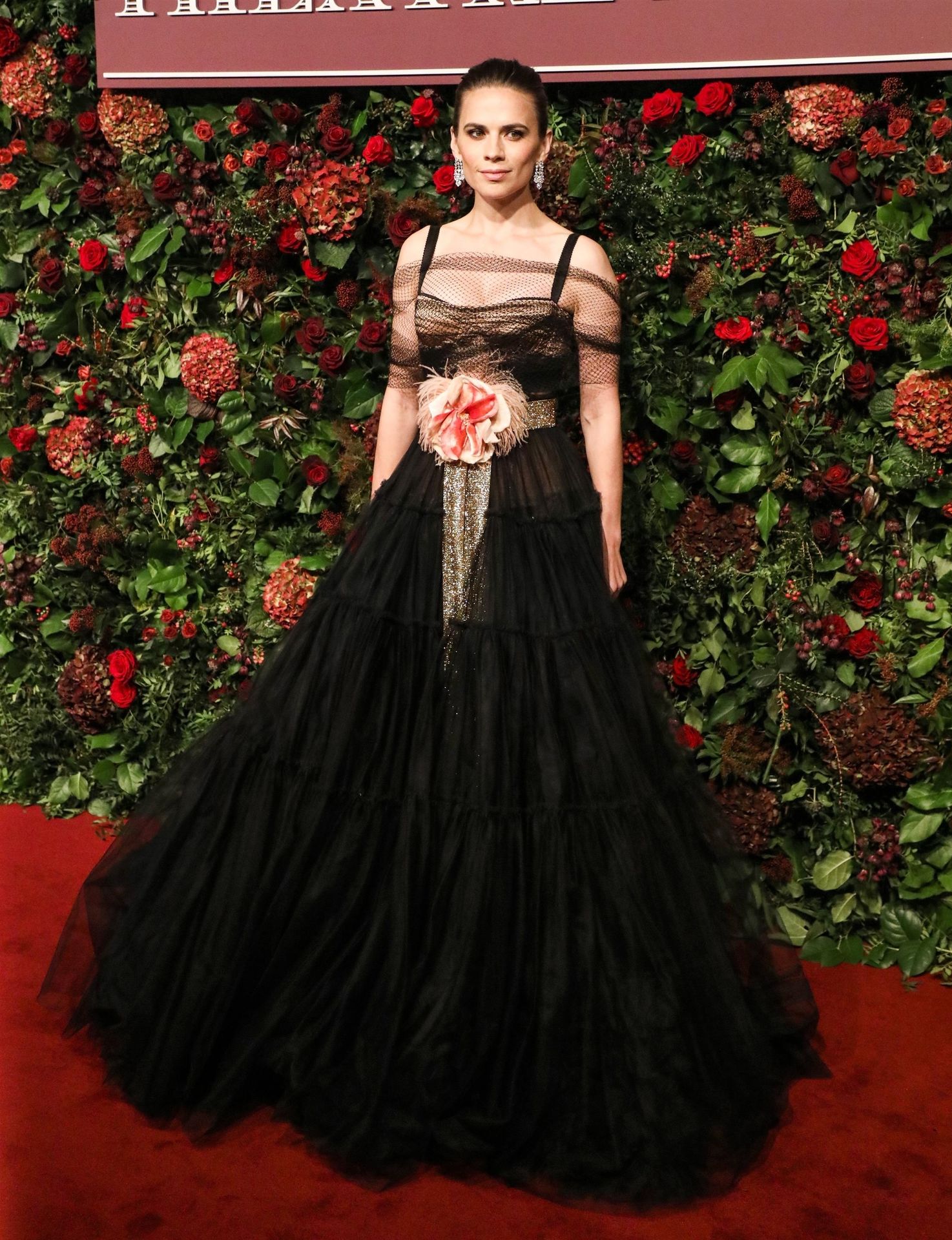 Attrice e star di The Fappening Hayley Atwell mostra la pelle con un vestito a rete mentre arriva fuori dagli arrivi degli Evening Standard Film Awards a Londra, 24/11/2019.