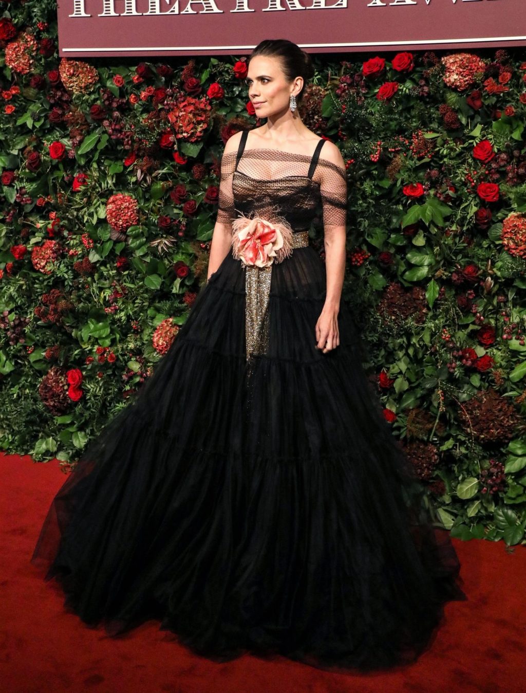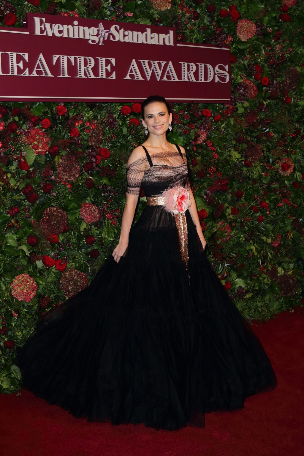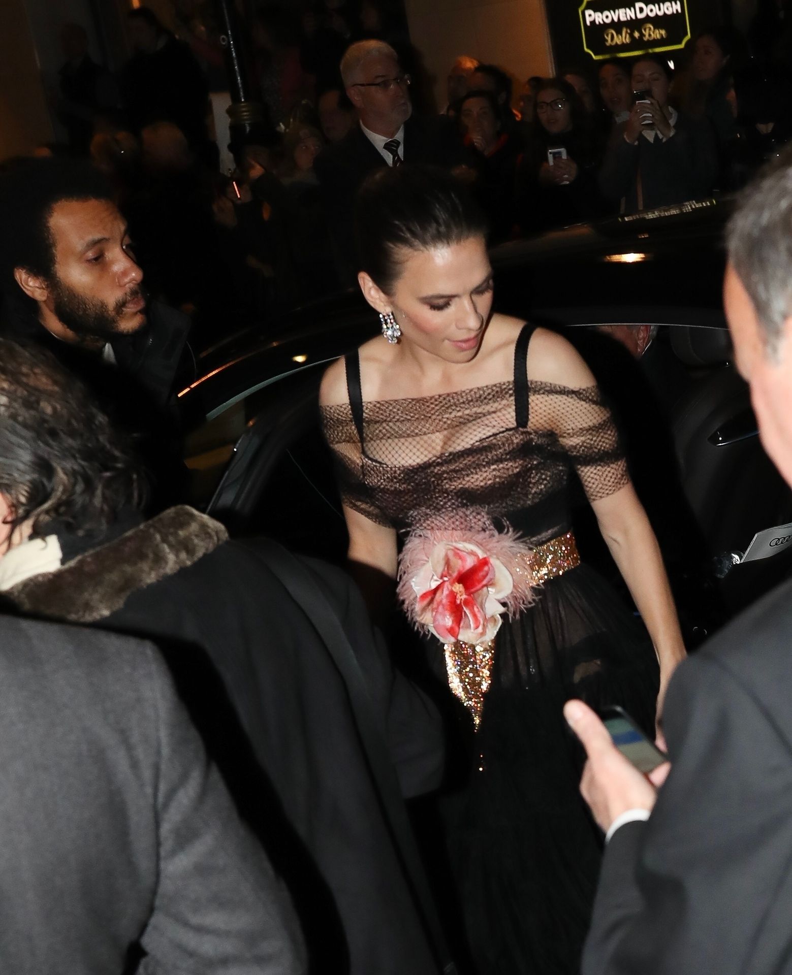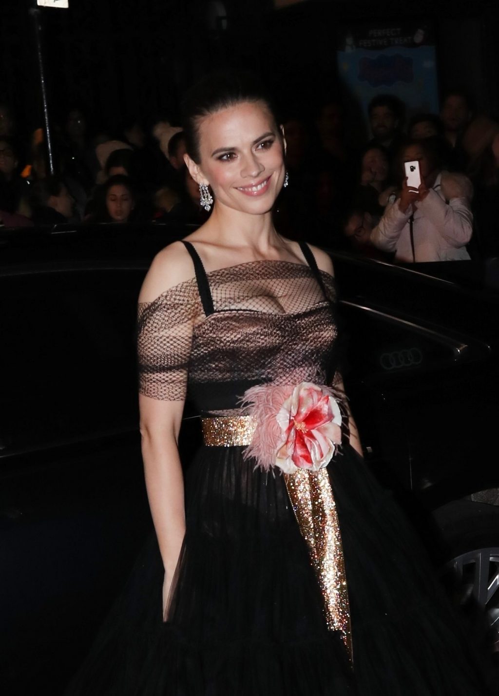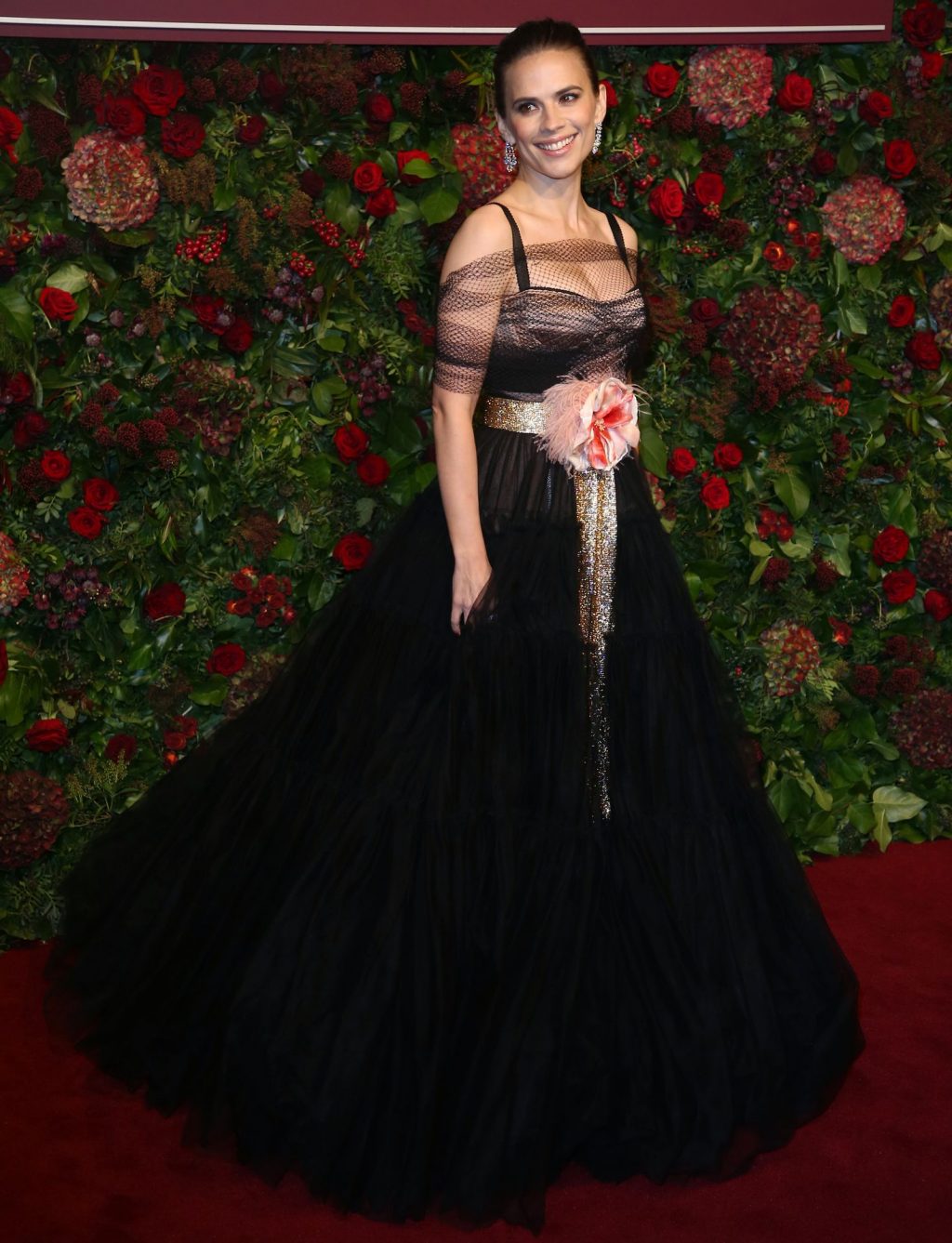 Attrice e star di The Fappening Hayley Atwell mostra la pelle con un vestito a rete mentre arriva fuori dagli arrivi degli Evening Standard Film Awards a Londra, 24/11/2019.