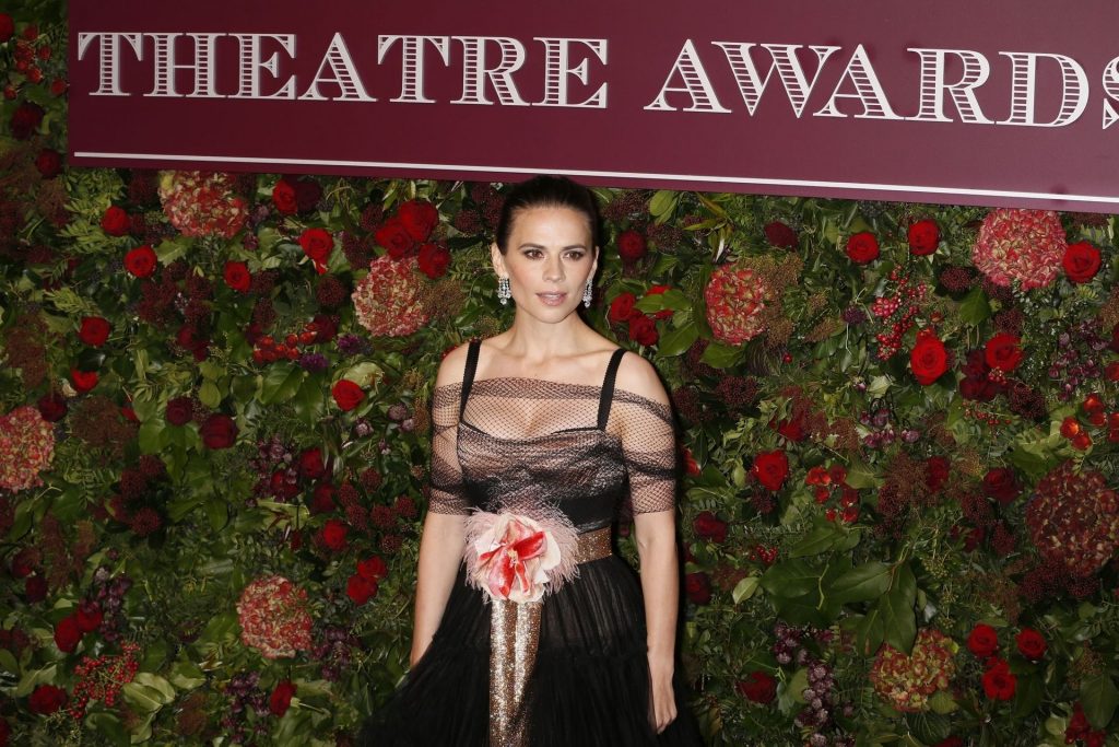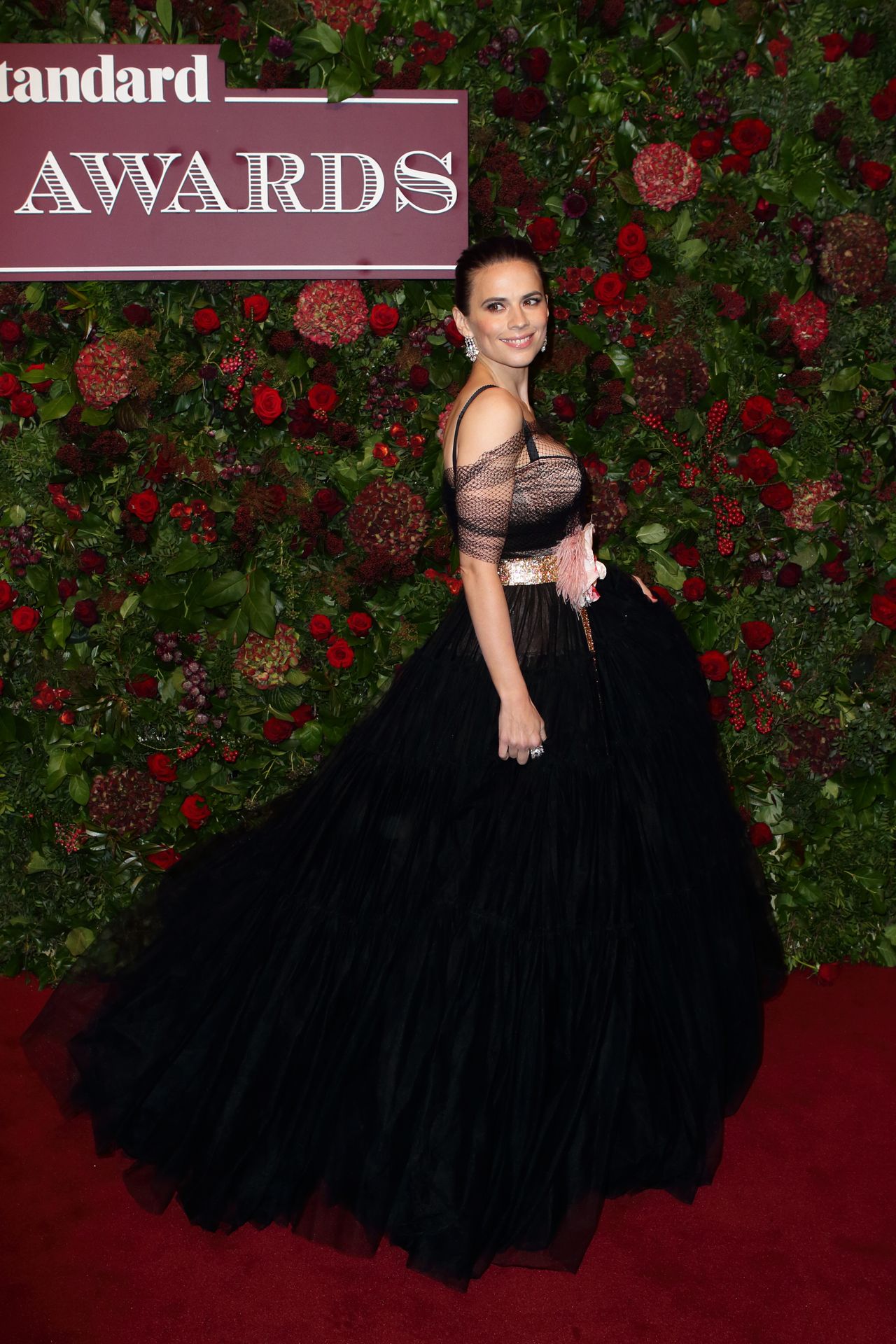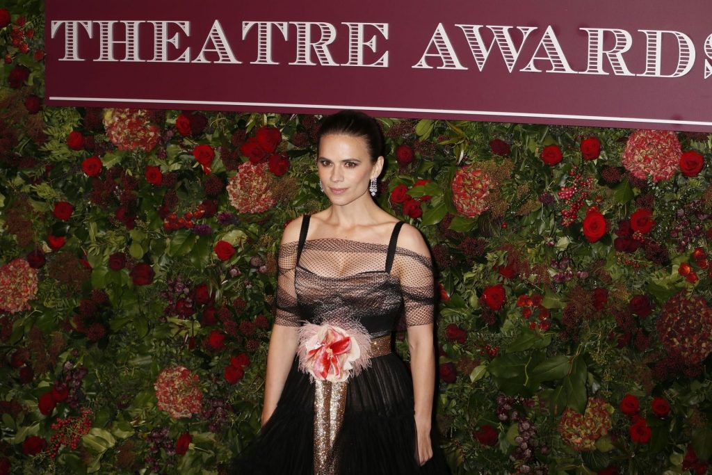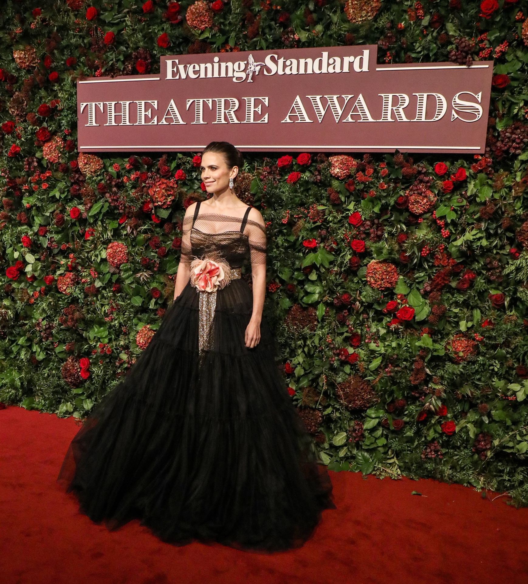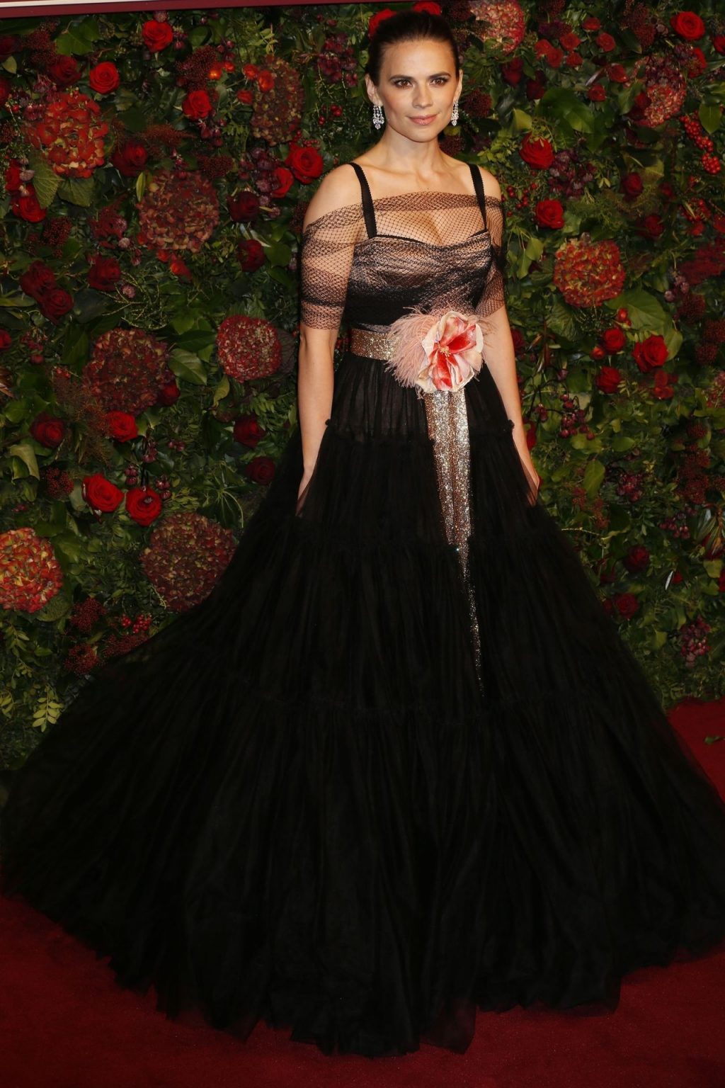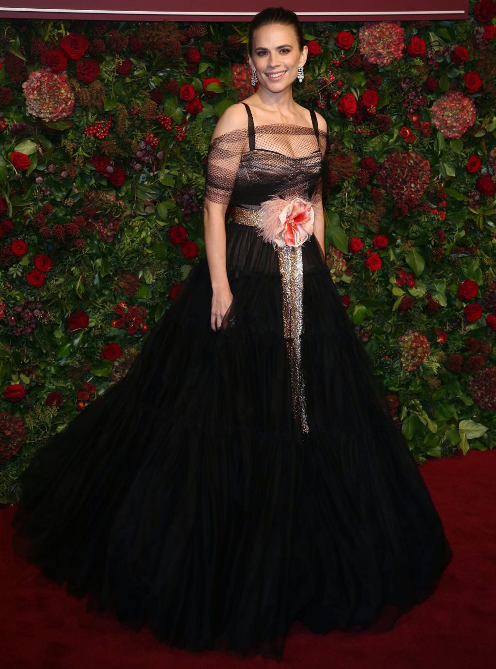 Attrice e star di The Fappening Hayley Atwell mostra la pelle con un vestito a rete mentre arriva fuori dagli arrivi degli Evening Standard Film Awards a Londra, 24/11/2019.