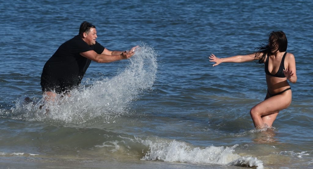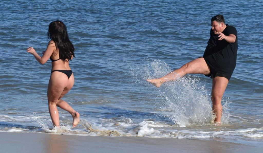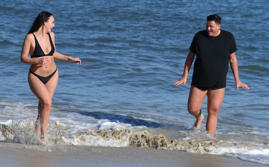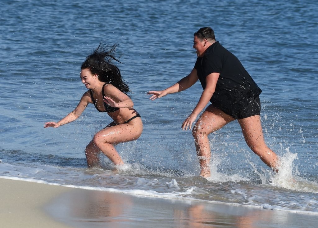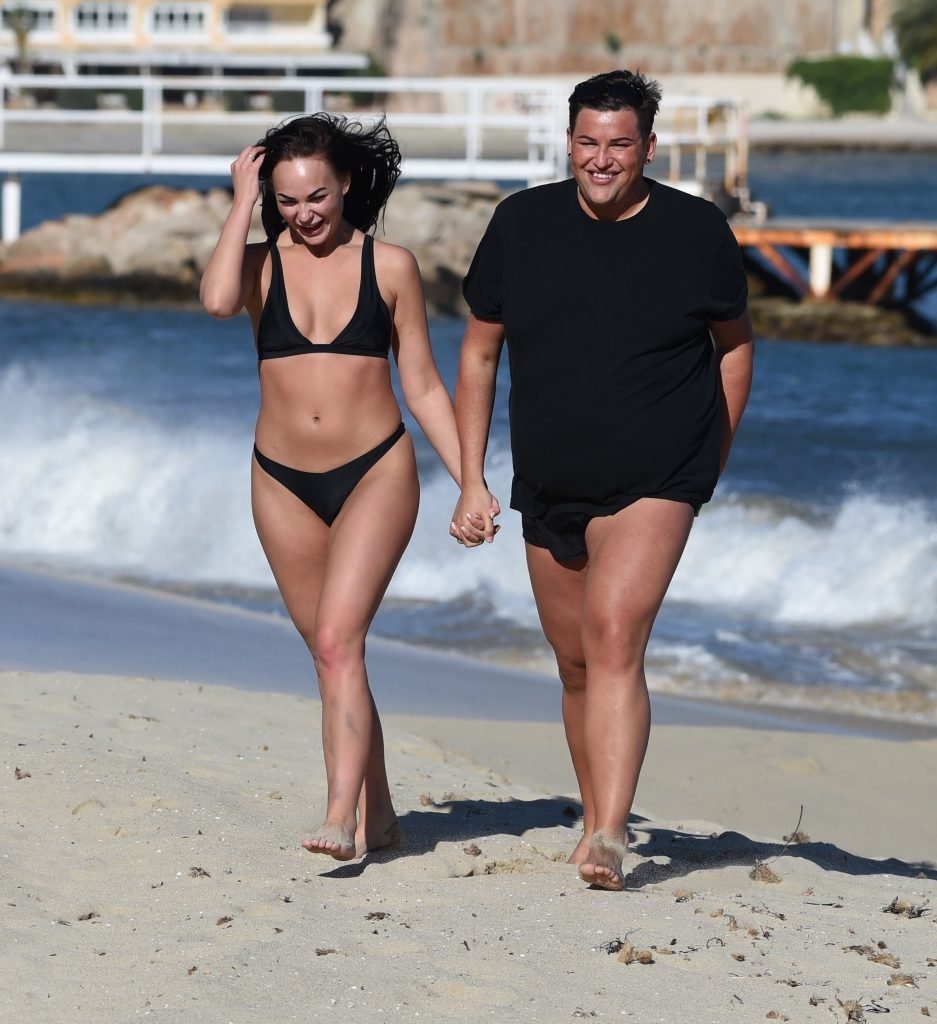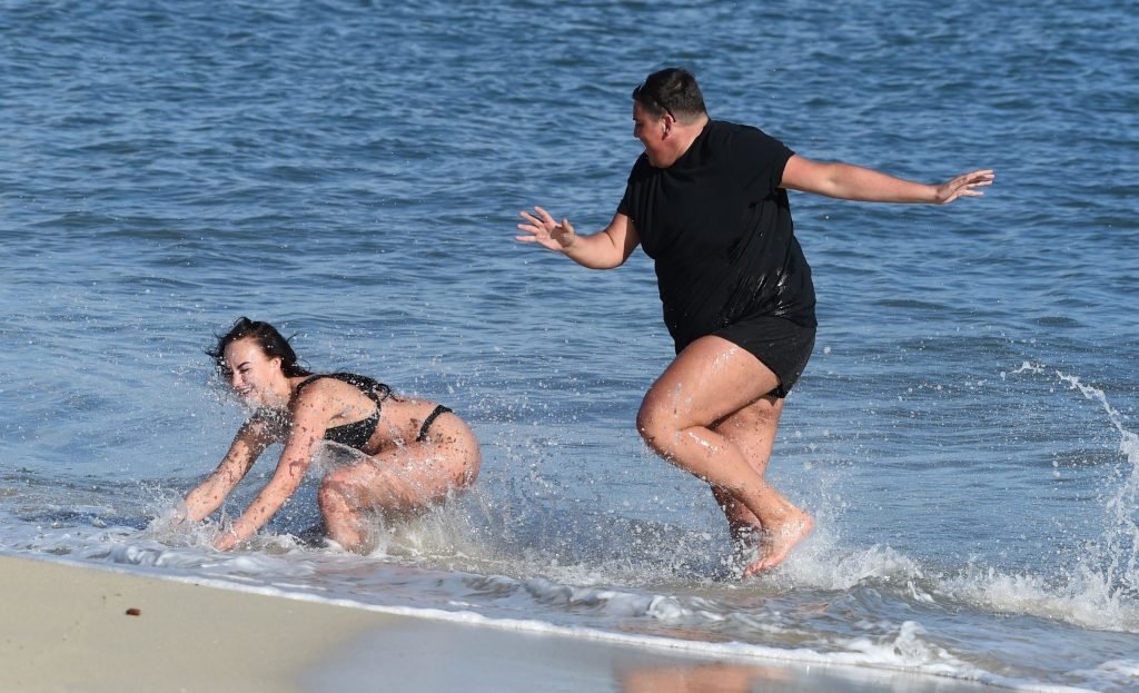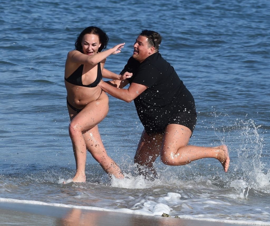 ITV2’s Ibiza Weekender stars David Weekender (David Potts) e Hayley Fanshaw, 20 anni, si divertono sulla spiaggia godendosi il sole a Magaluf, Maiorca, Spagna, 16/04/2018.