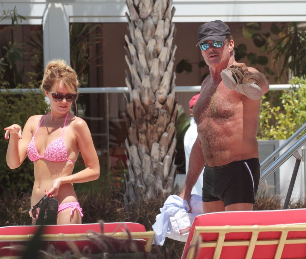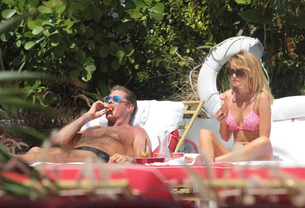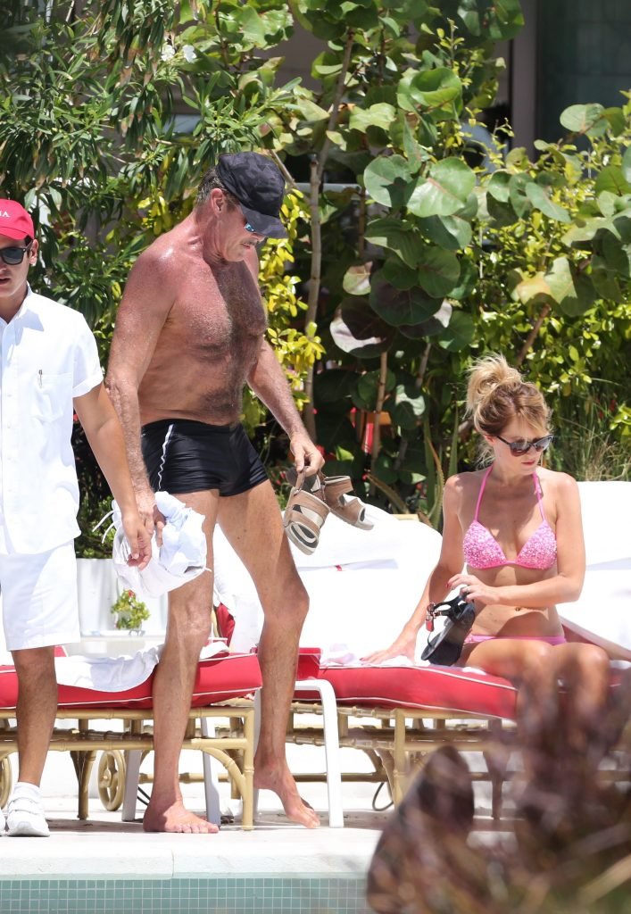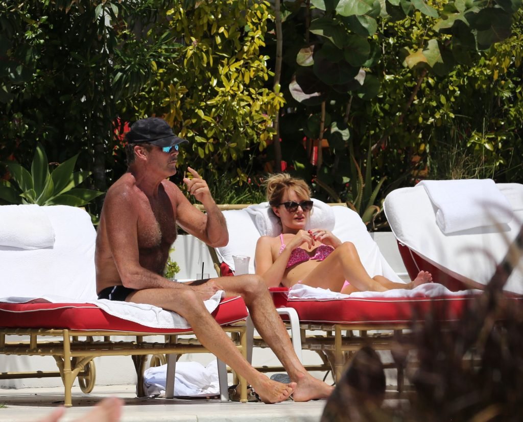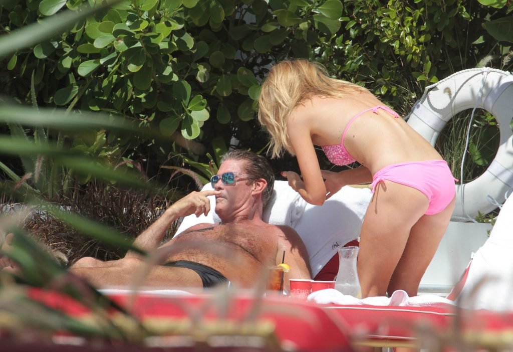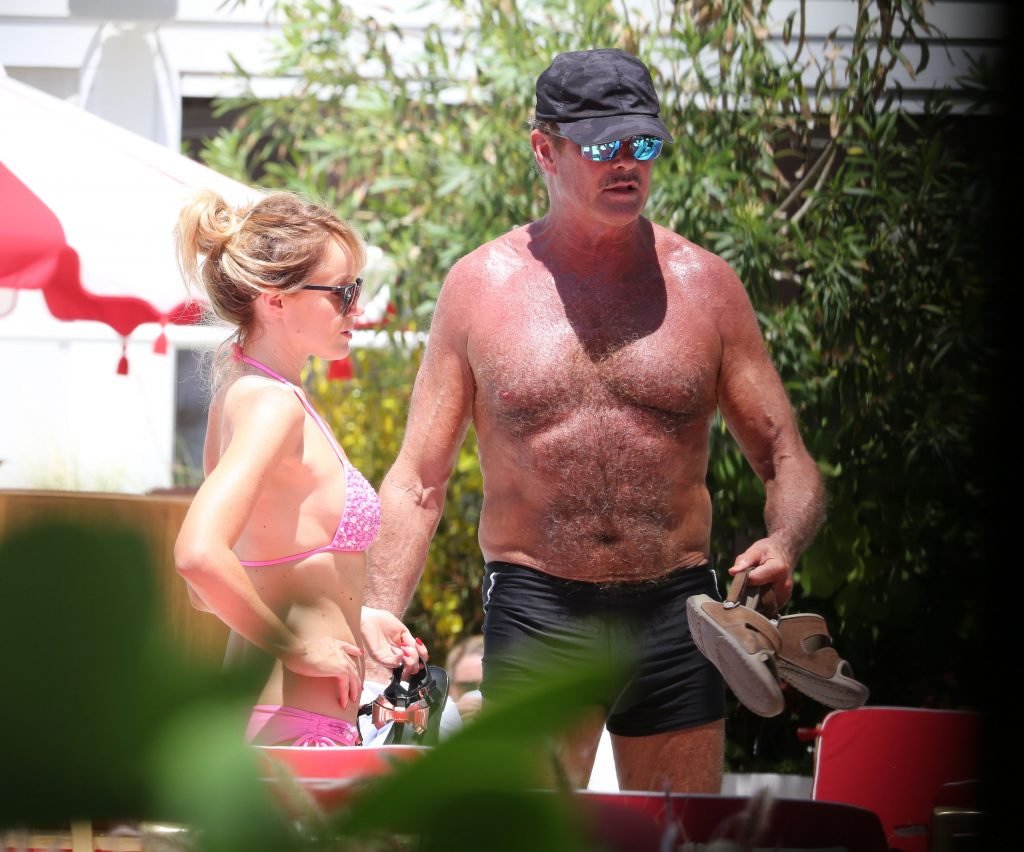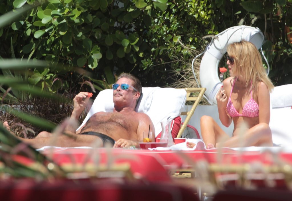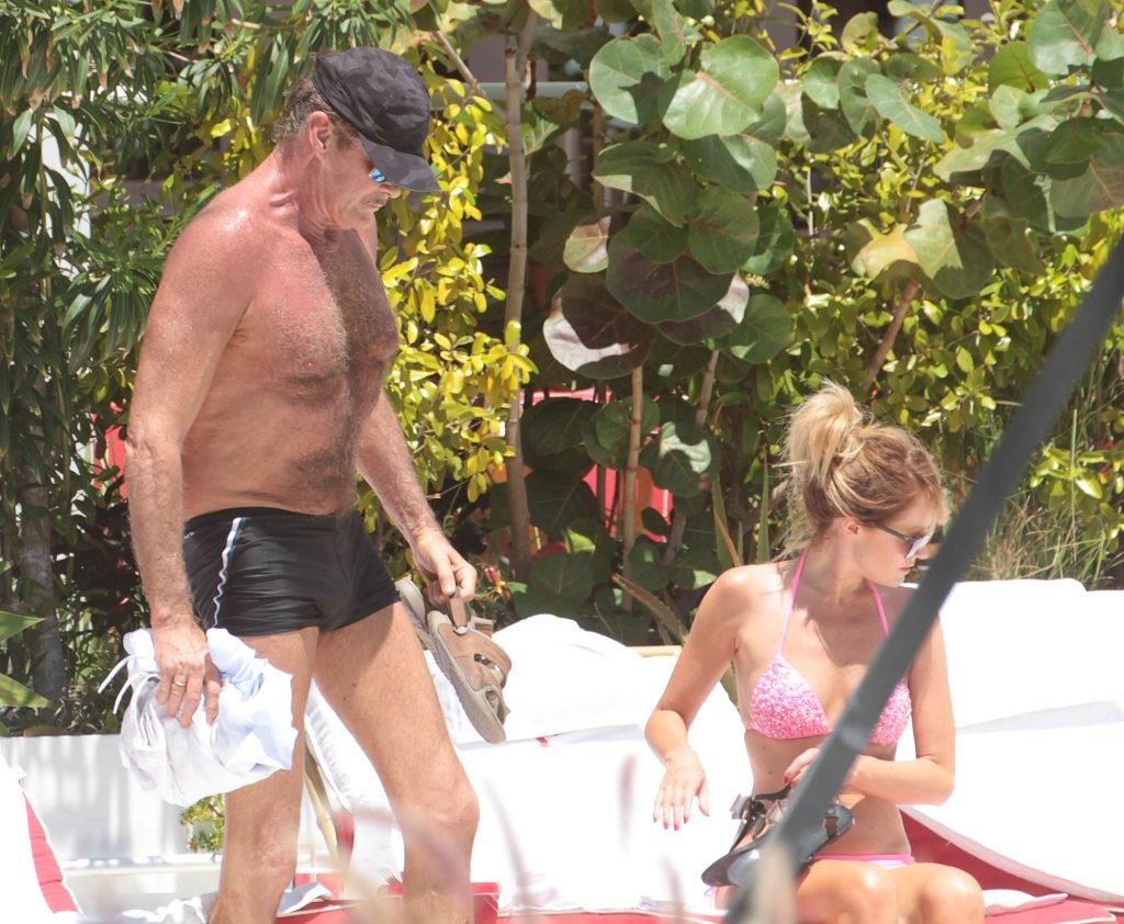 Hayley Roberts e David Hasselhoff trascorrono una giornata sulla spiaggia a Miami, 15/05/2017. Hayley Roberts è una modella americana. Età: 36.