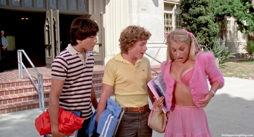 Heather Thomas is talking with some guys out in front of their school as one of the guy stares at her breasts in a fluffy pink sweater before suddenly her sweater bursts open revealing her cleavage in a pink bra as she freaks out trying to cover herself back up and then gets lead away by a third guy just as her sweater flies back open again showing her bra and cleavage once more.