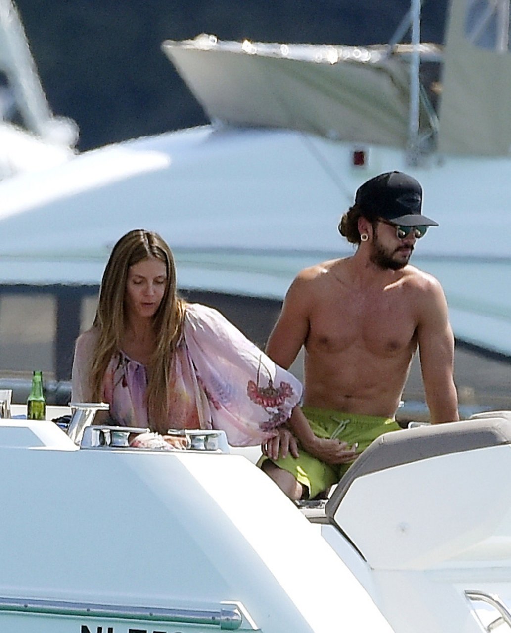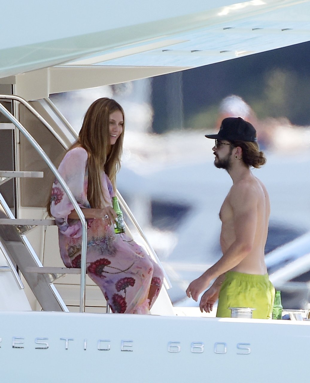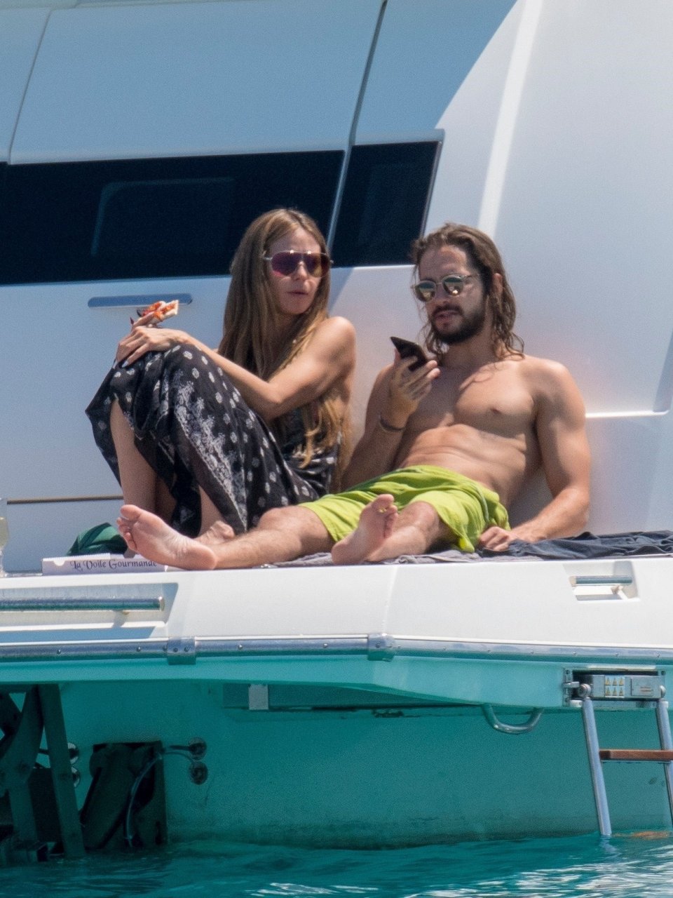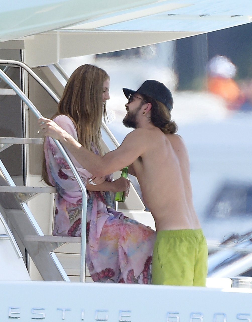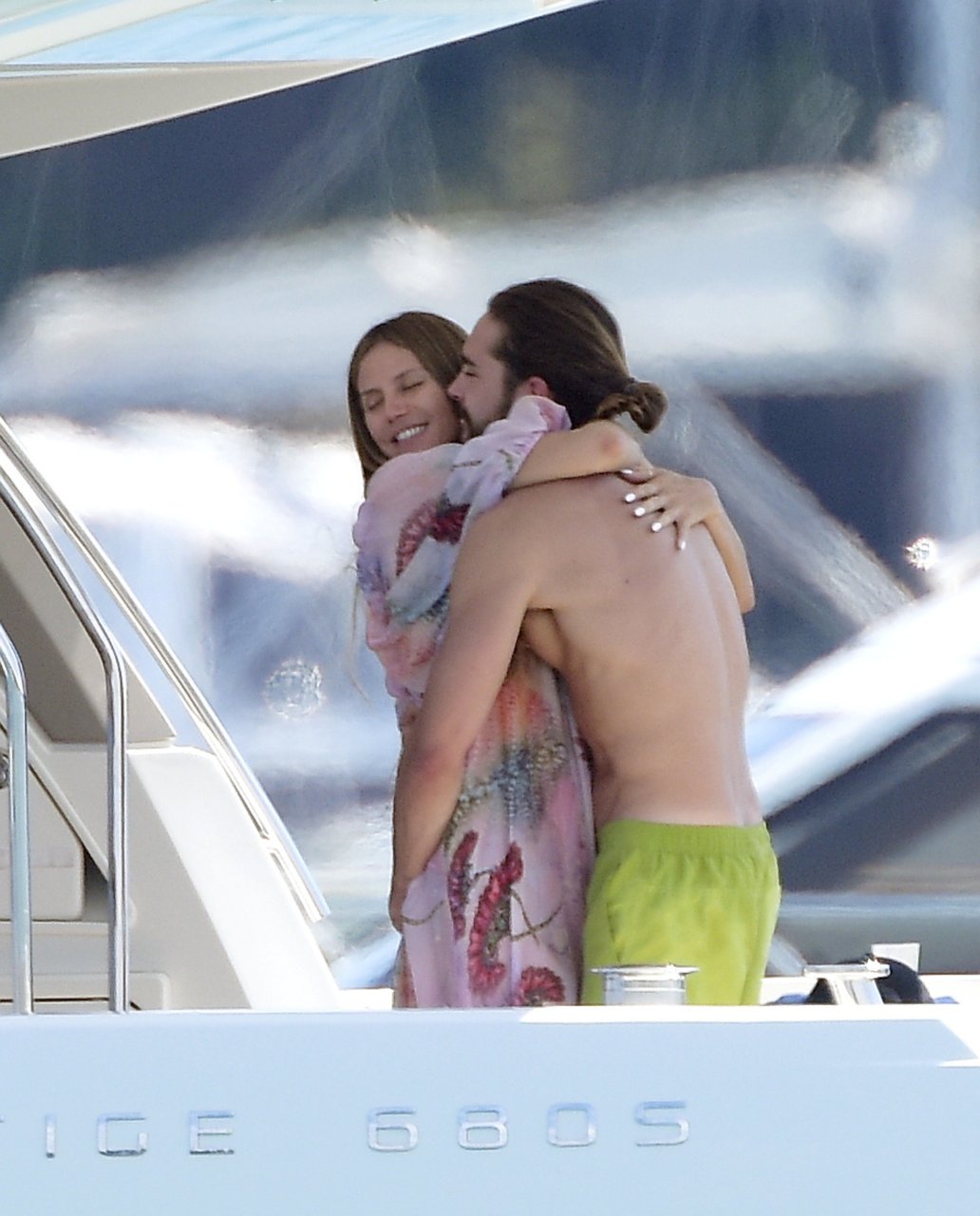 German supermodel, TV presonality Heidi Klum, 44, e il suo nuovo fidanzato Tom Kaulitz ordinano una pizza su una barca a Cannes, 19/05/2018. La coppia innamorata si è baciata mentre si rilassava al sole.