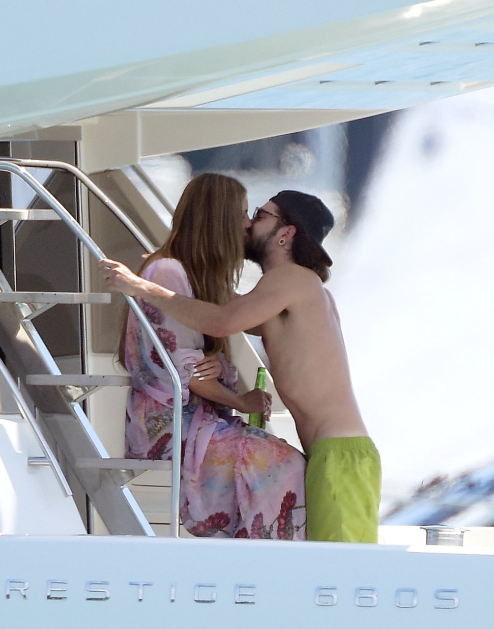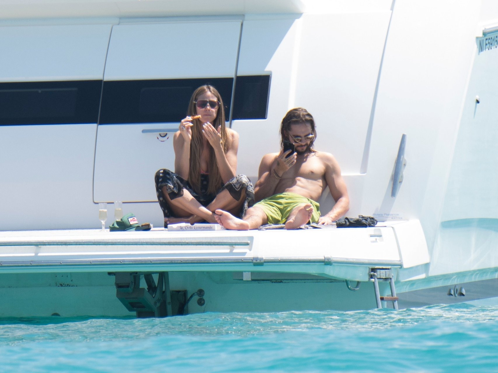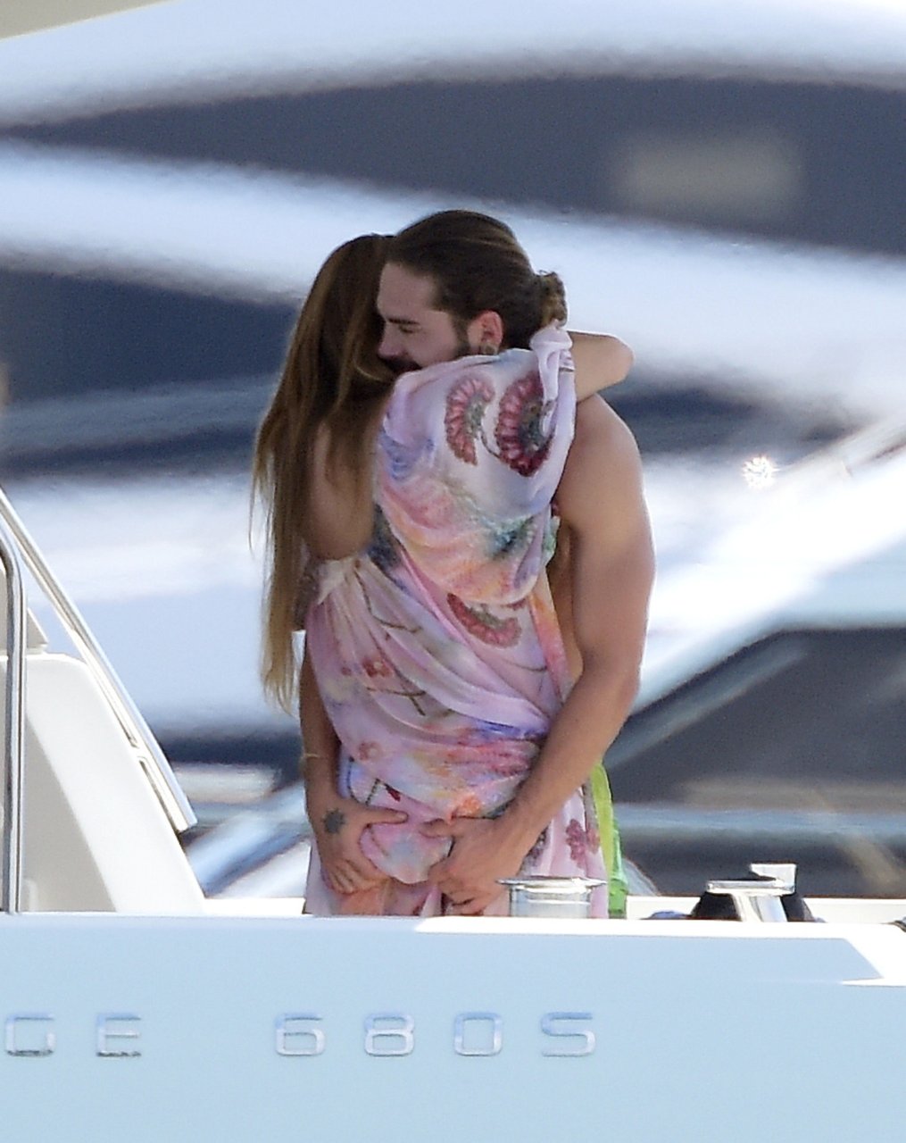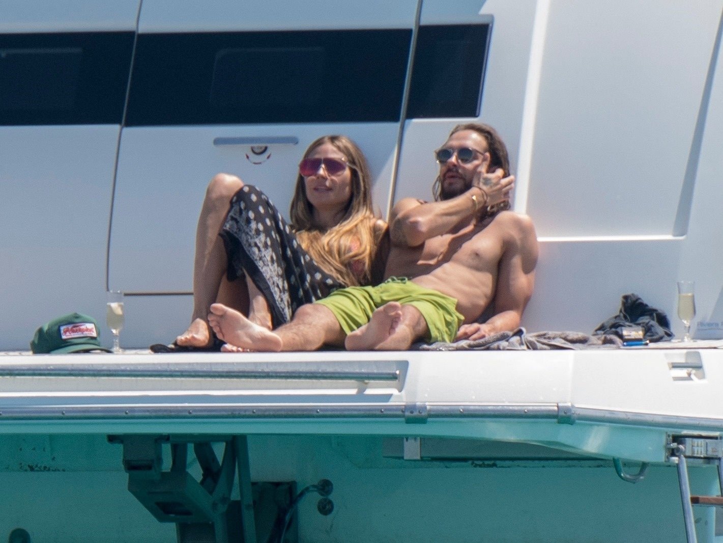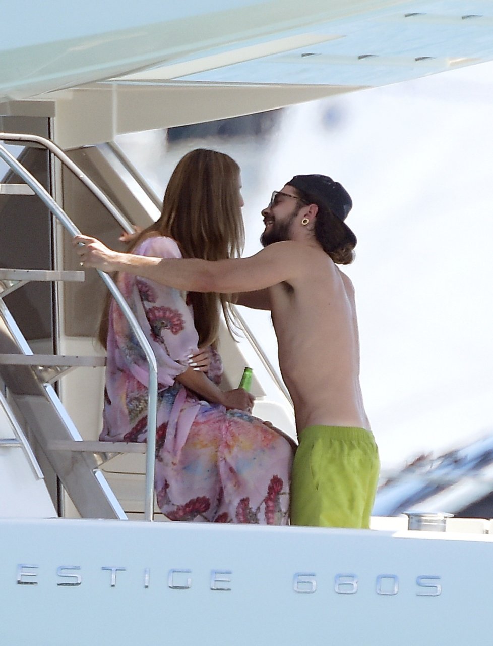 German supermodel, TV presonality Heidi Klum, 44, e il suo nuovo fidanzato Tom Kaulitz ordinano una pizza su una barca a Cannes, 19/05/2018. La coppia innamorata si è baciata mentre si rilassava al sole.