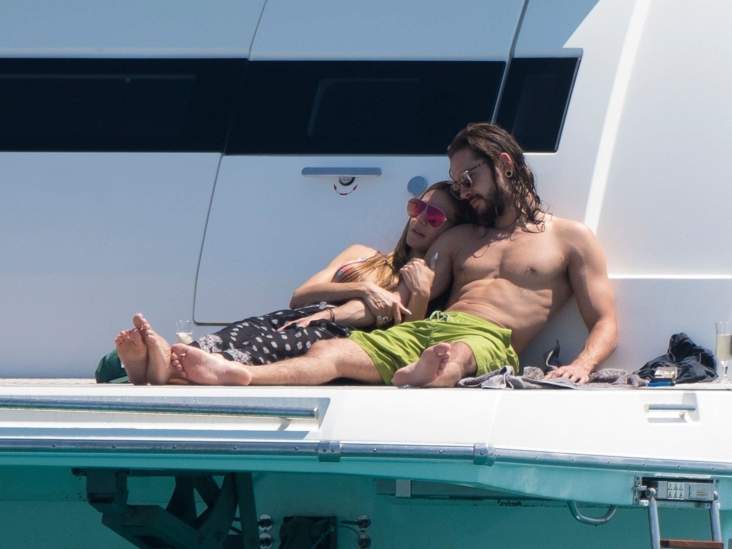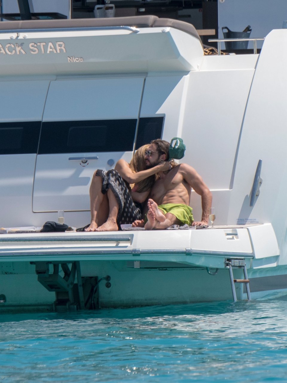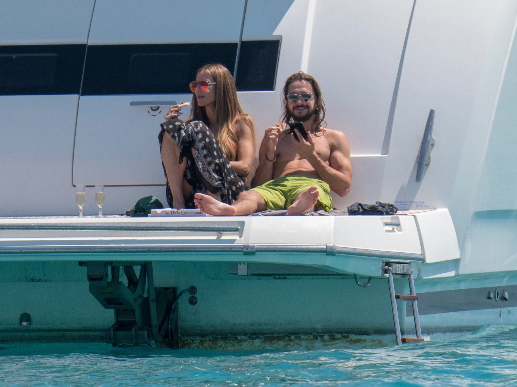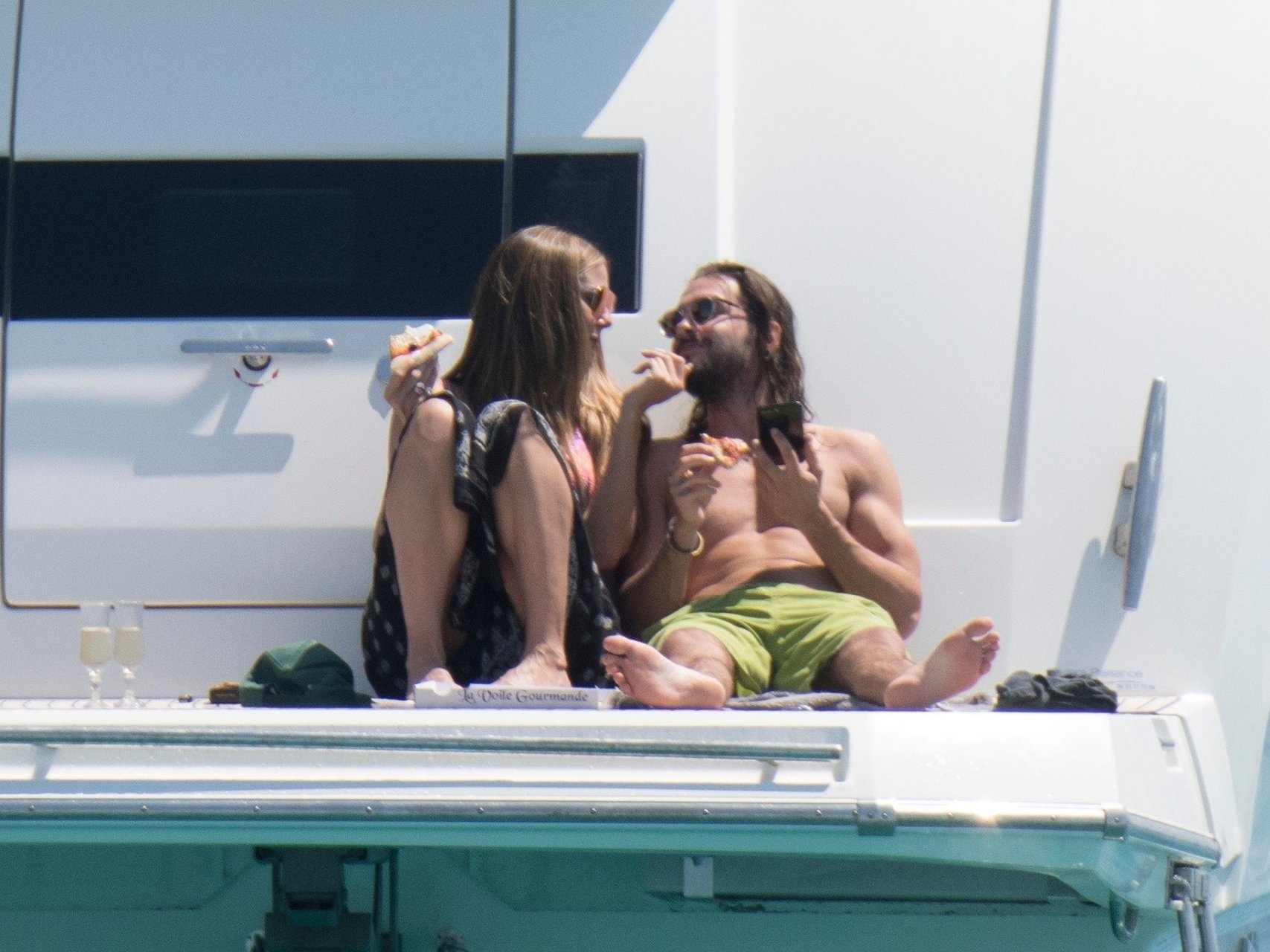 German supermodel, TV presonality Heidi Klum, 44, e il suo nuovo fidanzato Tom Kaulitz ordinano una pizza su una barca a Cannes, 19/05/2018. La coppia innamorata si è baciata mentre si rilassava al sole.