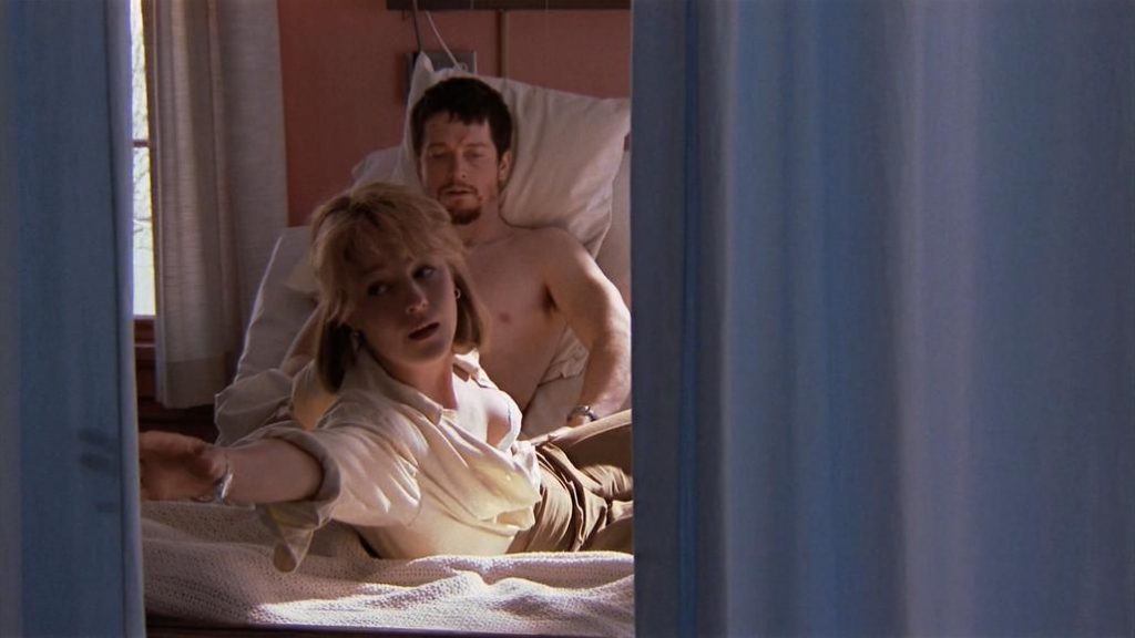 Helen Hunt in reggiseno con camicia aperta mentre si bacia con un uomo su un letto d’ospedale, e lui apre la sua gonna per rivelare le sue mutandine e poi la stimola con le dita.