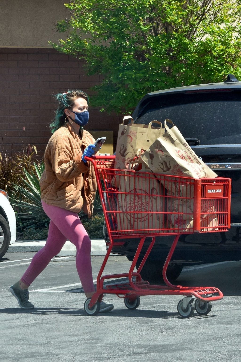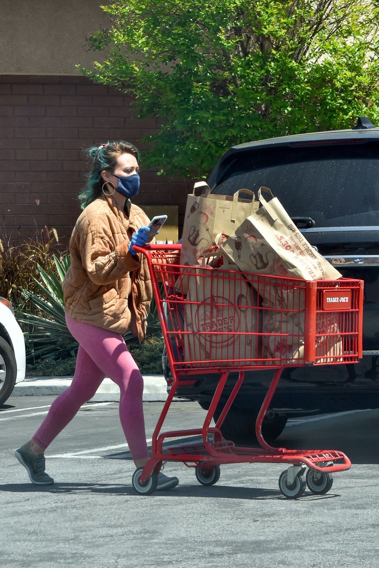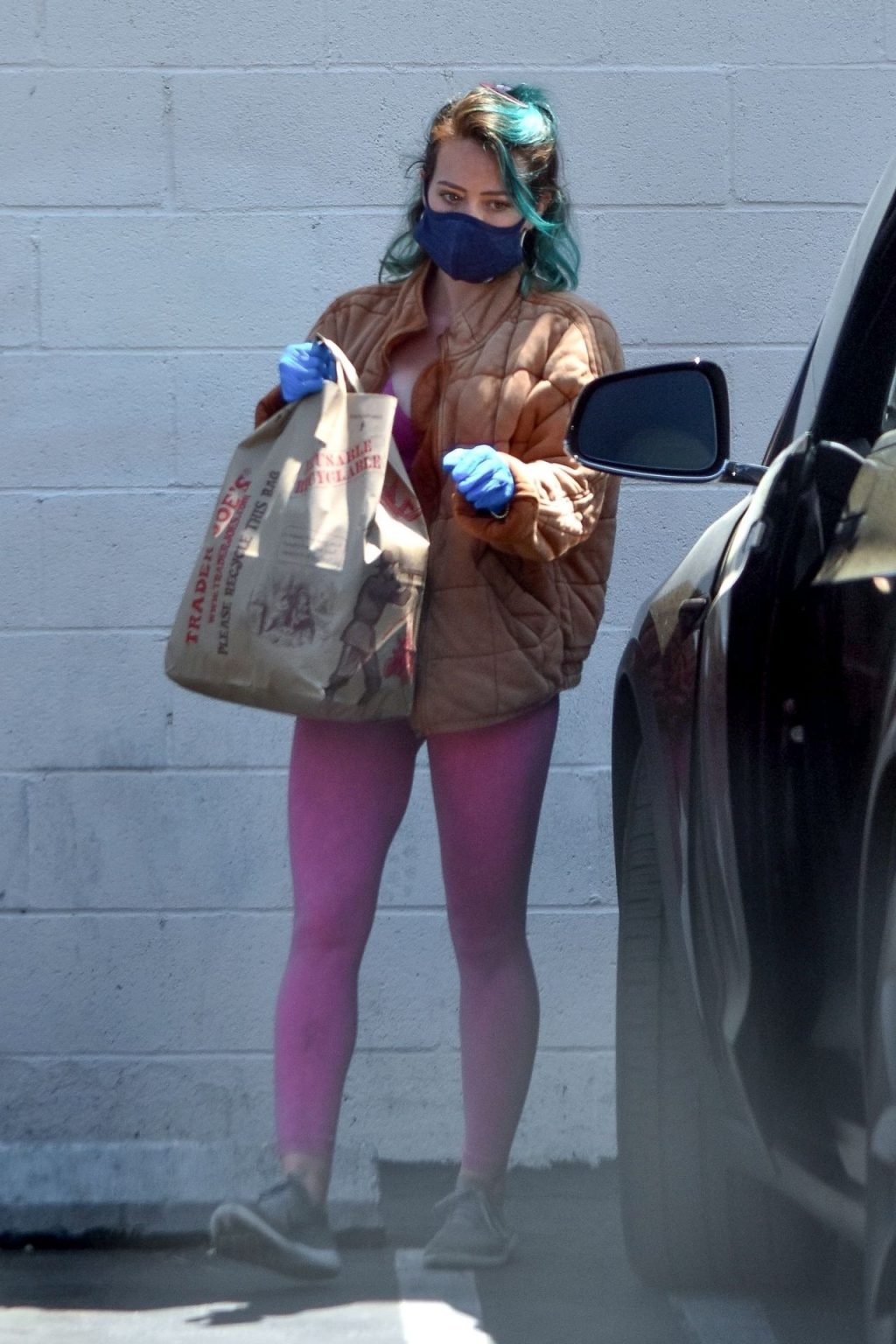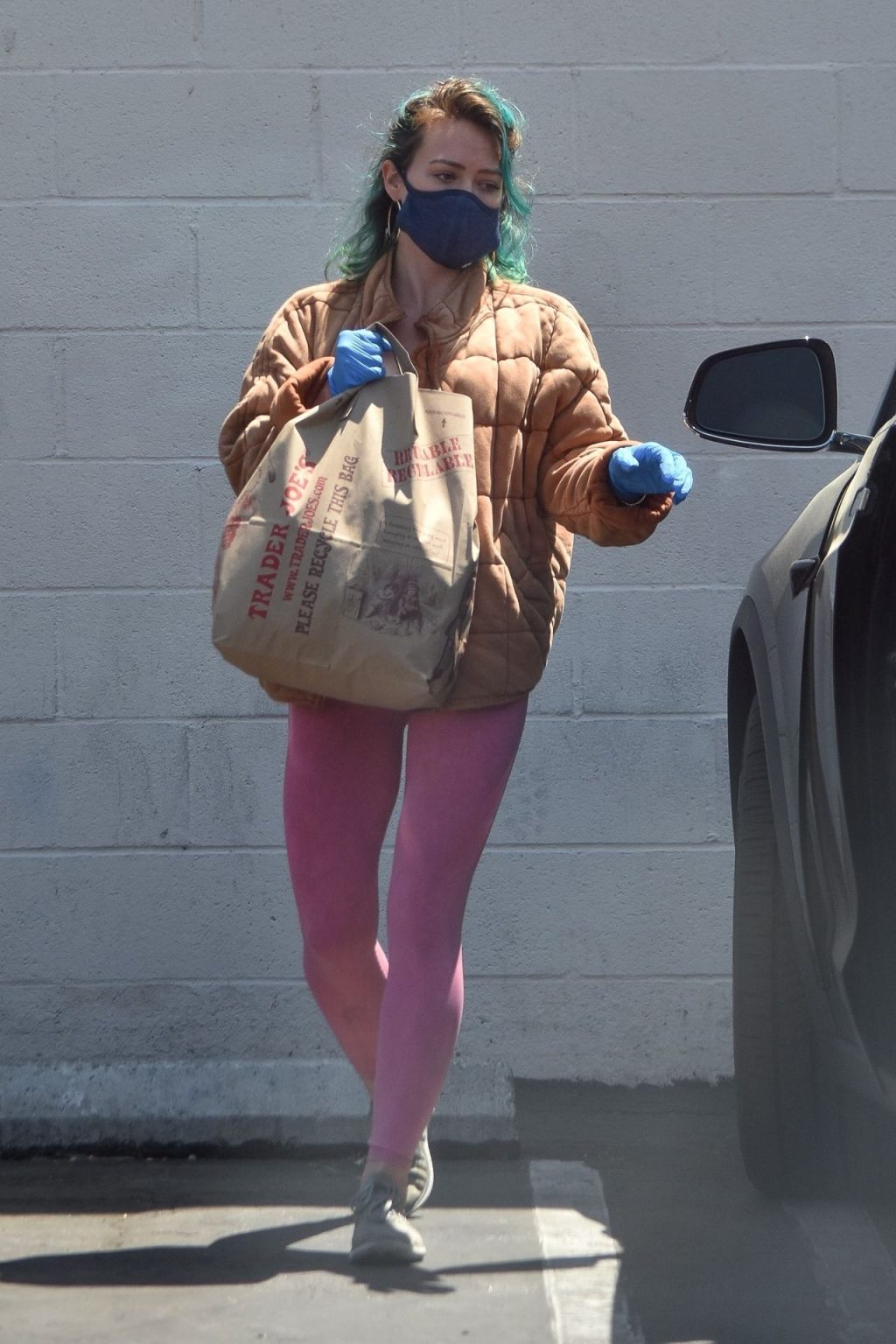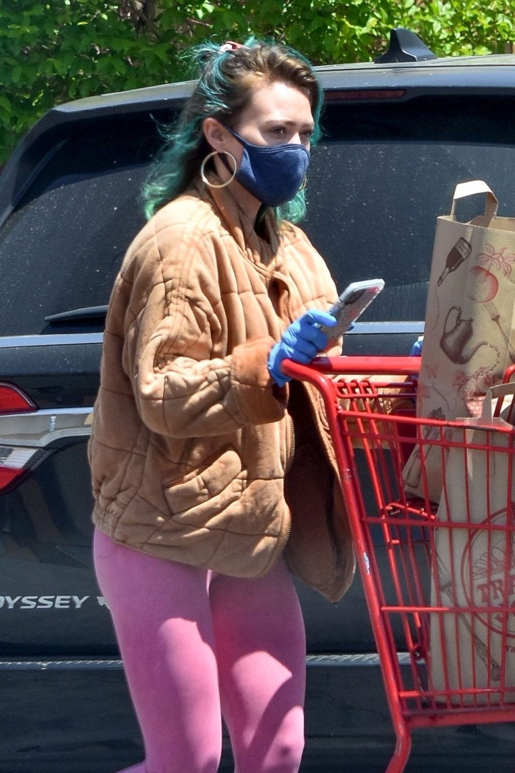 ‘Lizzie McGuire’ alumna Hilary Duff sfoggiava un’acconciatura blu e verde mentre faceva la spesa da Trader Joe’s a Studio City, 30/04/2020.