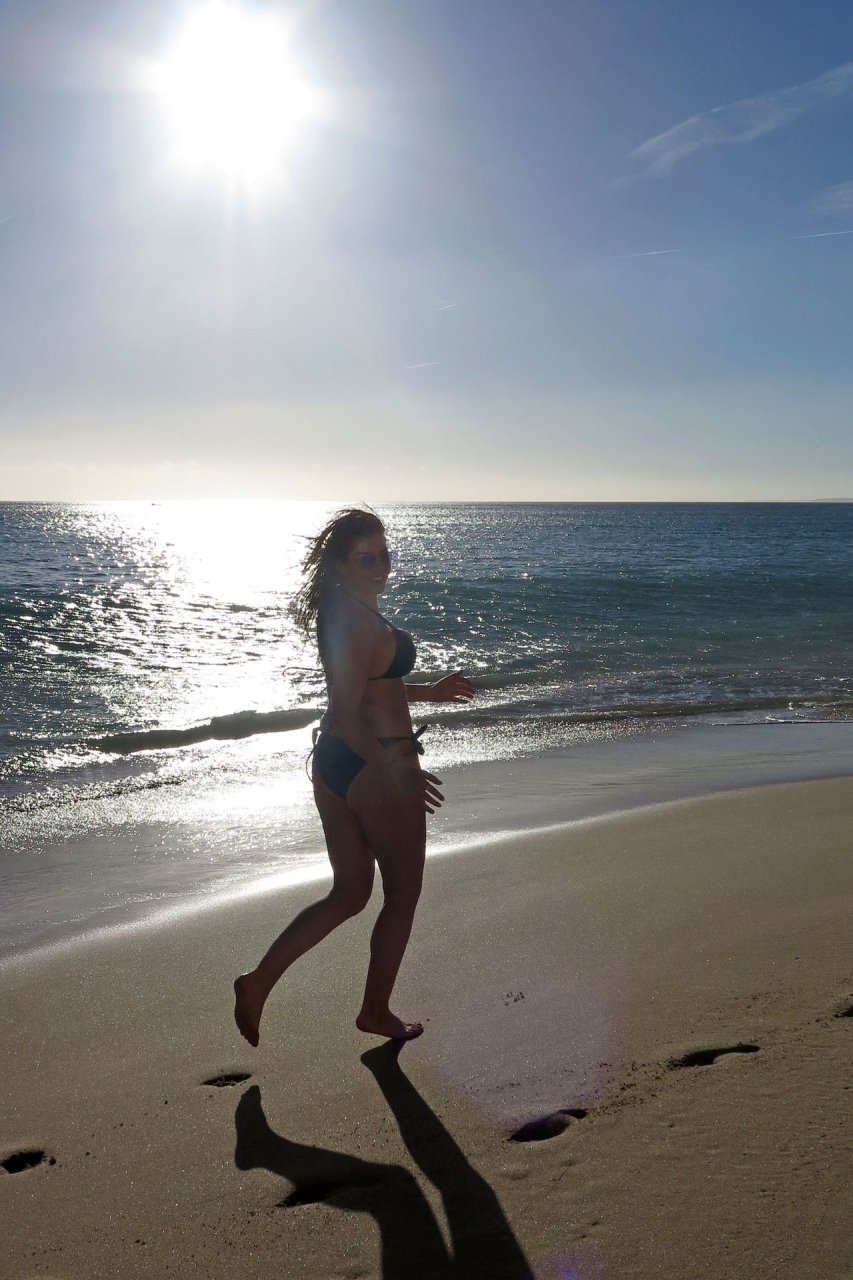 Imogen Thomas appare sensazionale in un bikini teal Chasing Summer mentre mostra le sue impressionanti abilità ginniche sulla spiaggia (2019).