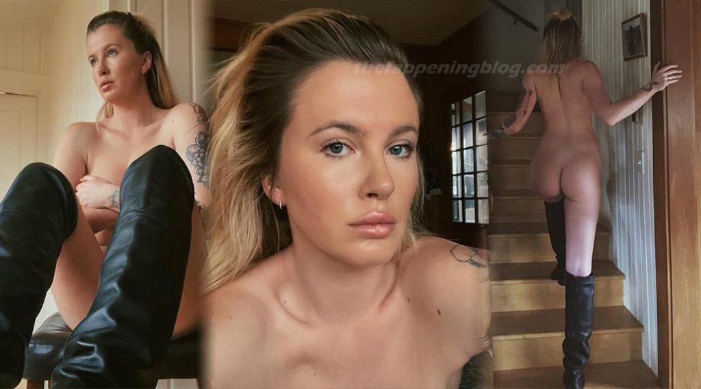La modella americana Ireland Baldwin mostra il suo corpo nudo e il sedere rotondo, posando con stivali neri a casa in un photoshoot autoprodotto per i social media (2021).