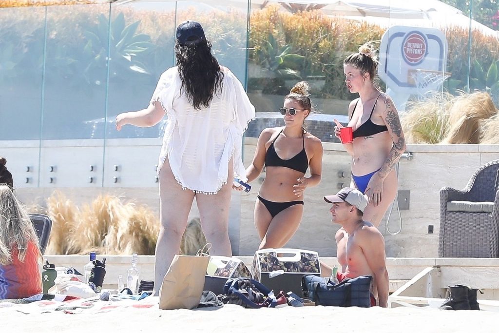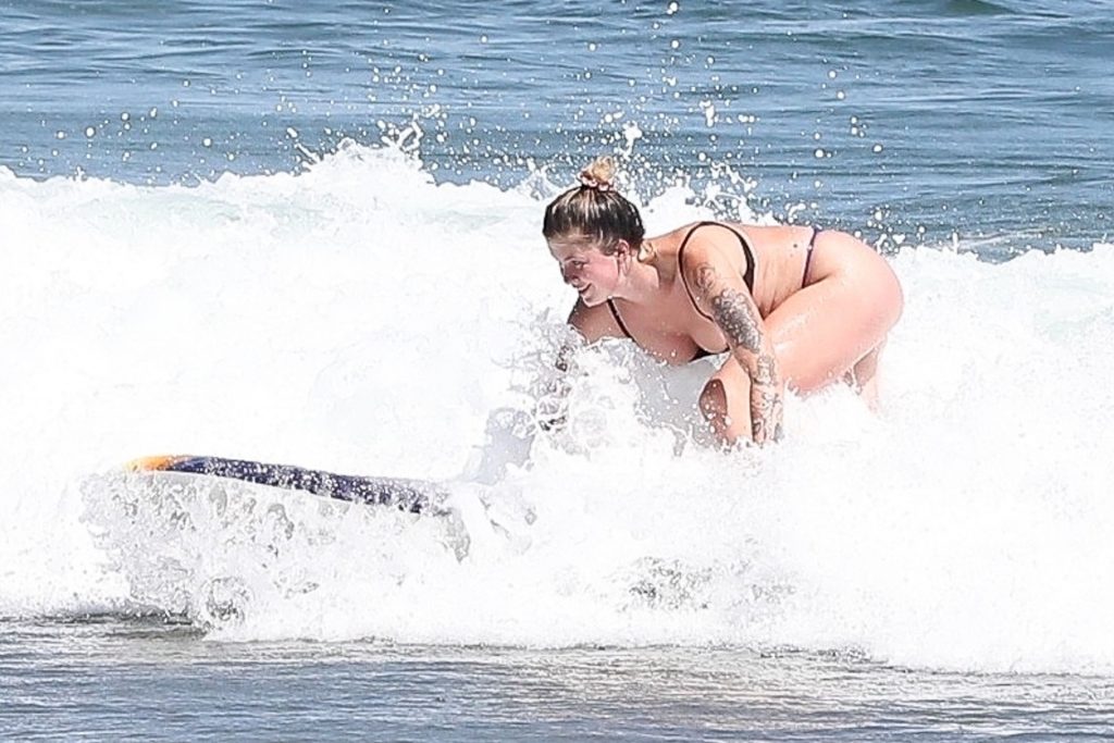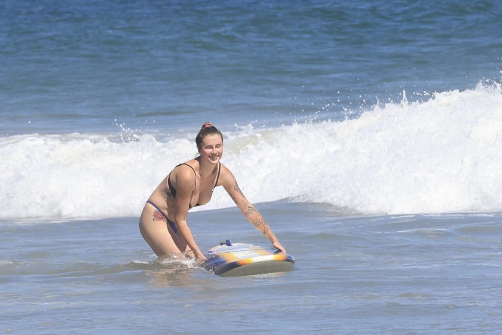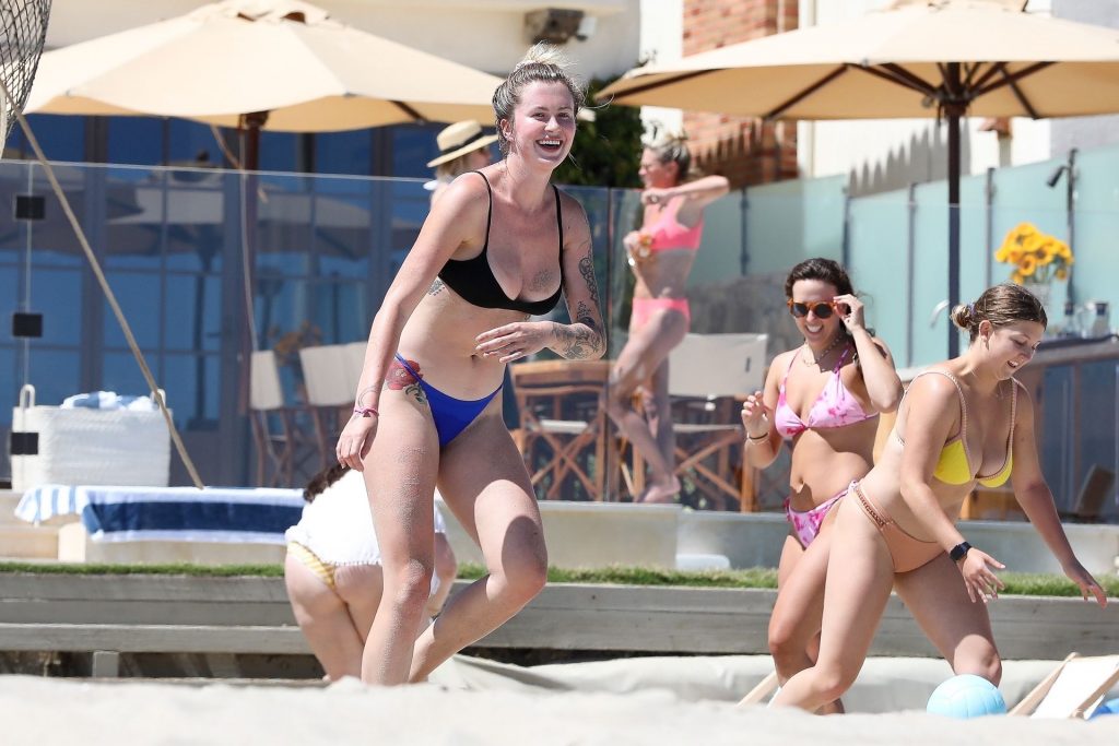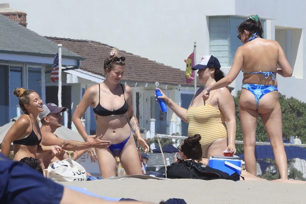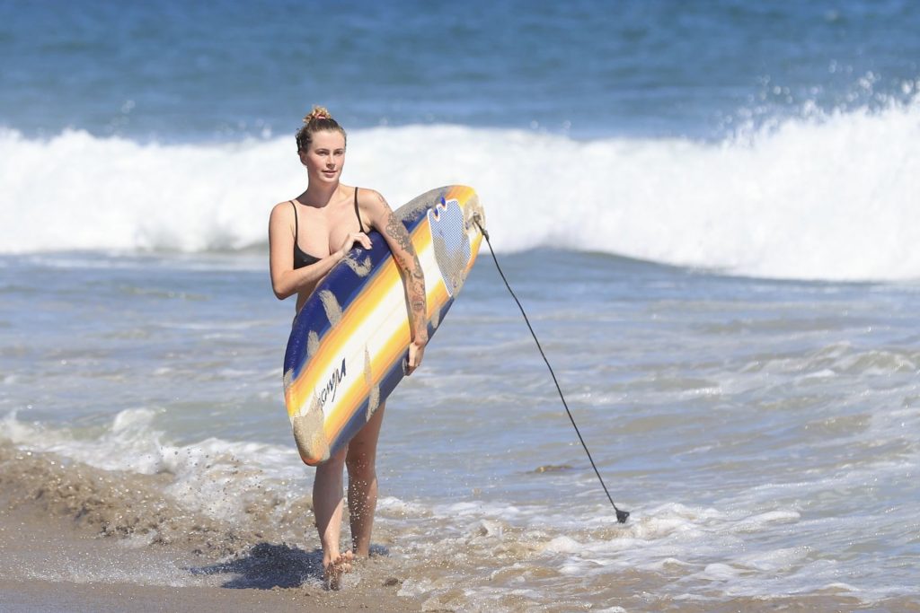 Ireland Baldwin mostra le sue curve mentre si diverte in spiaggia con i suoi amici bevendo, giocando a pallavolo e facendo surf – Malibu, 19/07/2020. La modella non ha preso rischi mentre spruzzava con cura la crema solare sul seno prima di andare a divertirsi.