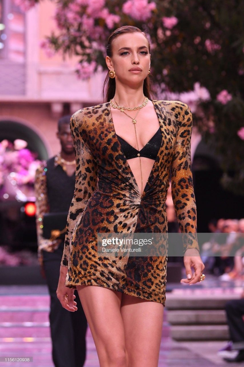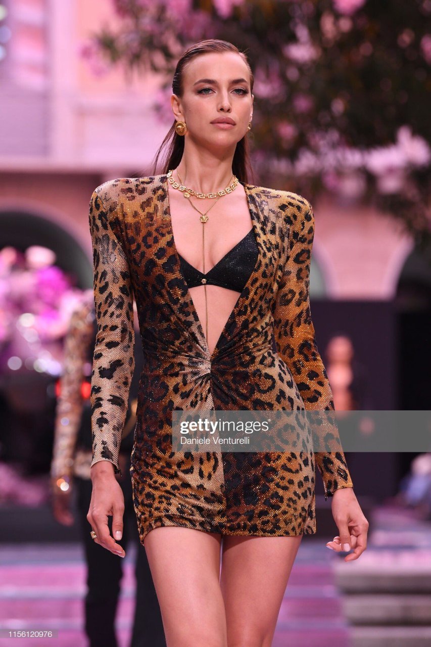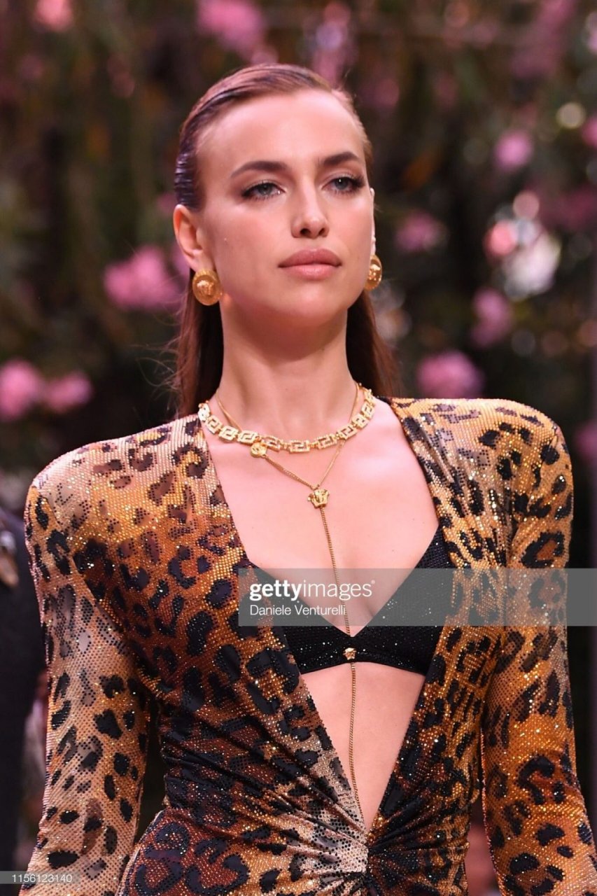 La modella russa Irina Shayk è stata fotografata sulla passerella alla Milano Fashion Week Primavera 2020 di Versace a Milano, 15/06/2019. Oltre all’abbigliamento maschile, le modelle hanno presentato una nuova collezione per donna.