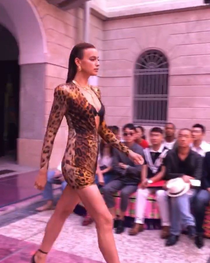 Irina è apparsa allo show con un mini abito leopardato con scollatura profonda, mostrando la sua vita sottile e le gambe sexy!
