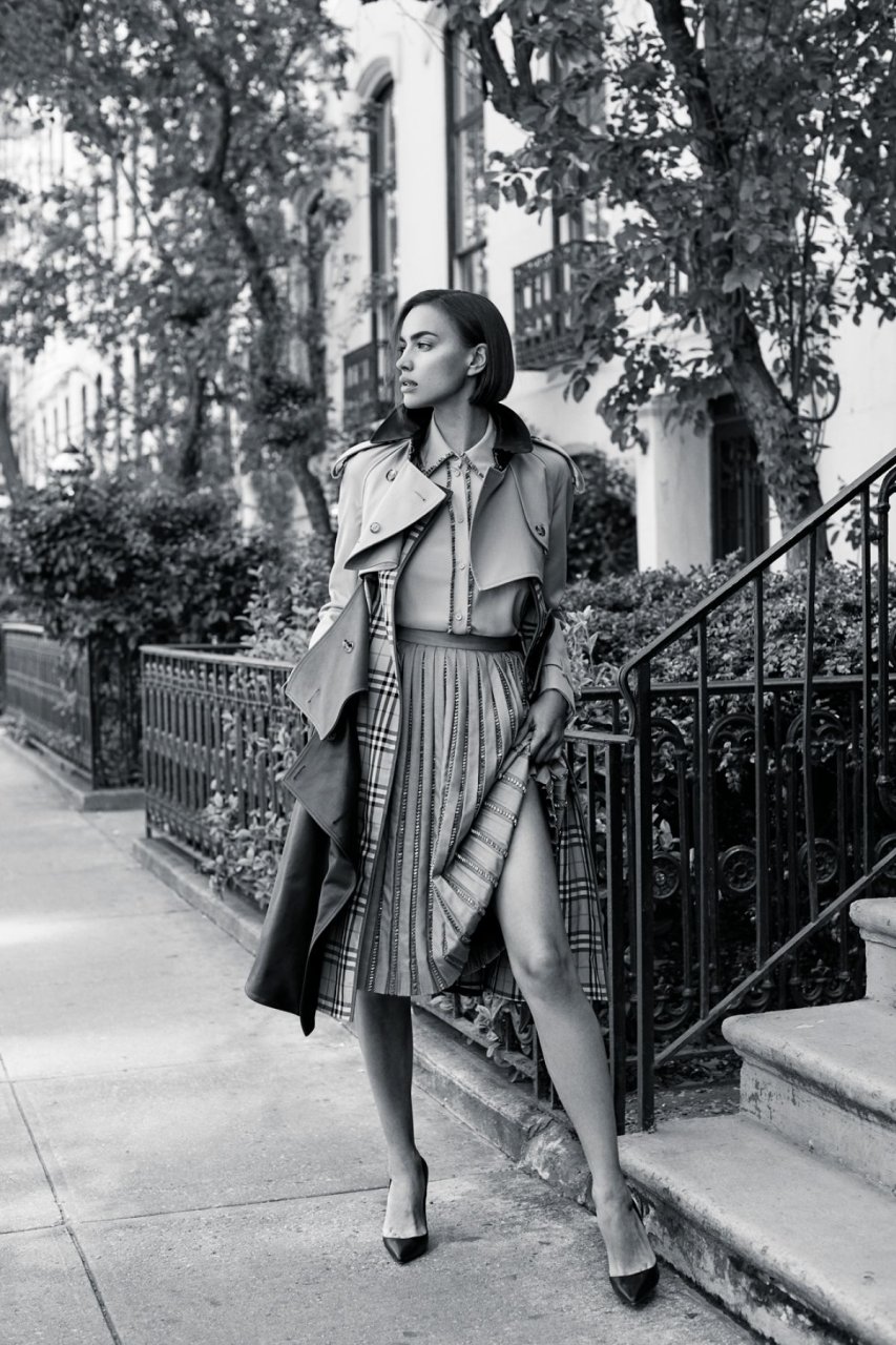 Le immagini accompagnatorie includono look glamour curati da Charles Varenne. Irina indossa un guardaroba con marchi come Burberry, Bulgari e Carolina Herrera.