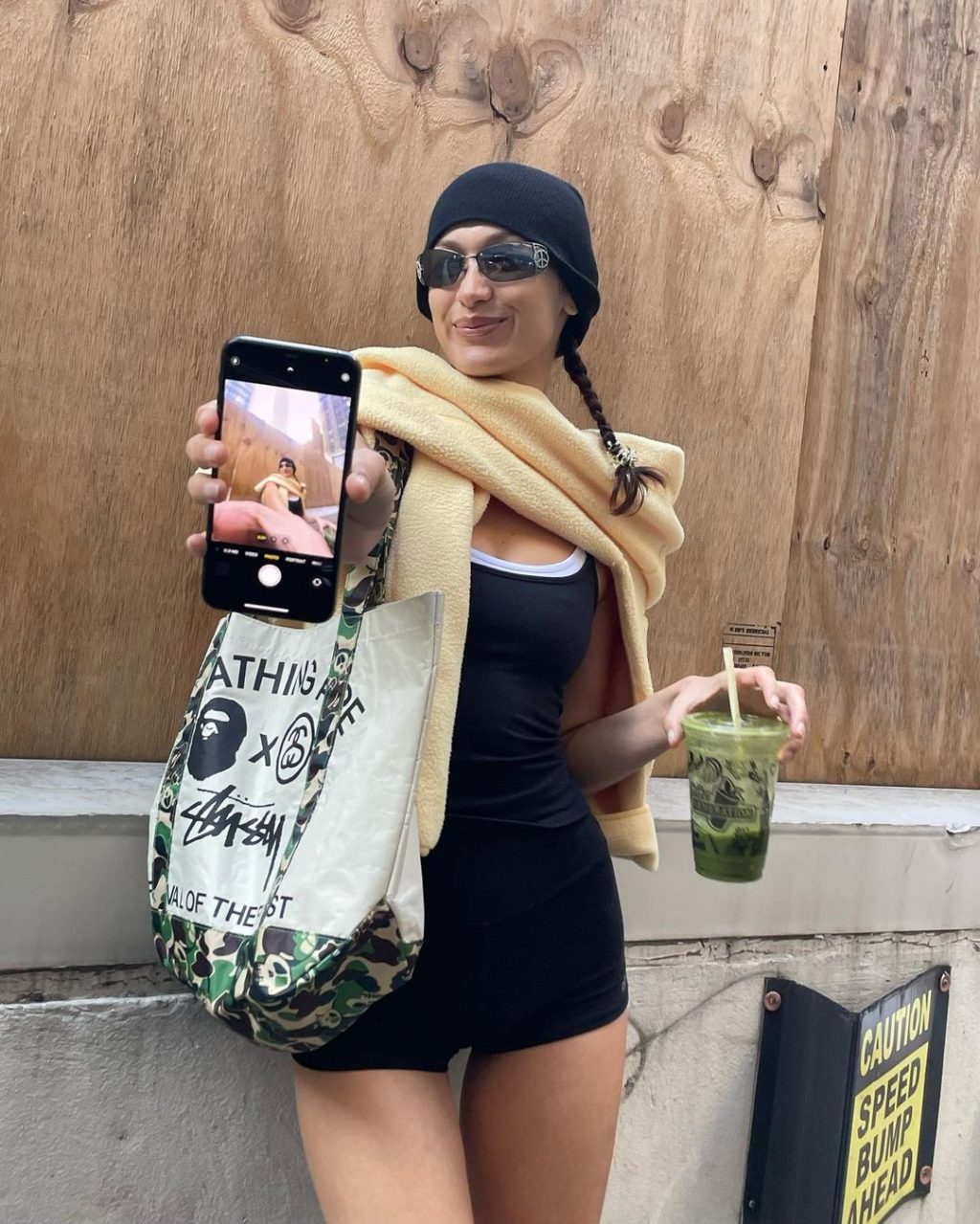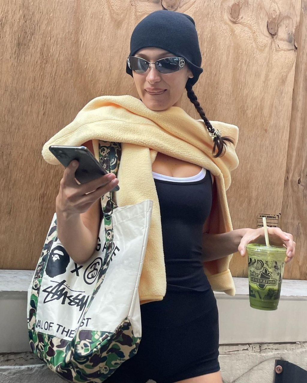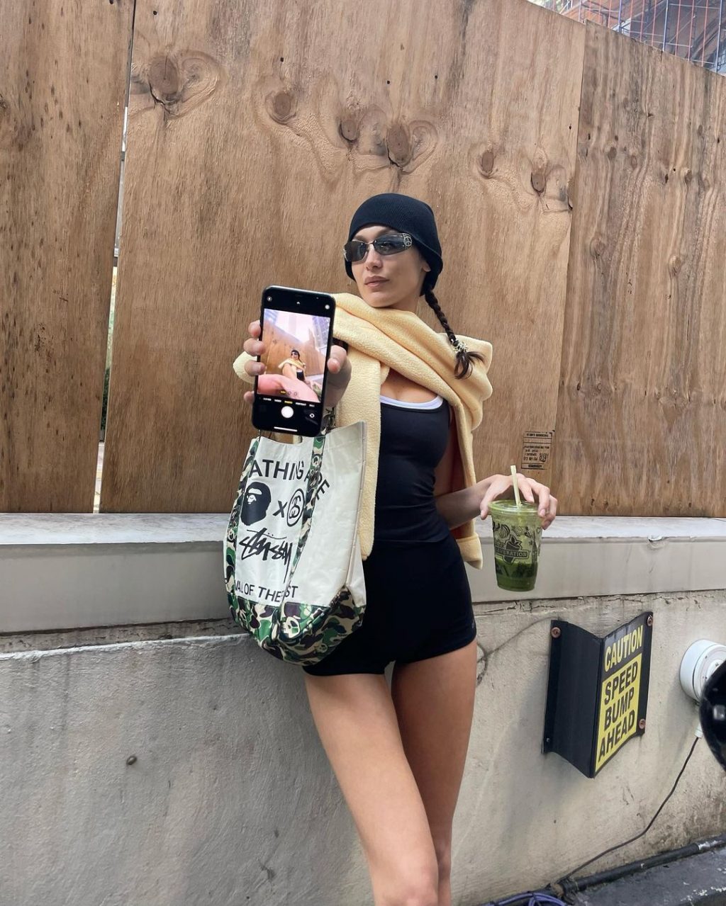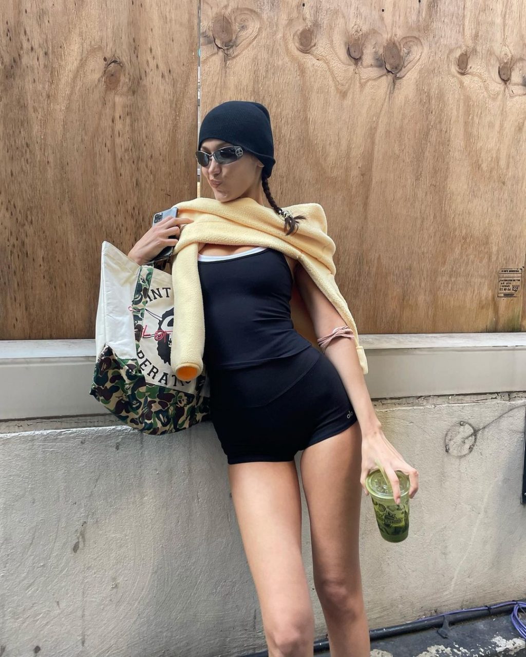 Modella Bella Hadid mostra i suoi seni sexy, la vita sottile e le gambe, posando per il suo account Instagram (2021).