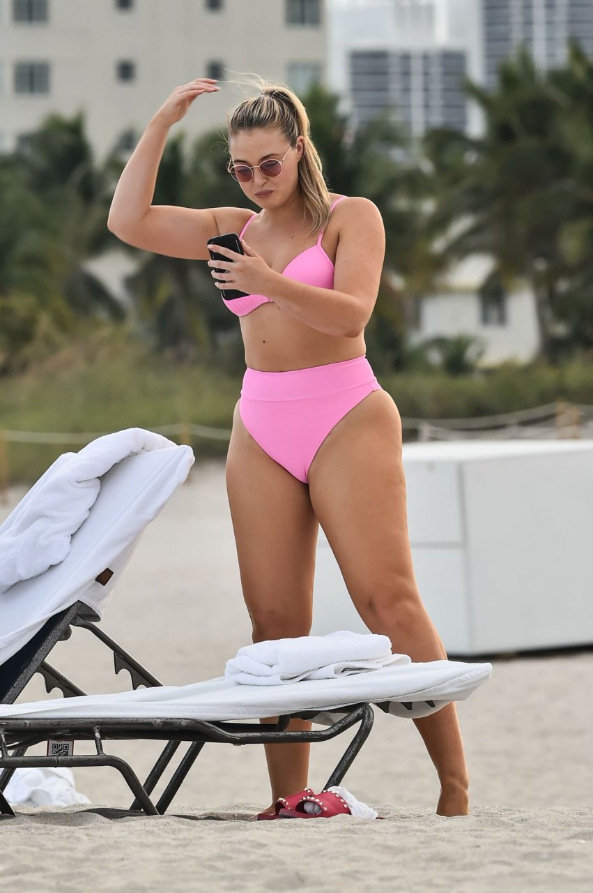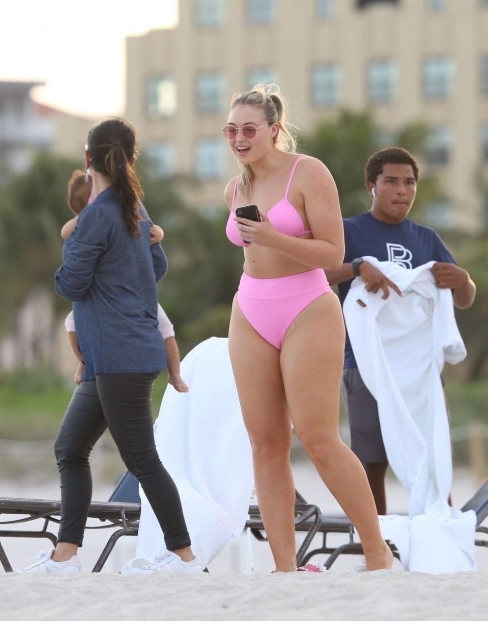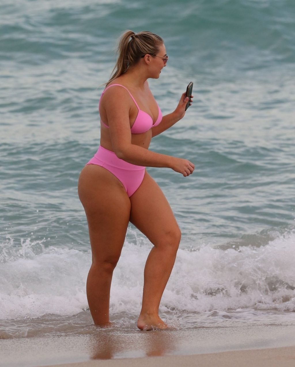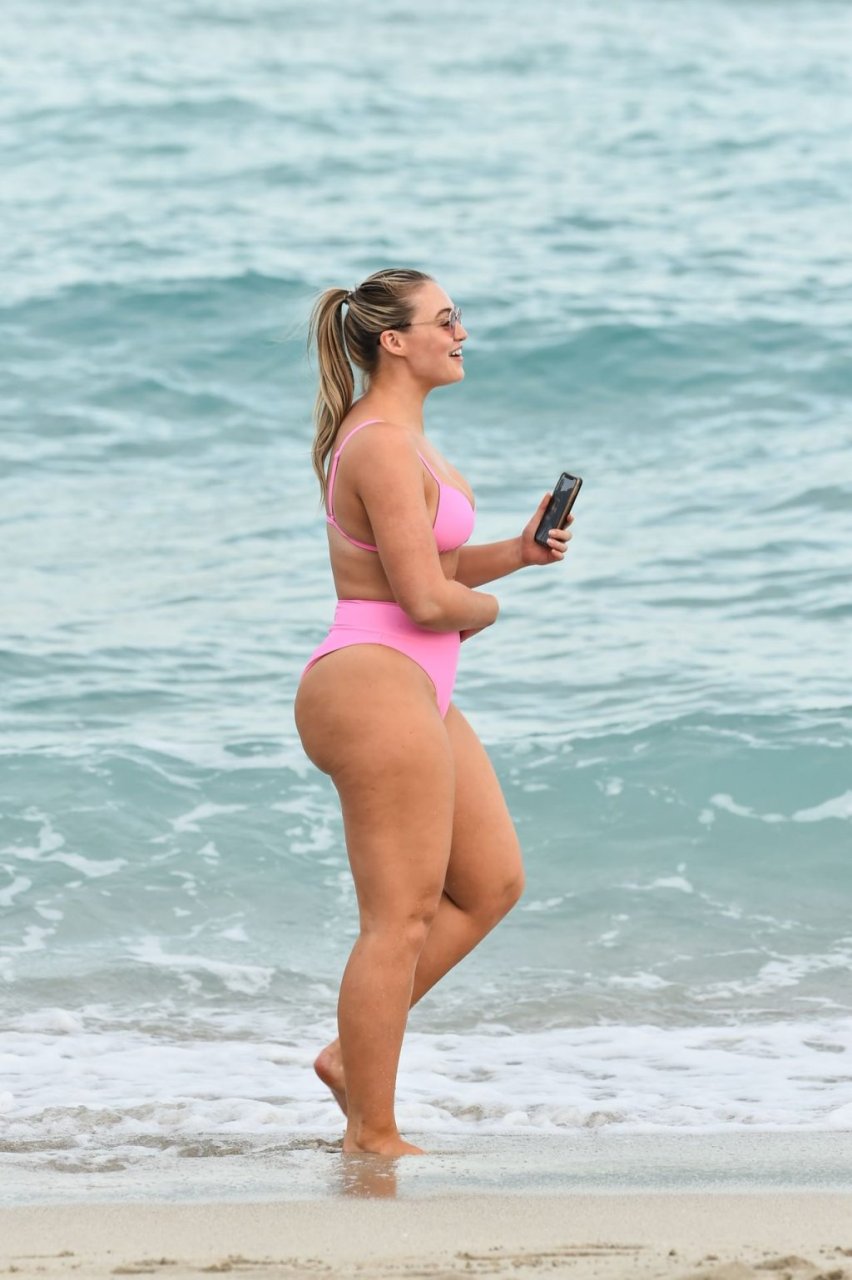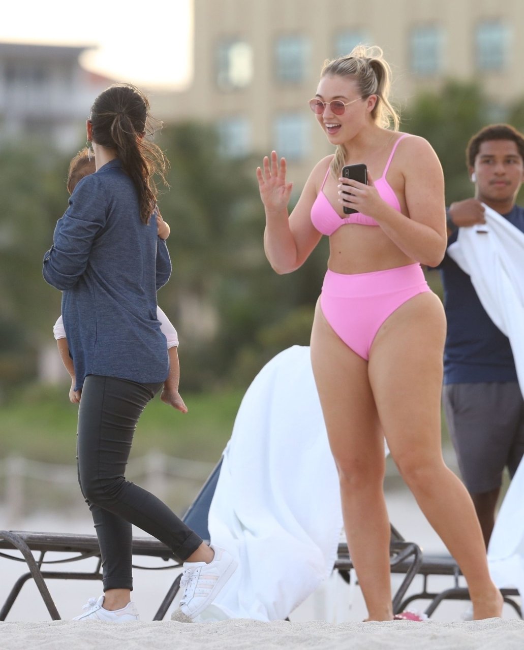 La modella Iskra Lawrence mostra le sue curve in spiaggia con un bikini rosa a Miami, 12/09/2018. Iskra è splendida mentre si gode la sua giornata in spiaggia.