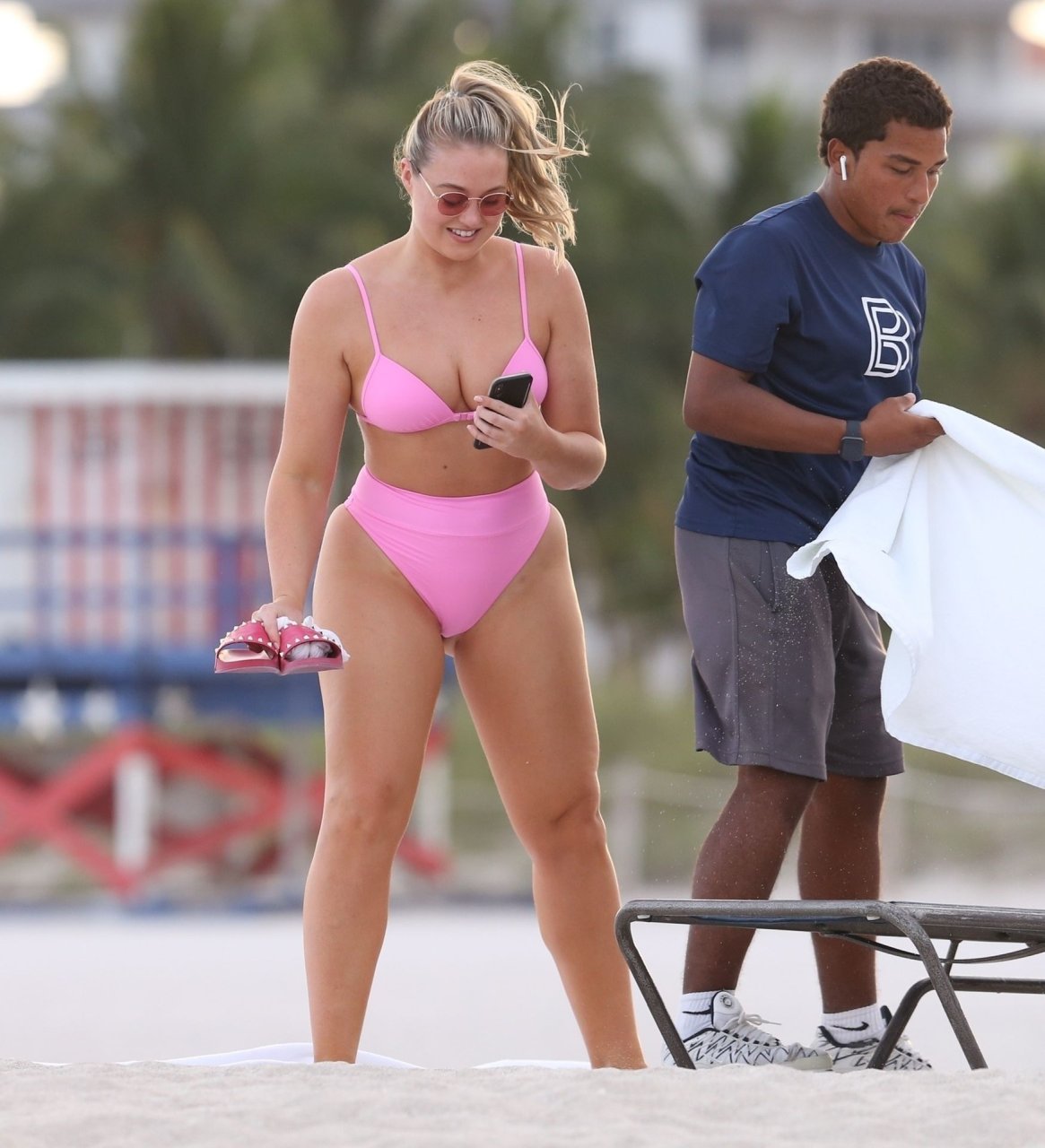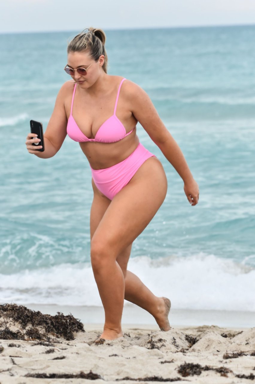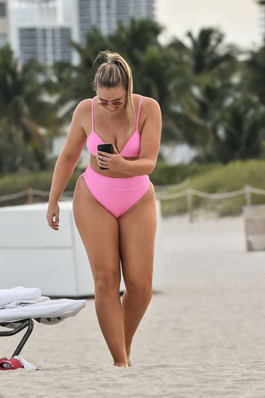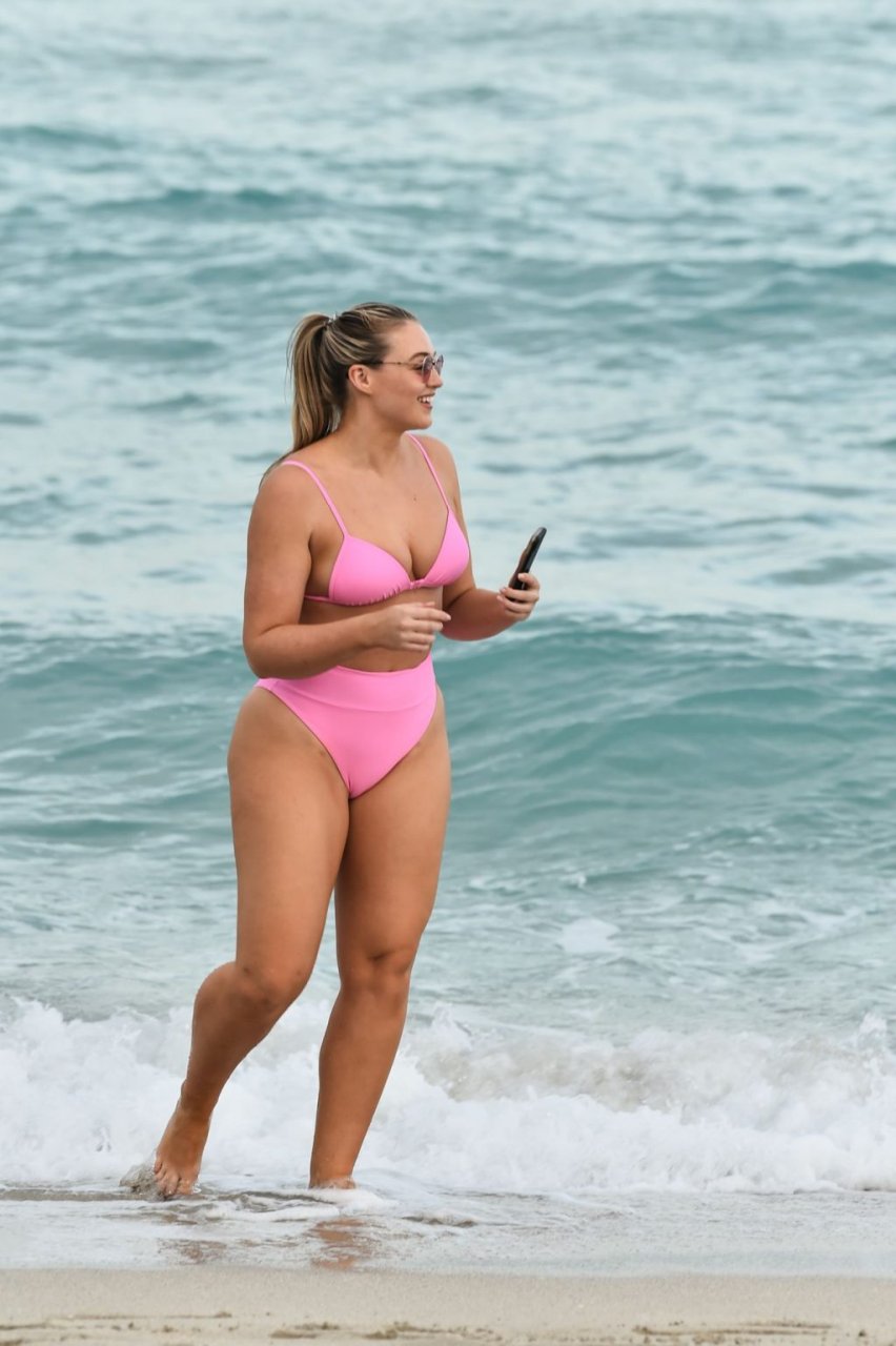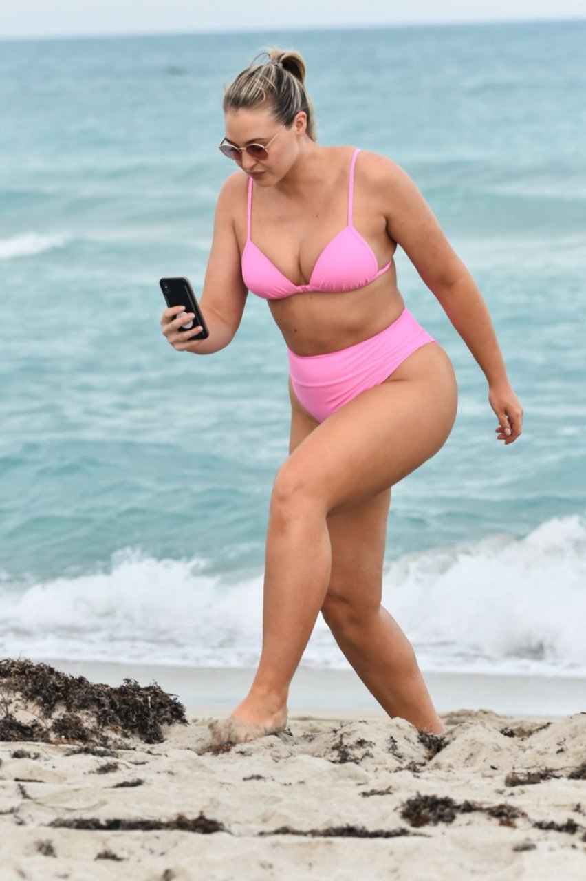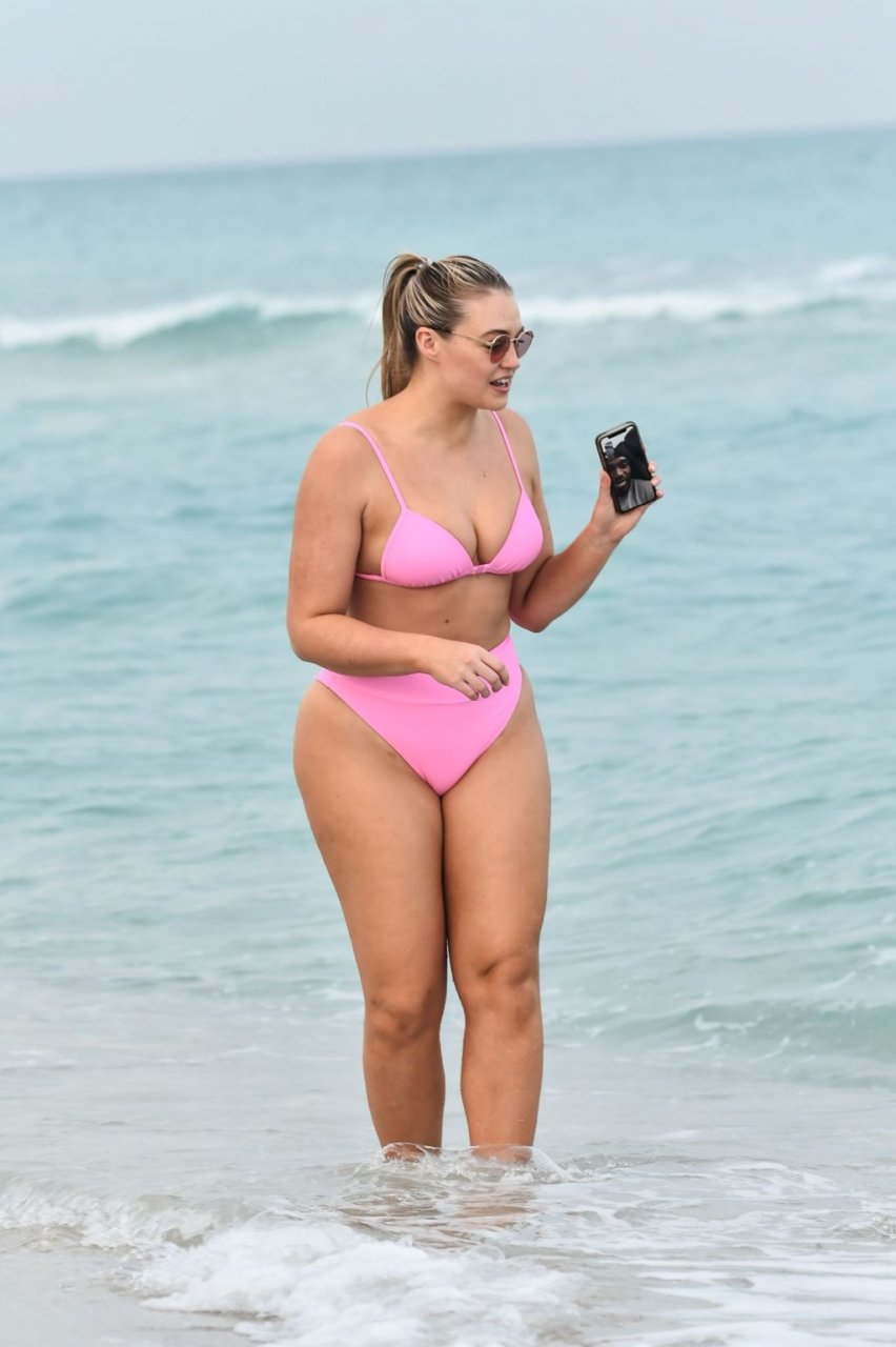 La modella Iskra Lawrence mostra le sue curve in spiaggia con un bikini rosa a Miami, 12/09/2018. Iskra è splendida mentre si gode la sua giornata in spiaggia.