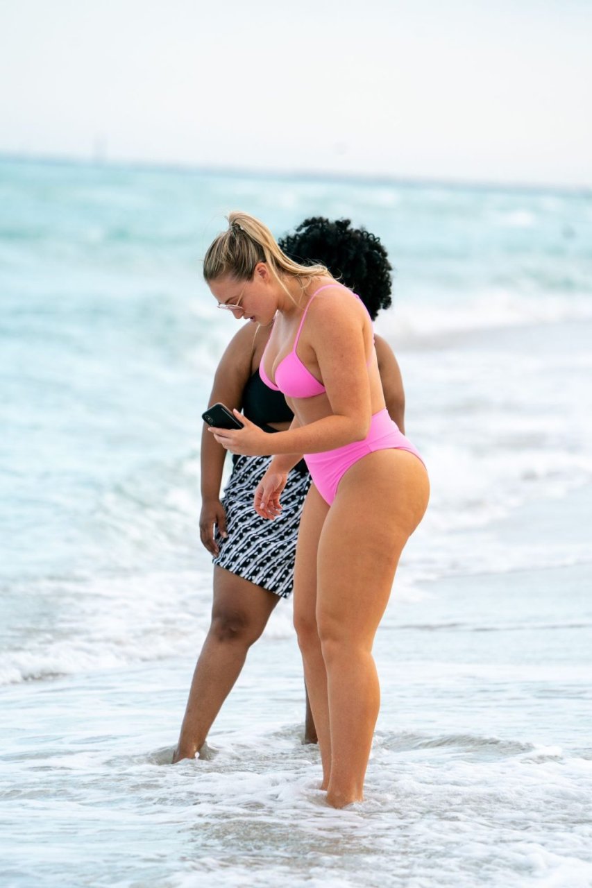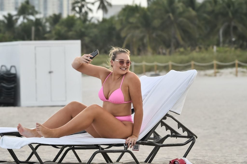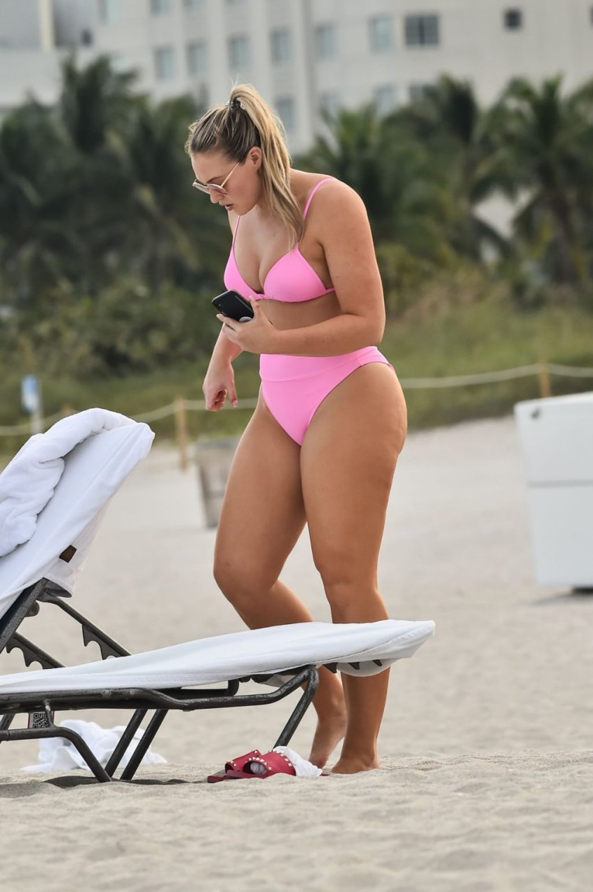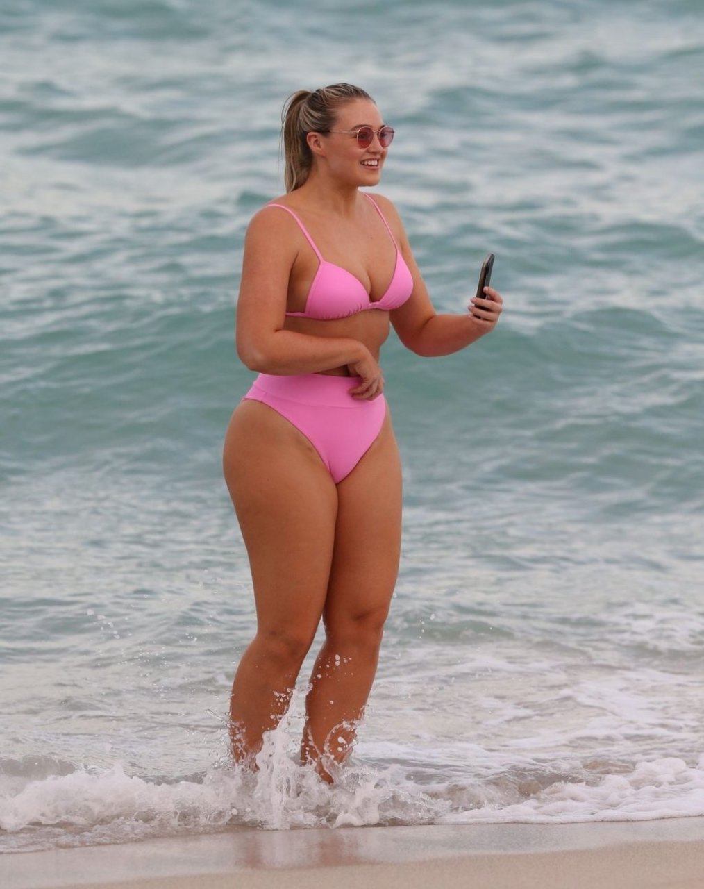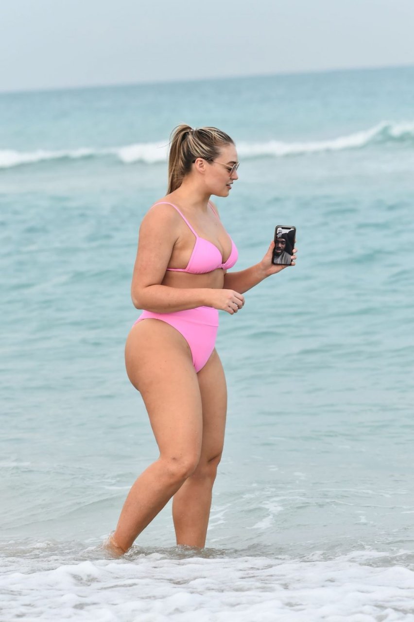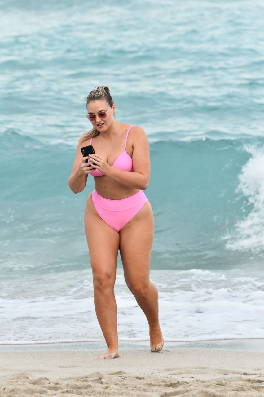 La modella Iskra Lawrence mostra le sue curve in spiaggia con un bikini rosa a Miami, 12/09/2018. Iskra è splendida mentre si gode la sua giornata in spiaggia.