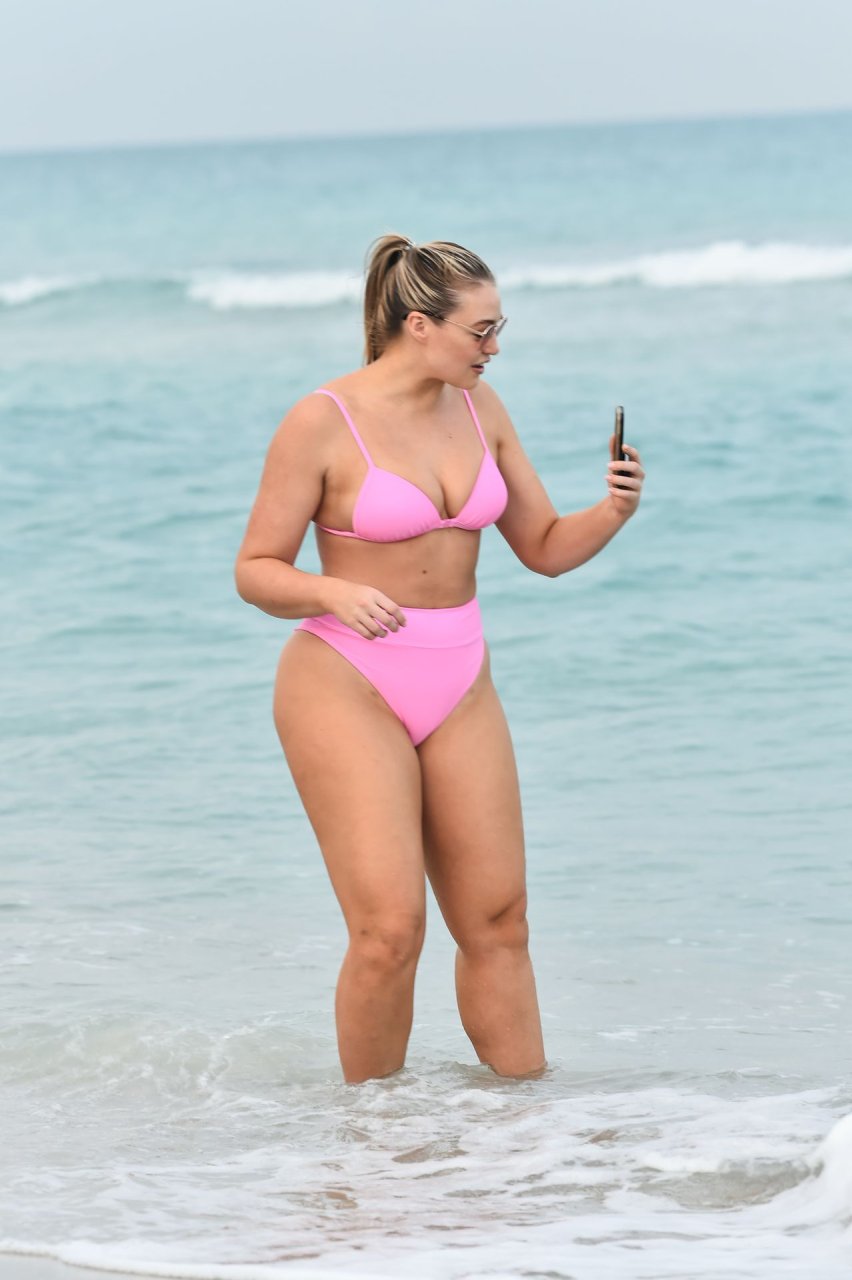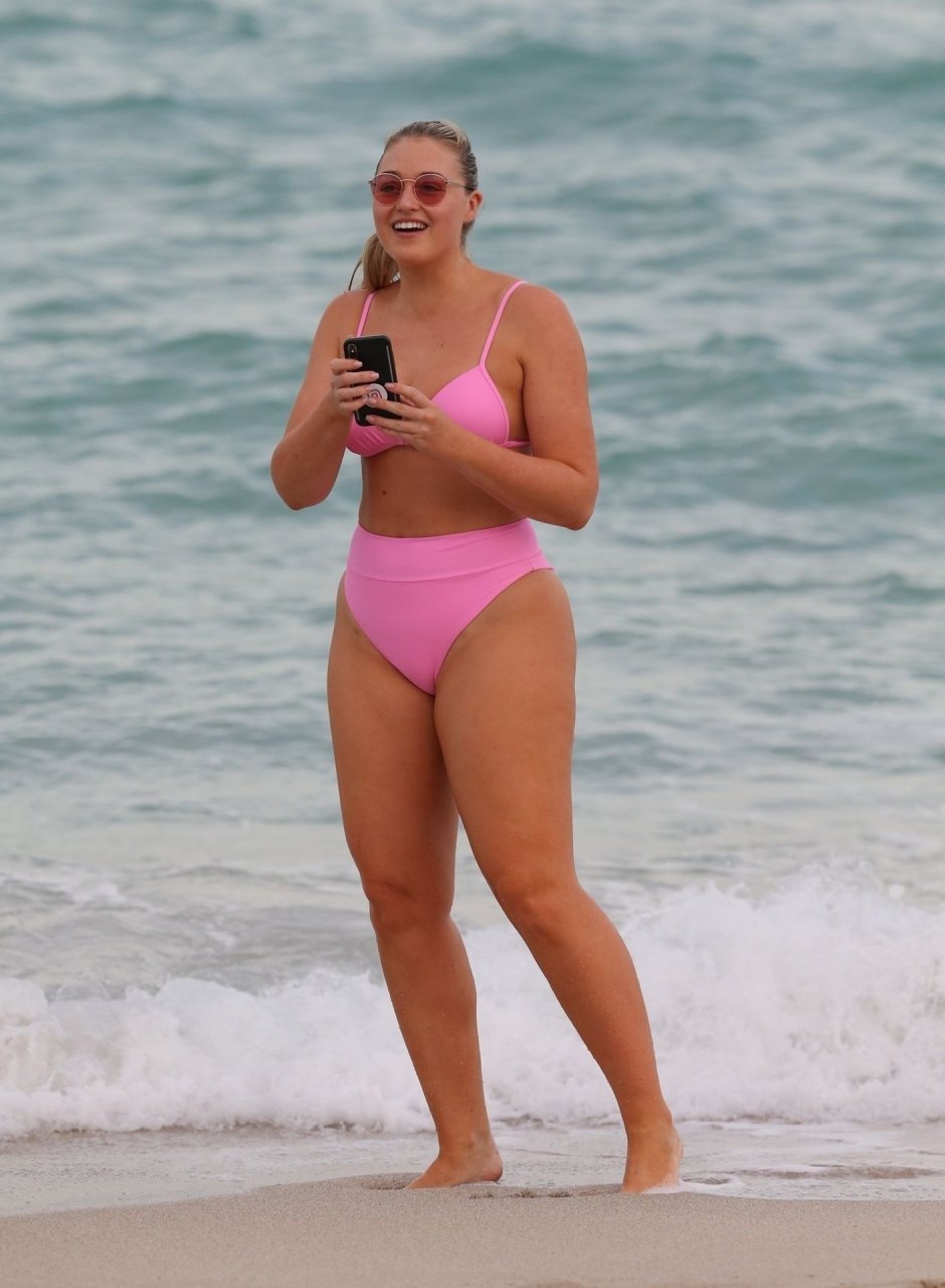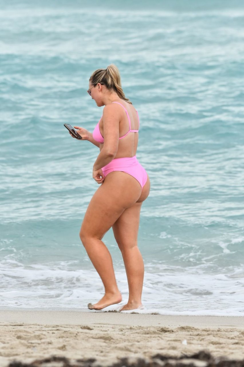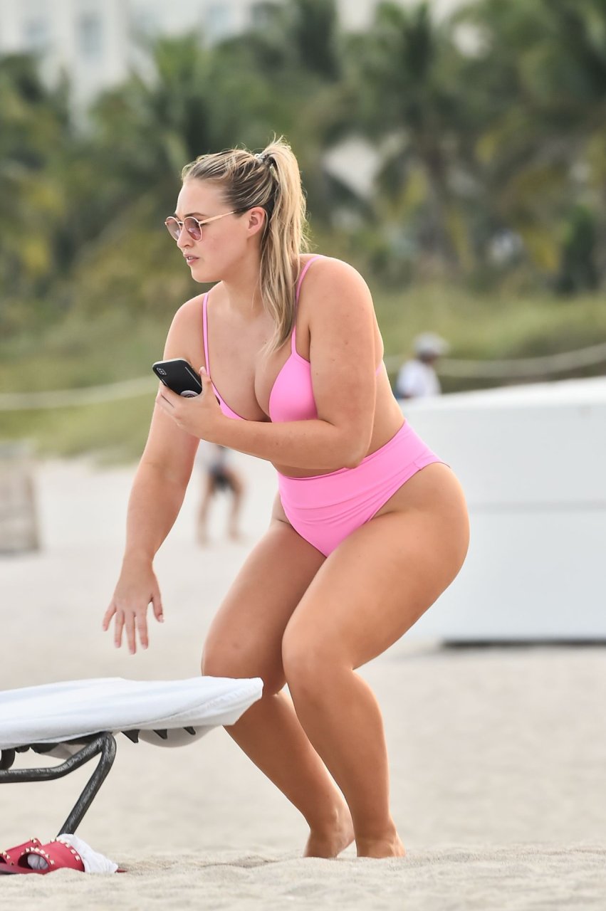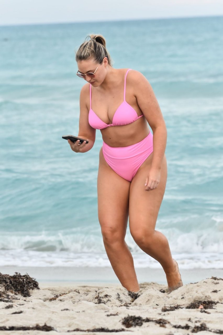 La modella Iskra Lawrence mostra le sue curve in spiaggia con un bikini rosa a Miami, 12/09/2018. Iskra è splendida mentre si gode la sua giornata in spiaggia.