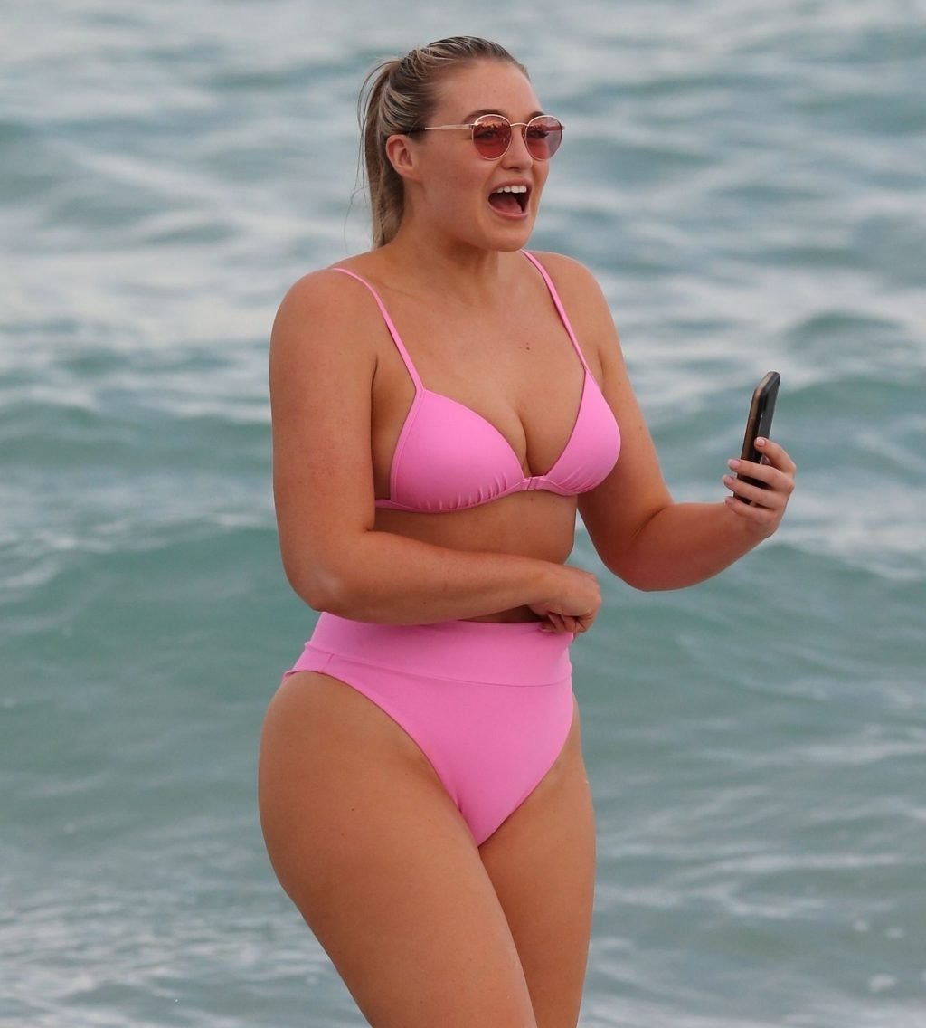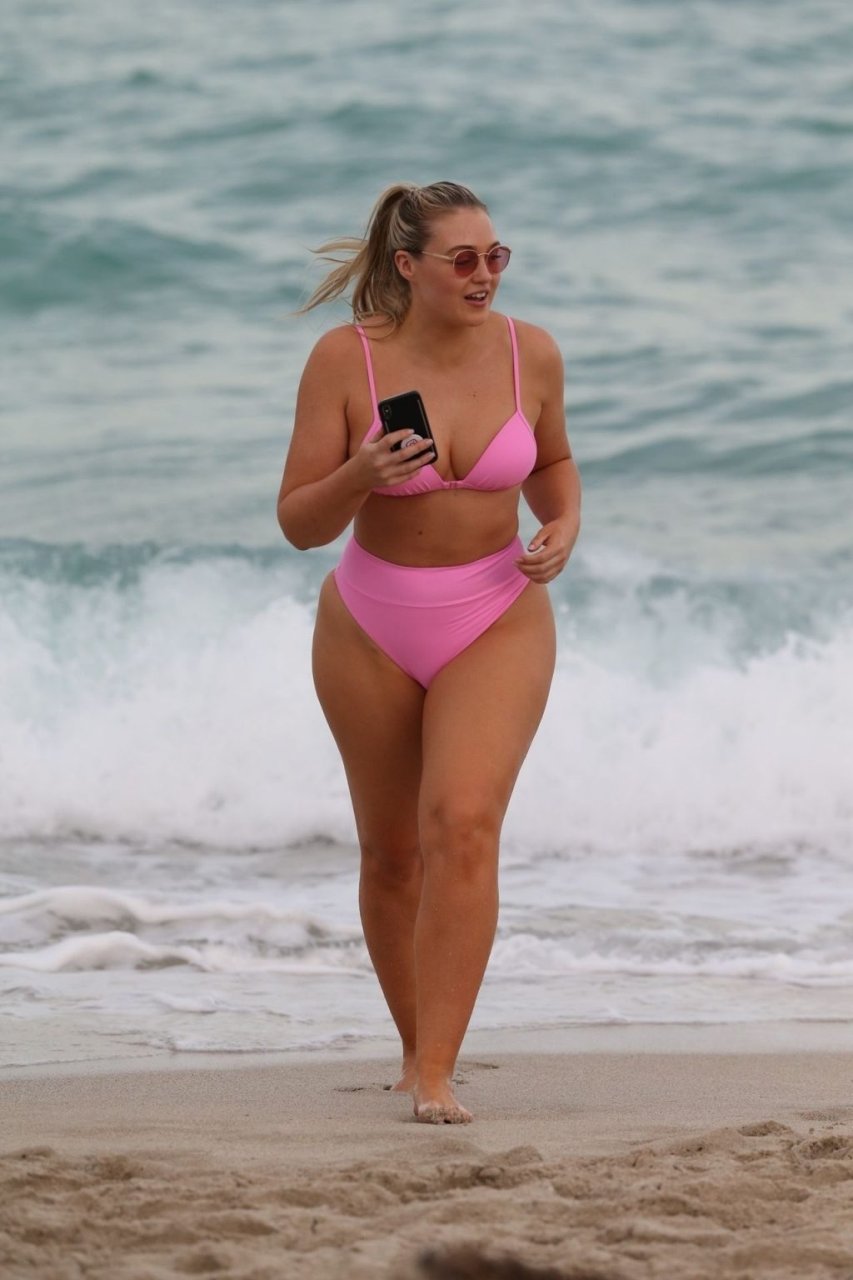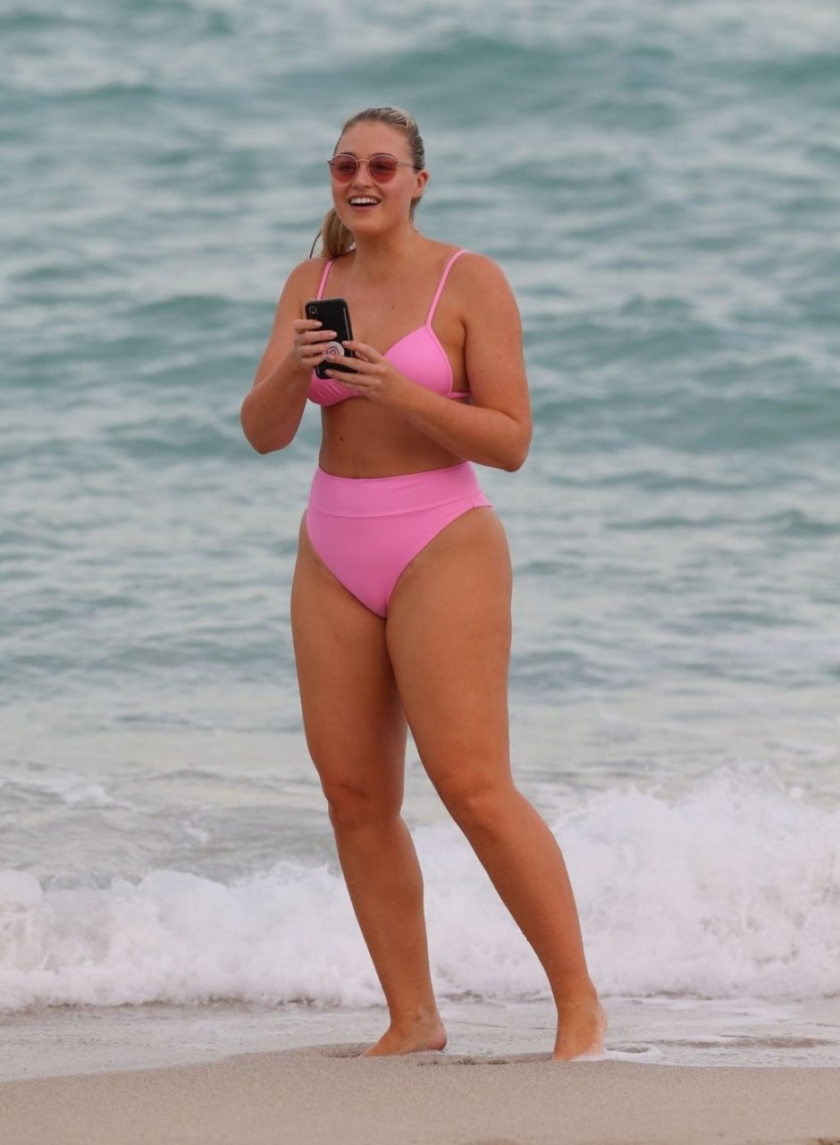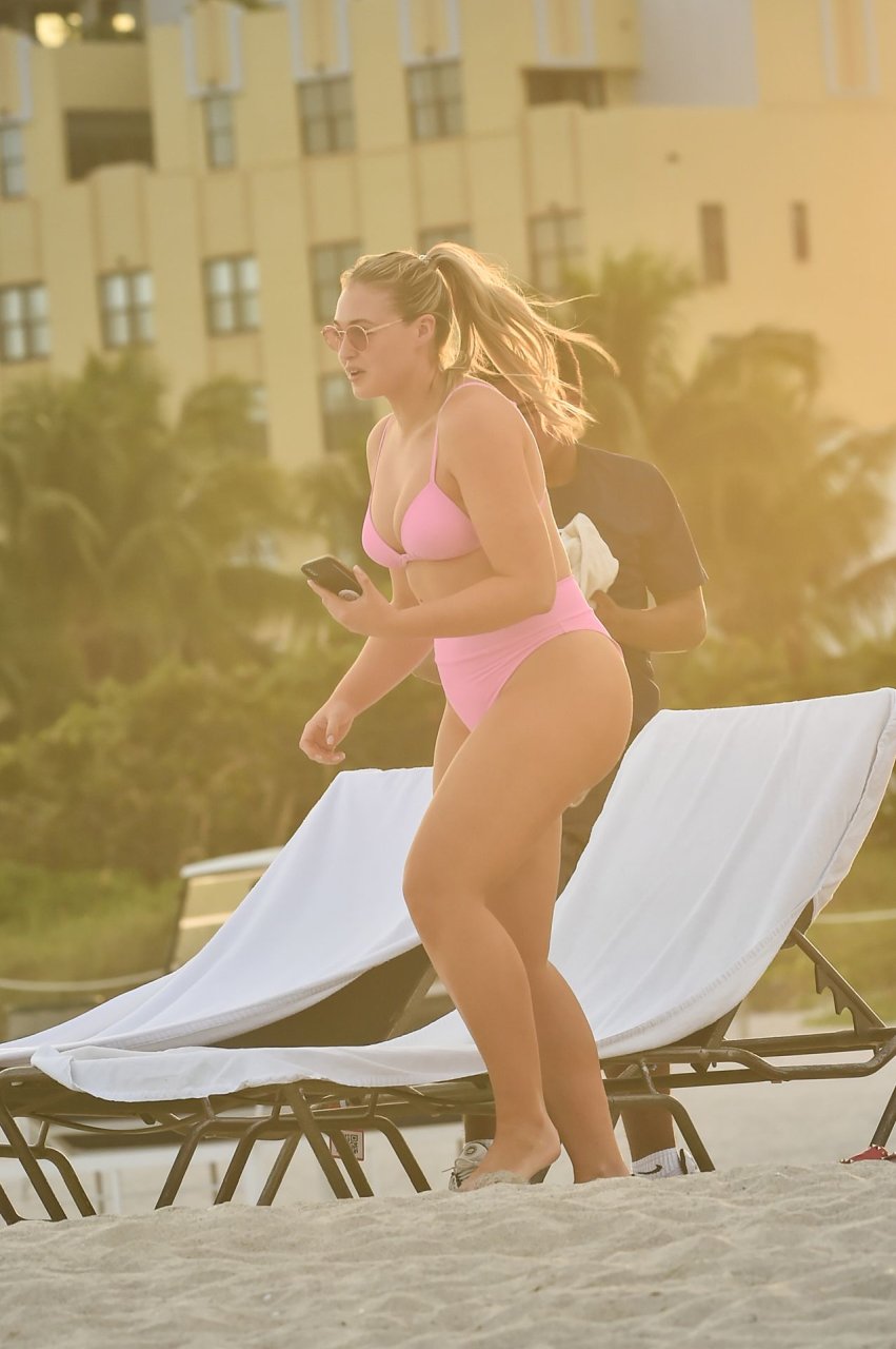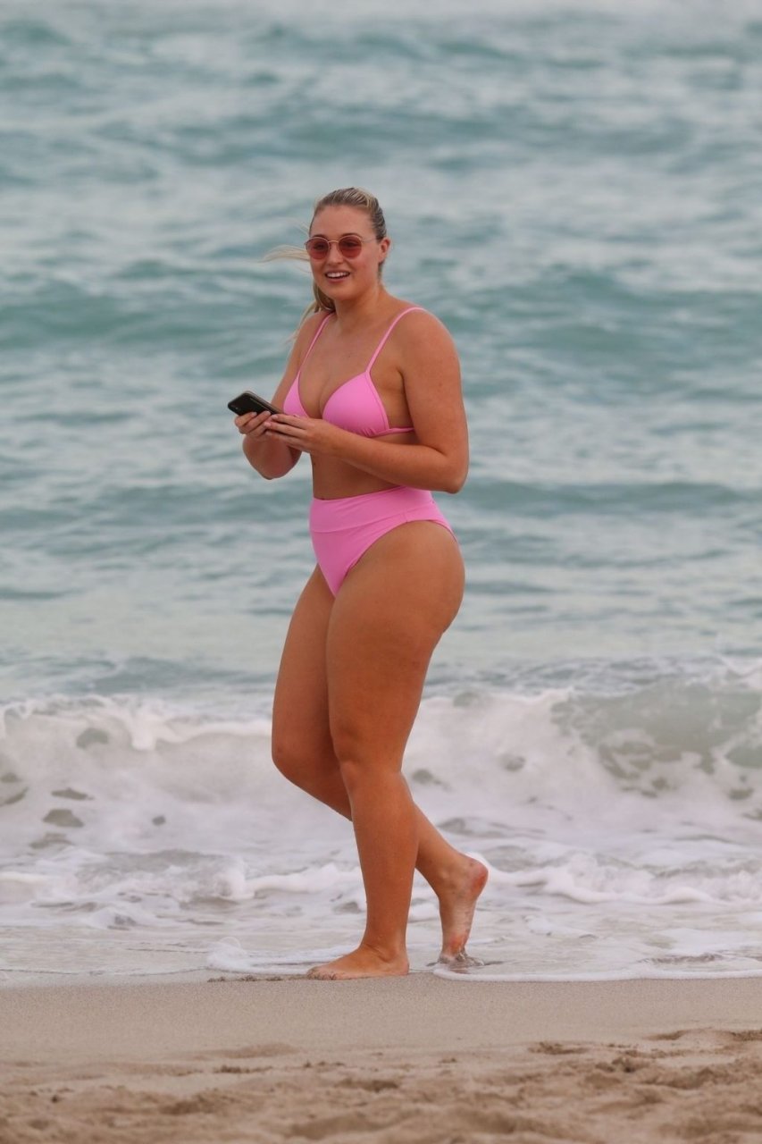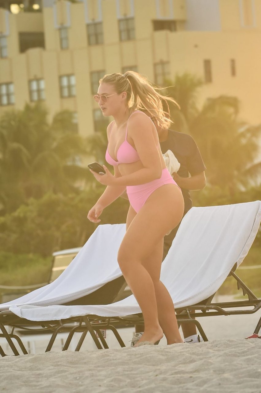 La modella Iskra Lawrence mostra le sue curve in spiaggia con un bikini rosa a Miami, 12/09/2018. Iskra è splendida mentre si gode la sua giornata in spiaggia.