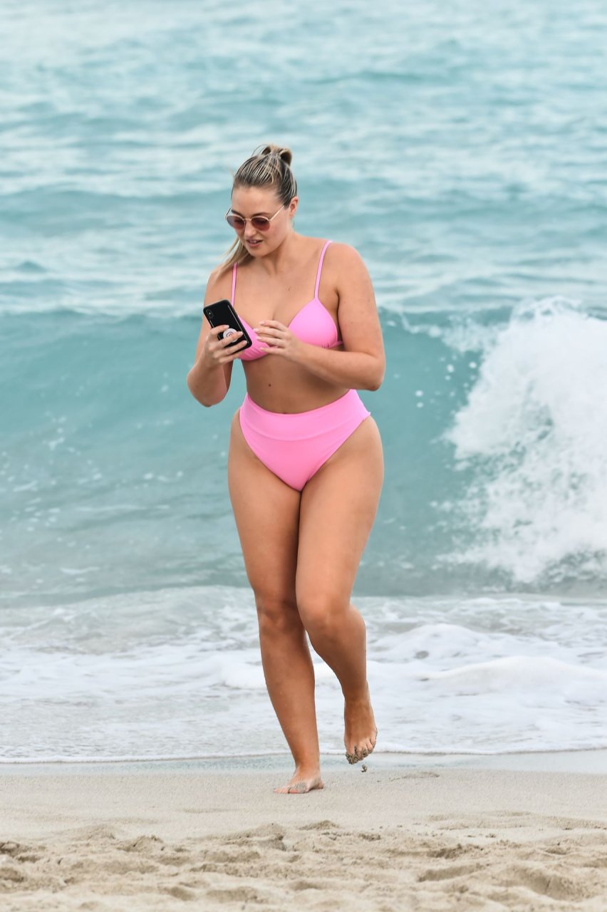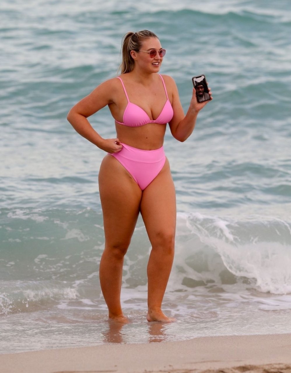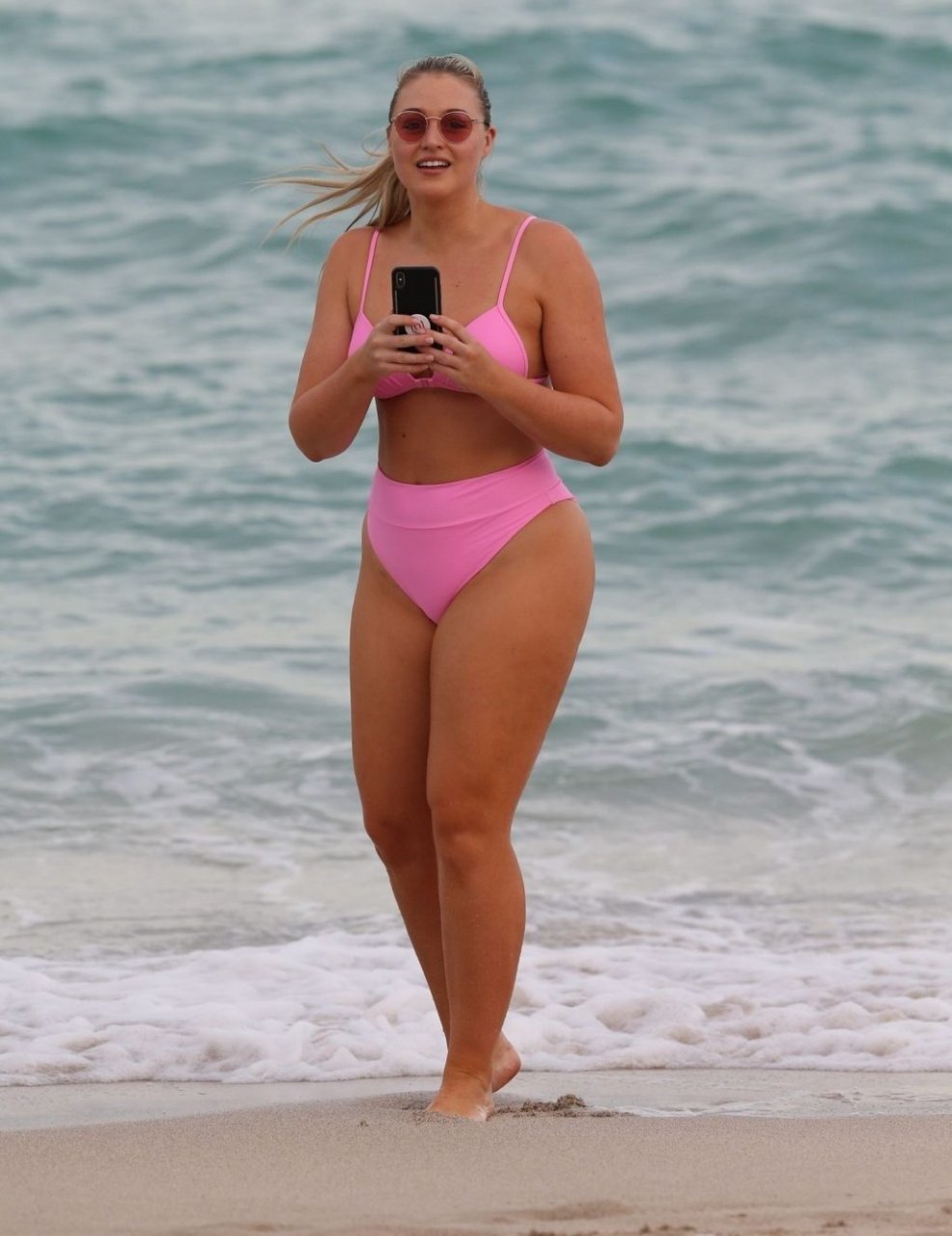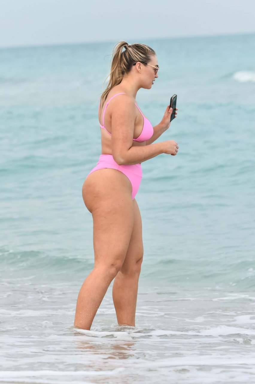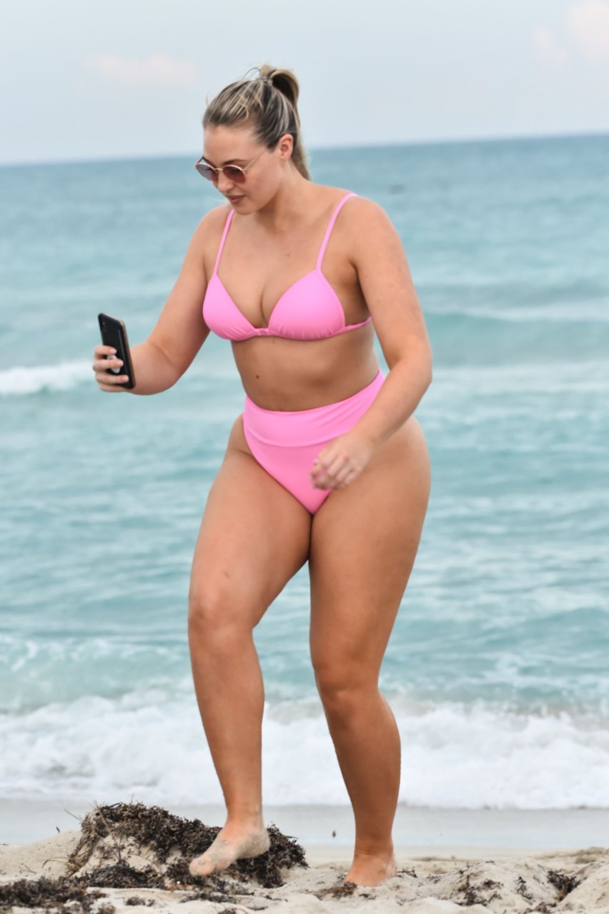 La modella Iskra Lawrence mostra le sue curve in spiaggia con un bikini rosa a Miami, 12/09/2018. Iskra è splendida mentre si gode la sua giornata in spiaggia.