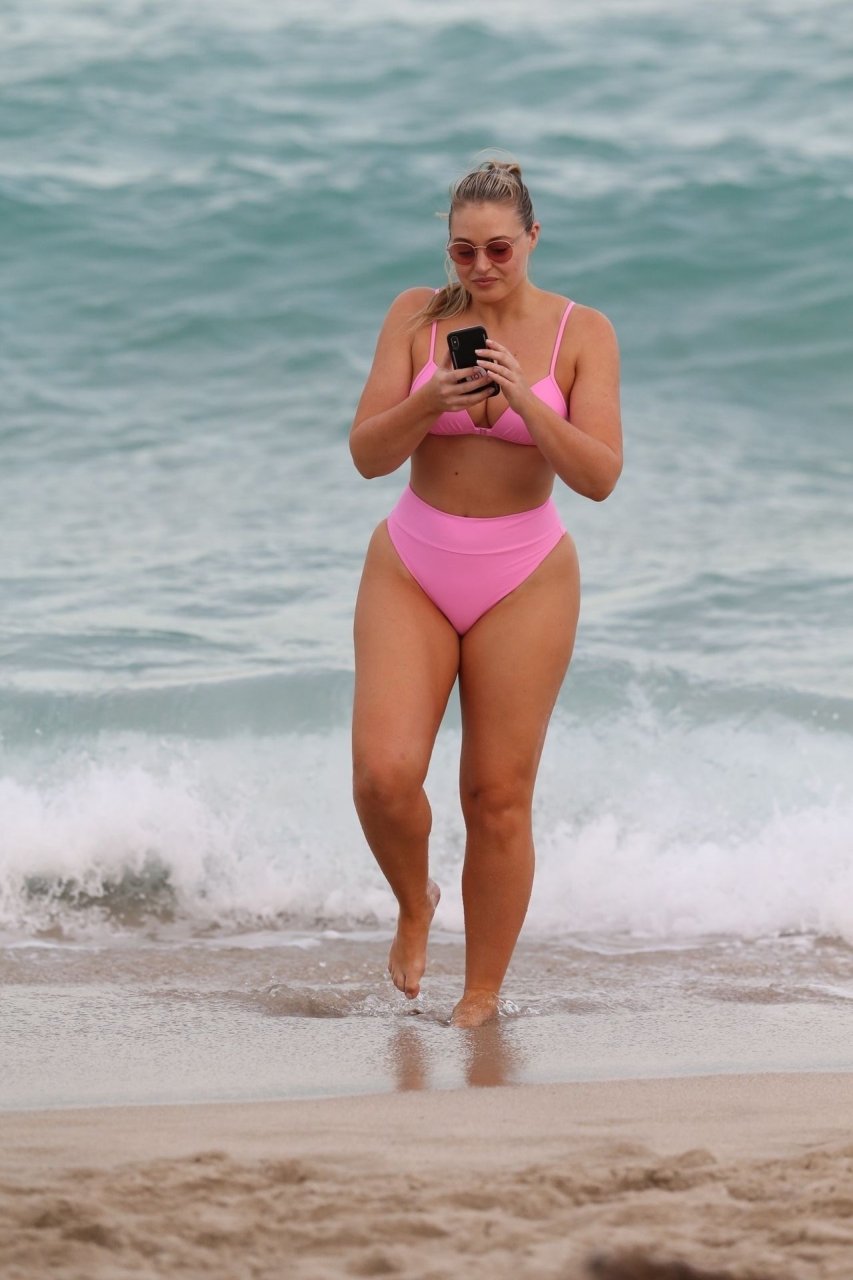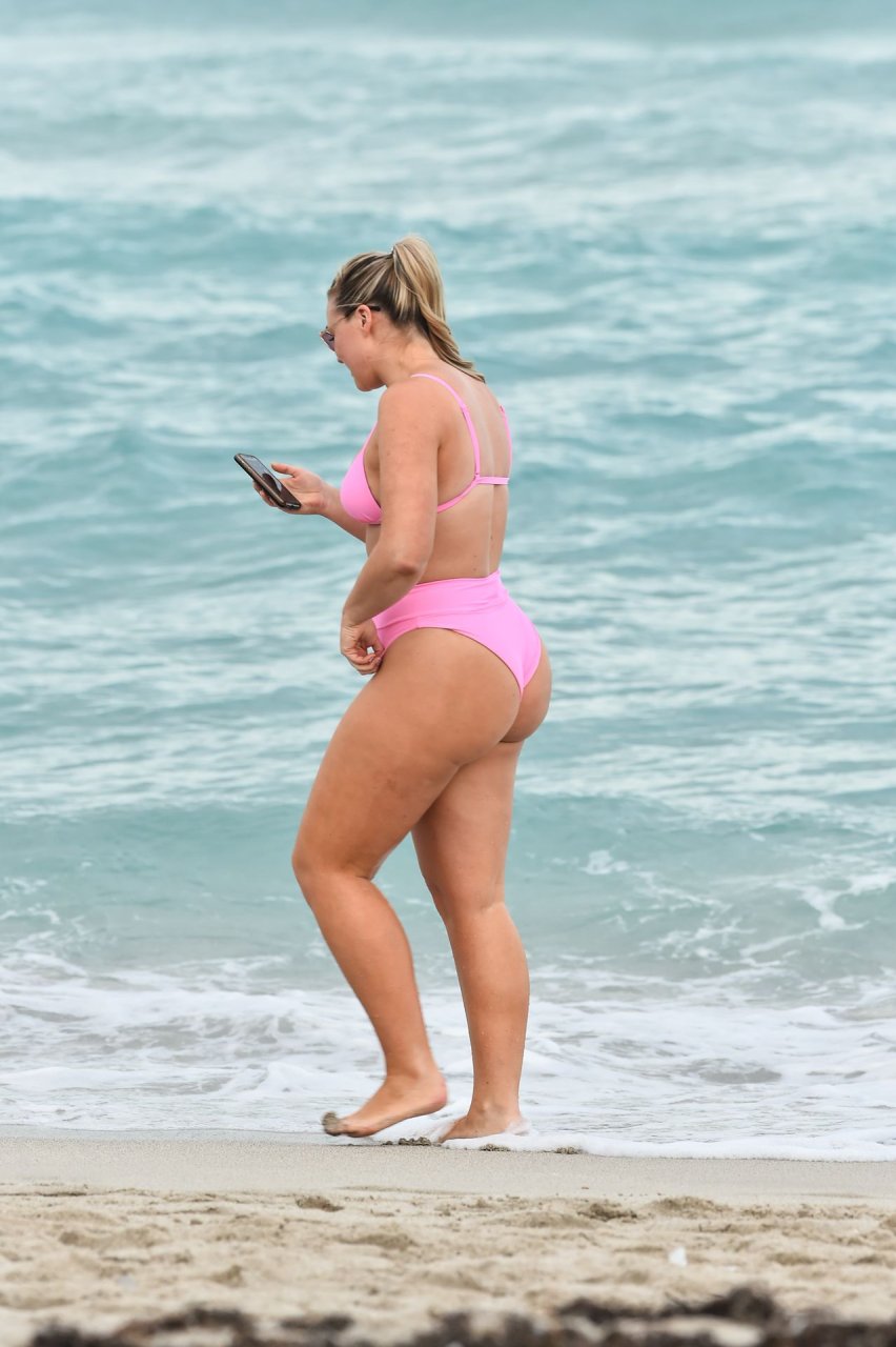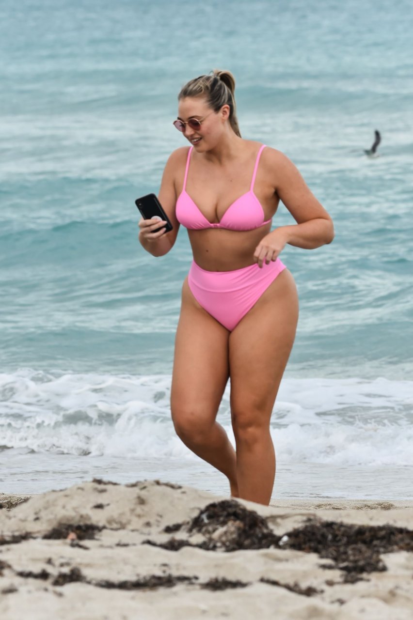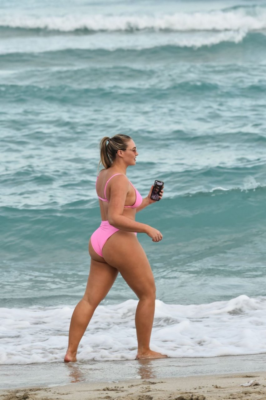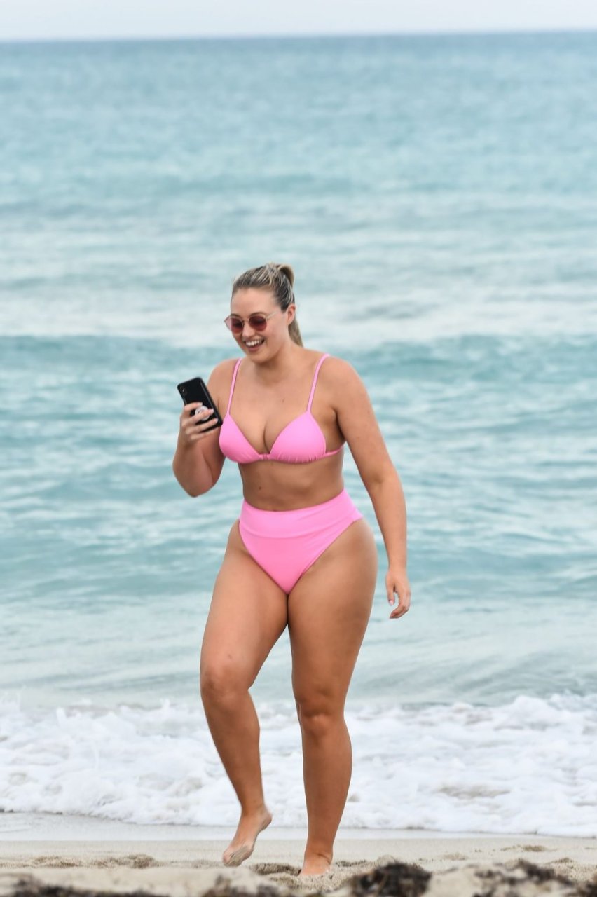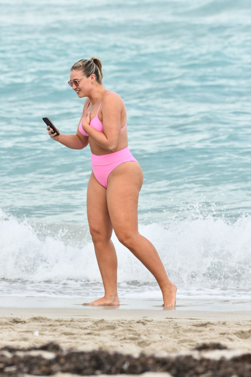 La modella Iskra Lawrence mostra le sue curve in spiaggia con un bikini rosa a Miami, 12/09/2018. Iskra è splendida mentre si gode la sua giornata in spiaggia.