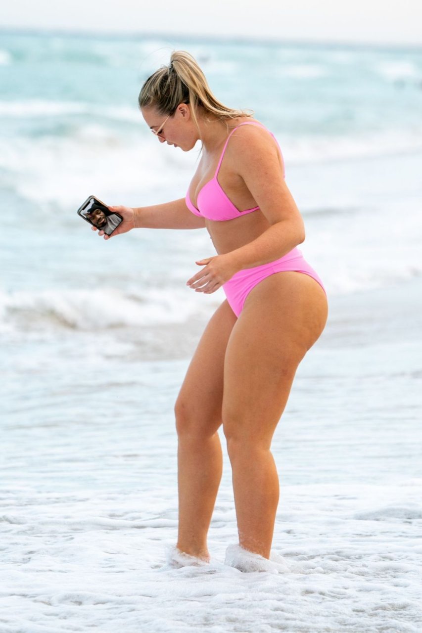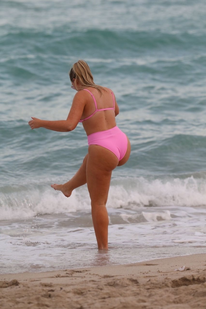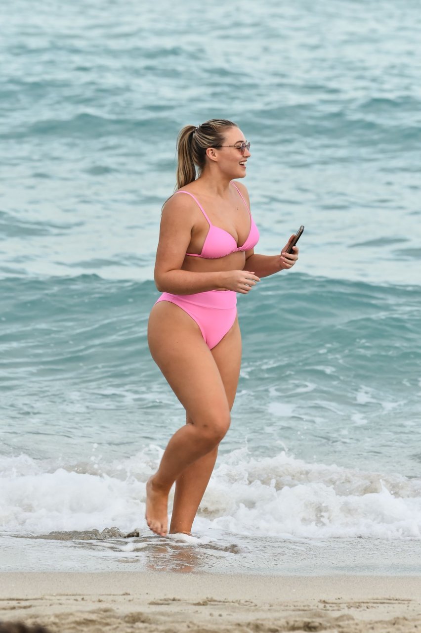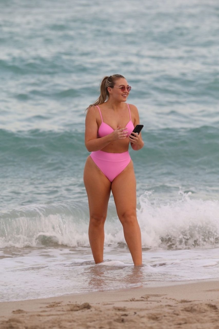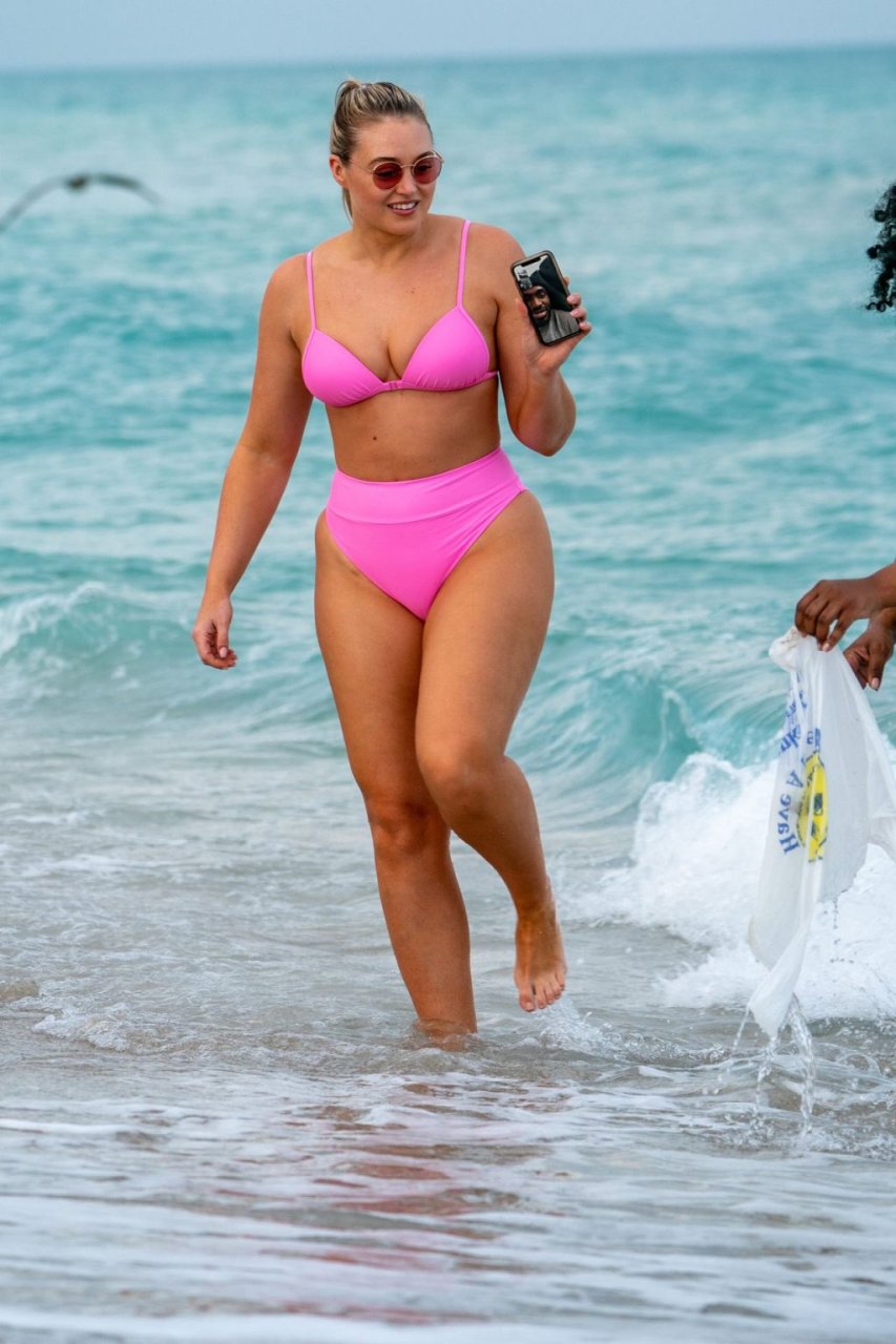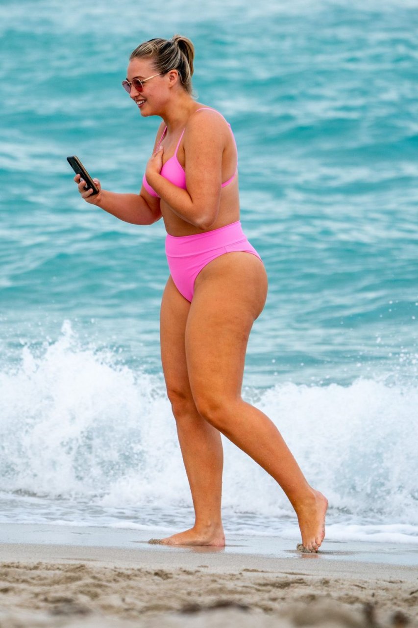 La modella Iskra Lawrence mostra le sue curve in spiaggia con un bikini rosa a Miami, 12/09/2018. Iskra è splendida mentre si gode la sua giornata in spiaggia.