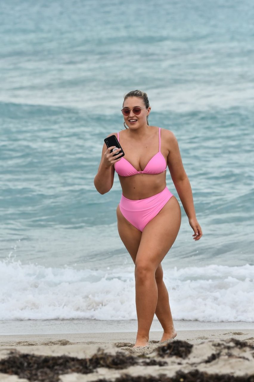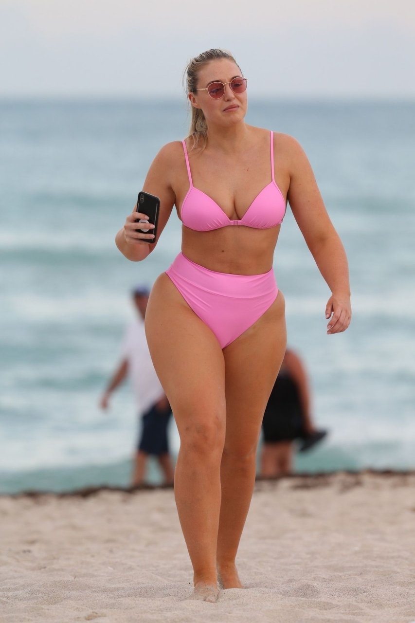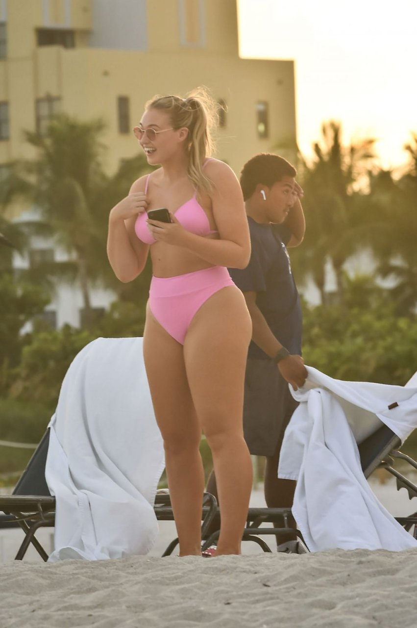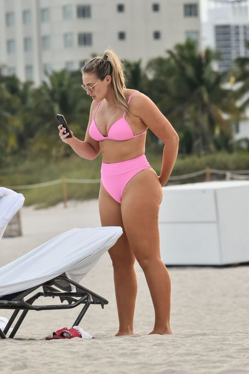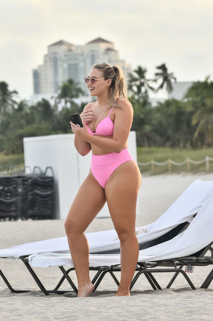 La modella Iskra Lawrence mostra le sue curve in spiaggia con un bikini rosa a Miami, 12/09/2018. Iskra è splendida mentre si gode la sua giornata in spiaggia.