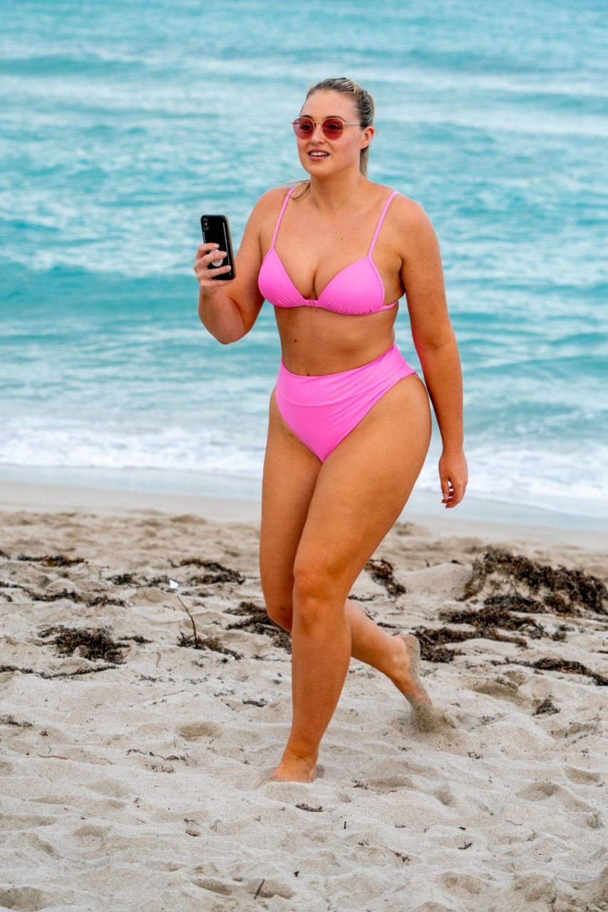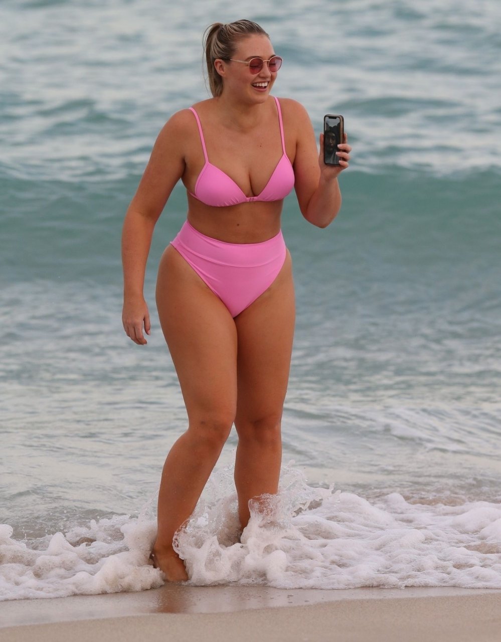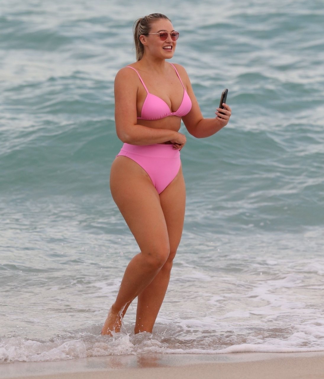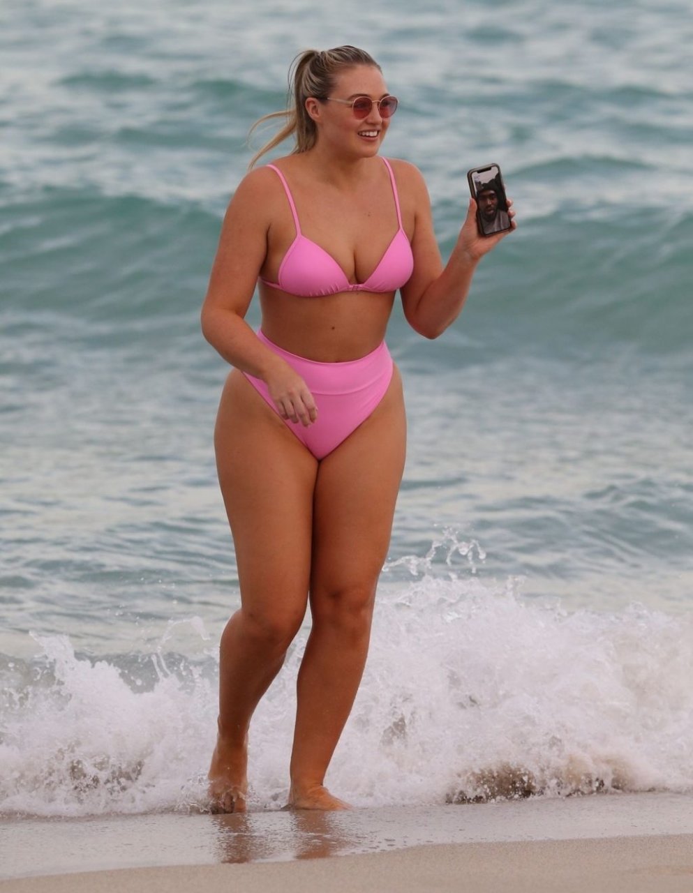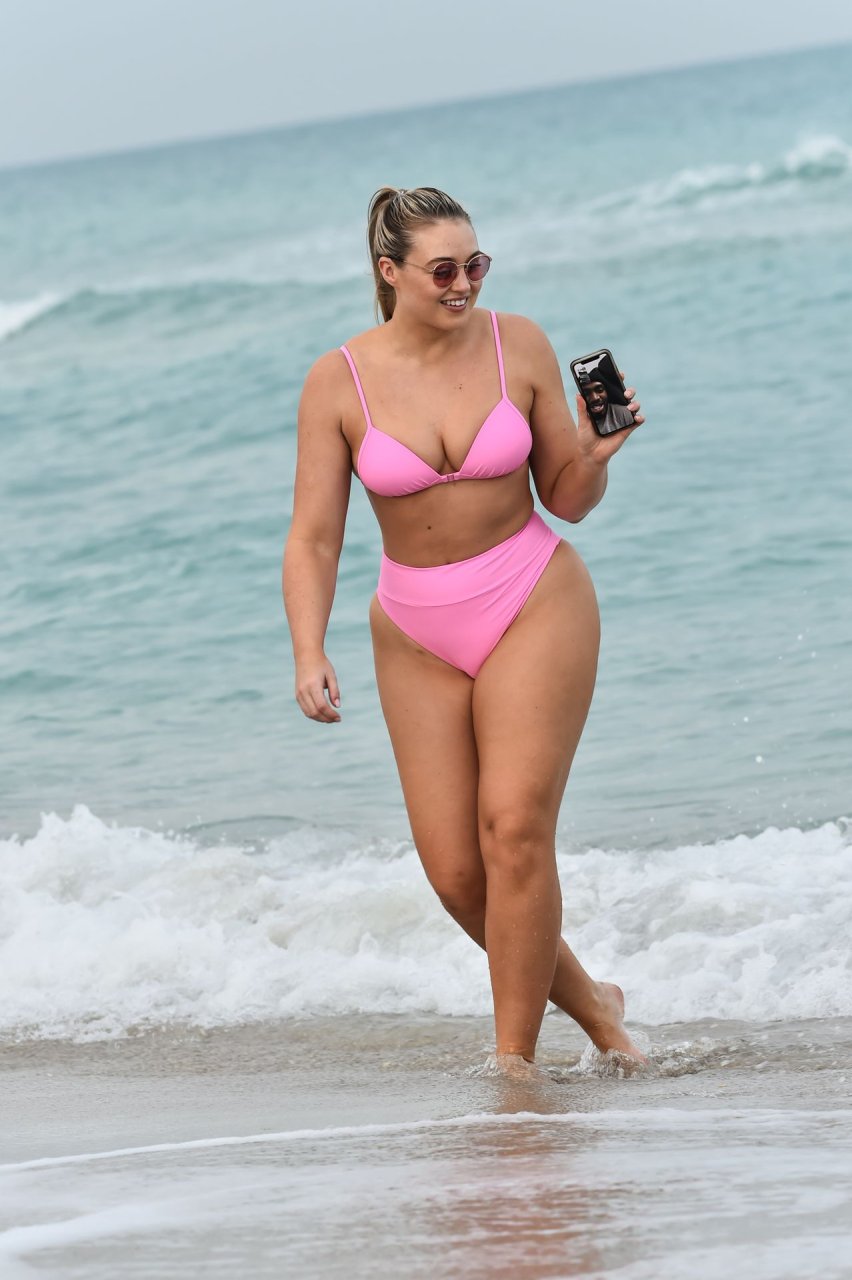 La modella Iskra Lawrence mostra le sue curve in spiaggia con un bikini rosa a Miami, 12/09/2018. Iskra è splendida mentre si gode la sua giornata in spiaggia.